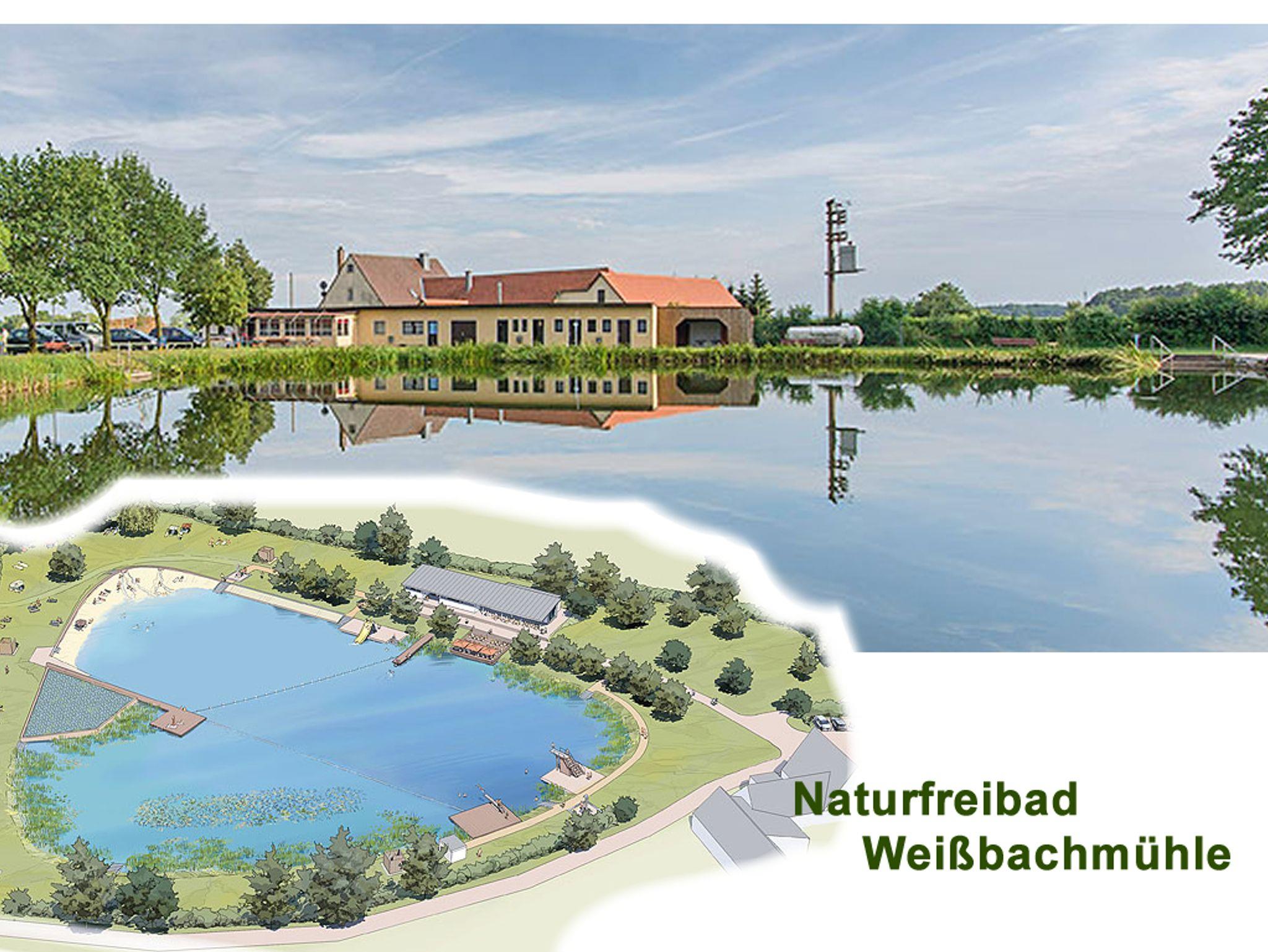 etwa 600 m außerhalb von Merkendorf umrahmt von grünen Wiesen ist das Freizeitzentrum - Naturfreibad Weißbachmühle“