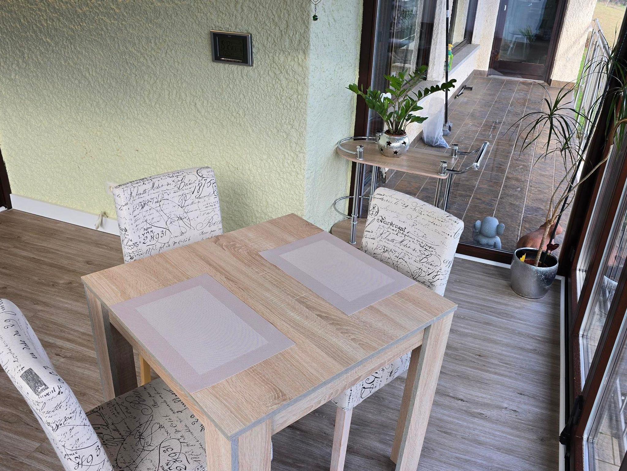Im offenen Esszimmer, ist an dem großen Tisch bis zu 6 Personen ausreichend Platz.