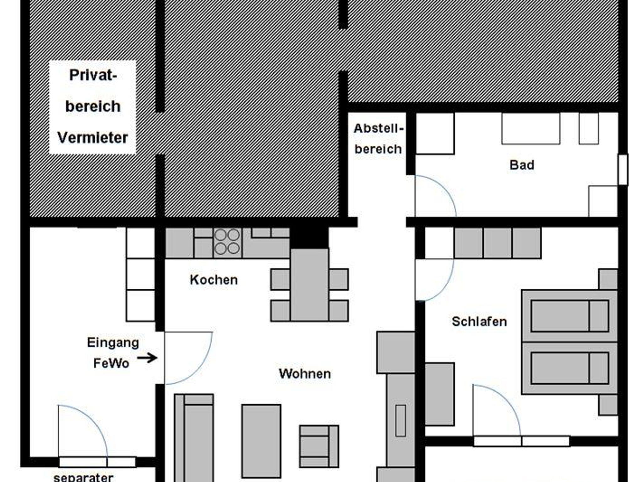 Die ruhig gelegene Ferienwohnung (50 qm) verfügt über ein Schlafzimmer mit Dopppelbett (Bettwäsche ist vorhanden). Außerdem finden Sie einen großen Wohnraum mit komplett ausgestatter Küchenzeile (Backofen, Spülmaschine, Kühlschrank, Mikrowelle) und Schlafsofa sowie Sat-TV, CD-Player und einer Essgelegenheit. Das Badezimmer ist mit einer Dusche und einem WC ausgestattet, außerdem finden Sie vor Ort Handtücher und einen Fön. Im Außenbereich können Sie die überdachte Terrasse genießen und die Grünfläche als Liegefläche und Spielwiese nutzen. Zusätzliche Ausstattung: Waschmaschine, Bügeleisen, Bügelbrett Wireless DSL, Spielzeug. Einen Hochstuhl und Kinderbett erhalten Sie auf auf Anfrage. Internetzugang möglich. Haustiere sind erlaubt gegen eine Gebühr von 10 EUR pro Tier/Nacht.