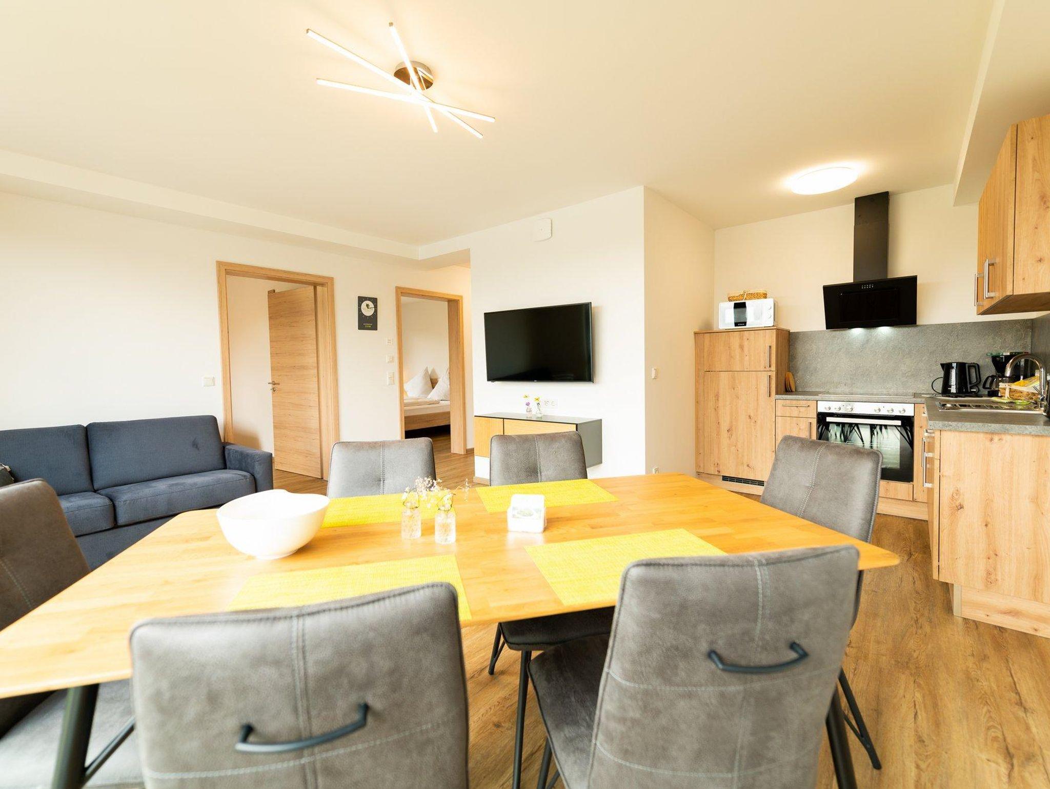 Die geräumigen Appartements für bis zu 6 Personen bieten einen gemütlichen Wohn- und Essbereich im Loft Stil: im offenen Wohnbereich finden Sie ein bequemes Sofa, eine voll ausgestattete Küche und einen freundlichen Essbereich mit viel Platz zum Zusammensitzen. Die Schlafzimmer mit komfortablem Doppelbett sorgen am Ende des Tages für Erholung, das moderne Badezimmer bietet eine entspannende Regendusche.