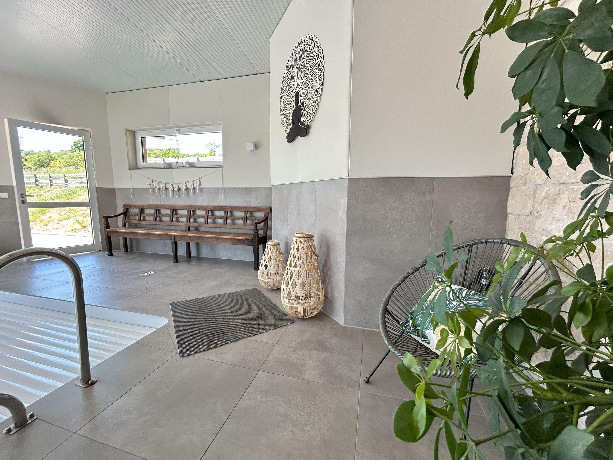 Hot Tub für bis zu 8 Personen Außerhalb der Wellnessscheune ist ein überdachter nach Süden ausgerichteter Hot Tub mit Luft und Massagedüsen für bis zu 8 Personen, umschlossen von einer großen Gartenlounges zum Ruhen und Entspannen.