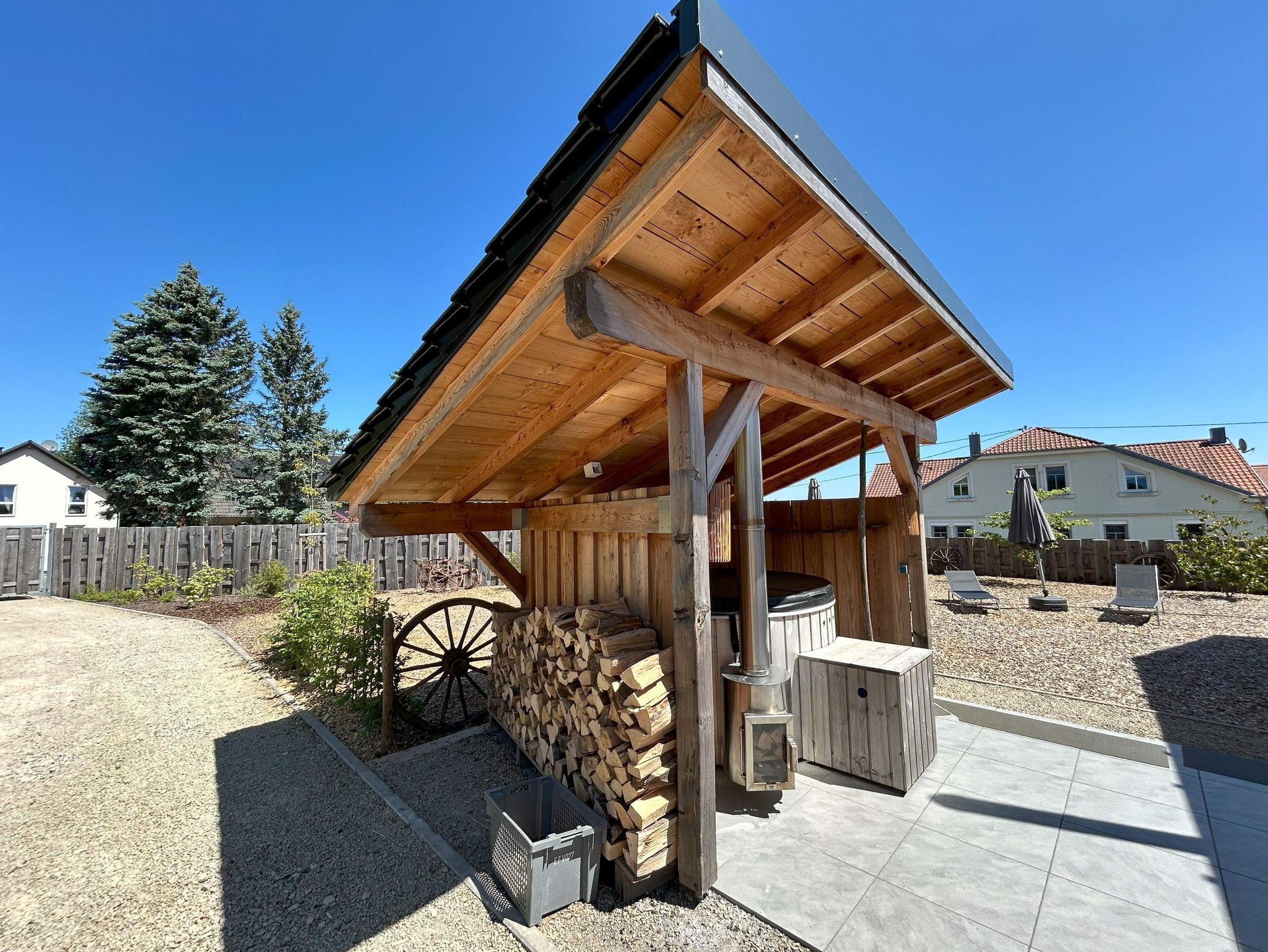 Dazu kommt eine 2,3 x 2,7m große Sauna für bis zu 10 Personen. eine Dusche mit Schwall und Kneipbrause sowie ein schöner Ruheraum für die kalten Tage. Außerhalb der Wellnessscheune ist ein überdachter nach Süden ausgerichteter Hot Tub mit Luft und Massagedüsen für bis zu 8 Personen, umschlossen von einer großen Gartenlounges zum Ruhen und Entspannen. Dieses Spa Resort steht den Gästen des Ferienhauses genauso zu, wie den Gästen des Gästehauses.