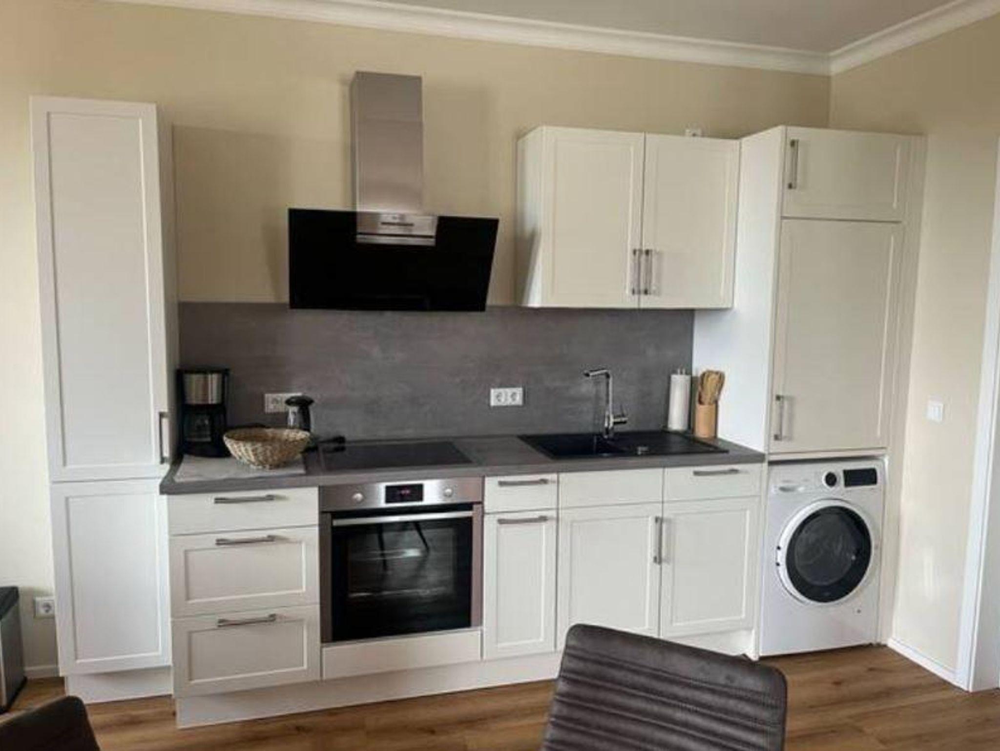 Die Küche ist ausgestattet mit Cerankochfeld, Dunstabzug, Backofen, Kühl,- Gefrierkombination, Geschirrspüler, Kaffeemaschine, Wasserkocher und Toaster.
