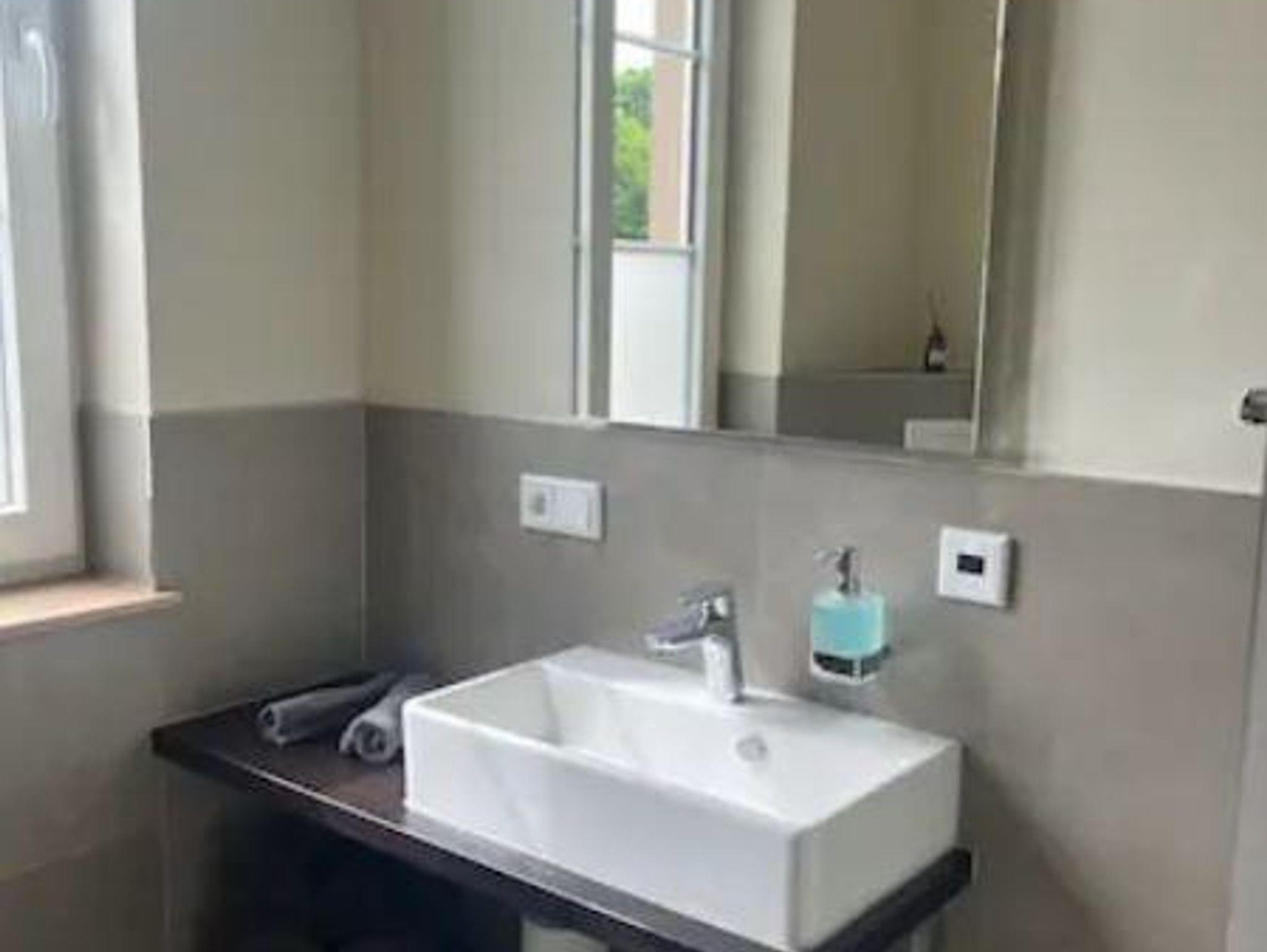 Ein modernes Badezimmer mit Dusche, Waschtisch und WC-Anlage komplettiert die Wohnung.
