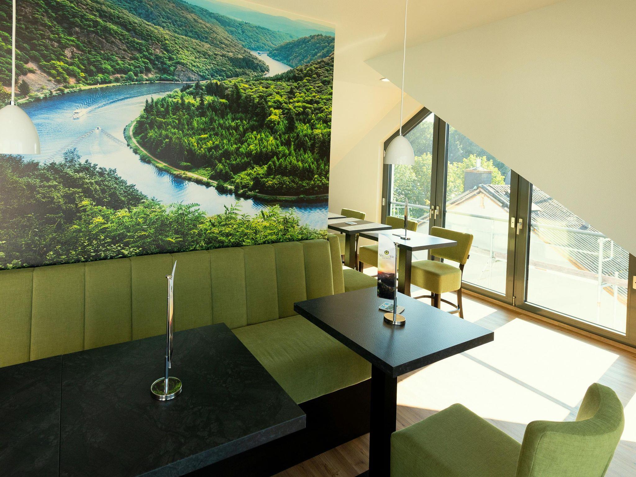Die Saarschleifen-Lounge und die großzügige Dachterrasse bilden kommunikative Treffpunkte für alle Gäste und einen schönen Blick über Orscholz. Kaffeespezialitäten und Kaltgetränke sind 24/7 am Getränkeautomaten verfügbar.