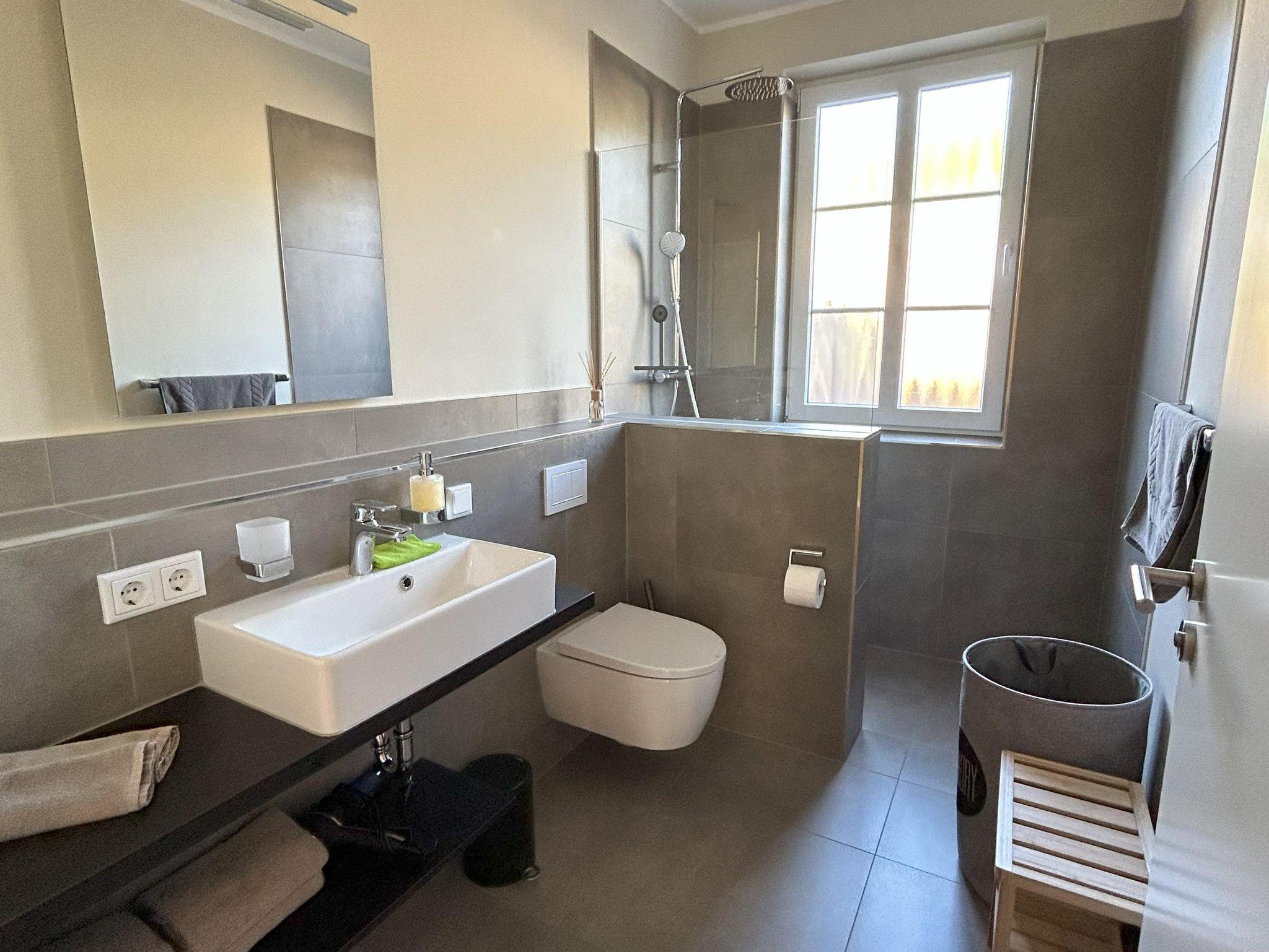 Vom Esszimmer kann man direkt zur großen Außenterrasse gehen. Die Außenterrasse ist komplett eingezäunt. Das Badezimmer mit einer 1;5 x1,5 m großen Dusche, einer unter fahrbaren Waschtisch-Anlage und einer modernen WC-Anlage ist komplett barrierefrei. Staubsauger, Bügeleisen und Bügeltisch, Hundedecke und Hundenapf sind selbstverständlich Bestandteil der Wohnung.