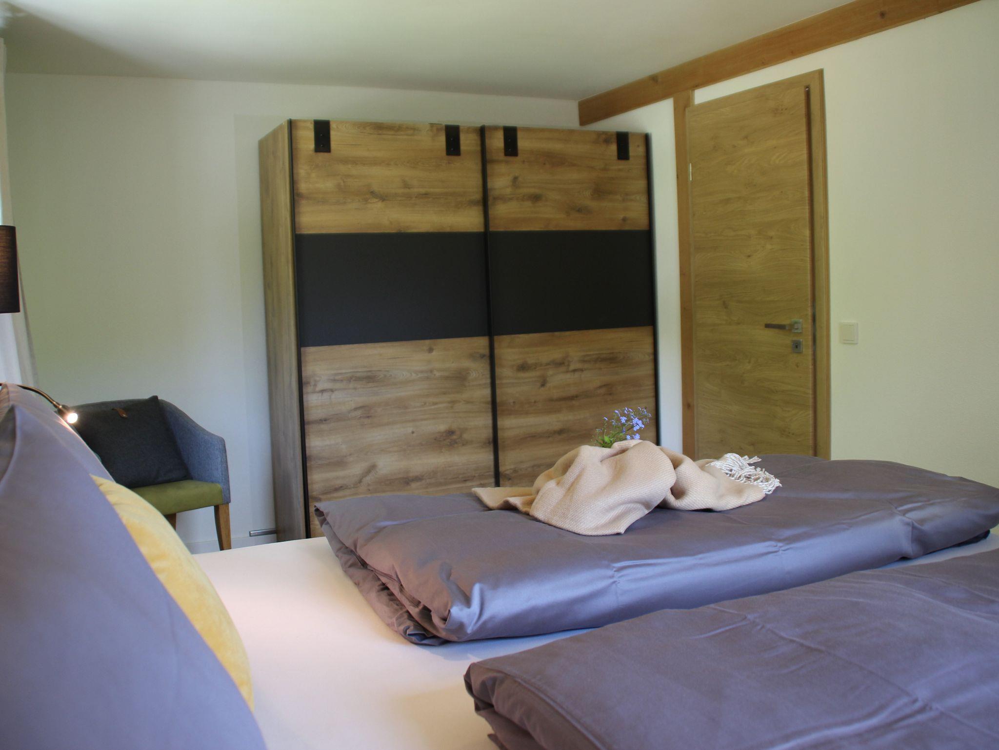 Unsere Galeriewohnung Wiesengrund erstreckt sich über zwei Etagen und bietet mit 90m² Wohnfläche viel Platz und Komfort für einen erholsamen Urlaub für bis zu 4 Personen. Der große hell durchflutete Wohn- und Essbereich mit großer Fensterfront, Kaminofen, Fernseher und CD-Player sowie das moderne Bad mit Waldblick inkl. WC, Dusche, Handtuchtrockner, Föhn und kuscheligen Hand- und Badetüchern sorgen für entspannte Wohlfühltage. Auch die gemütlichen Schlafzimmer im Obergeschoss bieten mit Boxspringbett und 2 Einzelbetten genügend Raum für Ruhe und Erholung. Die Landhausküche ist komplett ausgestattet mit Kühl-/Gefrierschrank, Herd, Backofen, Toaster, Eierkocher und Kaffeemaschine. Kostenlos nutzen Sie auch Waschmaschine, Trockner sowie heimisches Brennholz, Kuscheldecken, Wärmflasche und Bio-Dinkelkissen. Zudem lädt auch der großzügige Balkon, die große Sonnenterrasse sowie der schöne Wohlfühlnaturgarten mit offener Feuerstelle und Gartendusche zum Verweilen ein. Die gesamte Ferienwohnung ist Nichtraucher sowie frei von Elektrosmog.