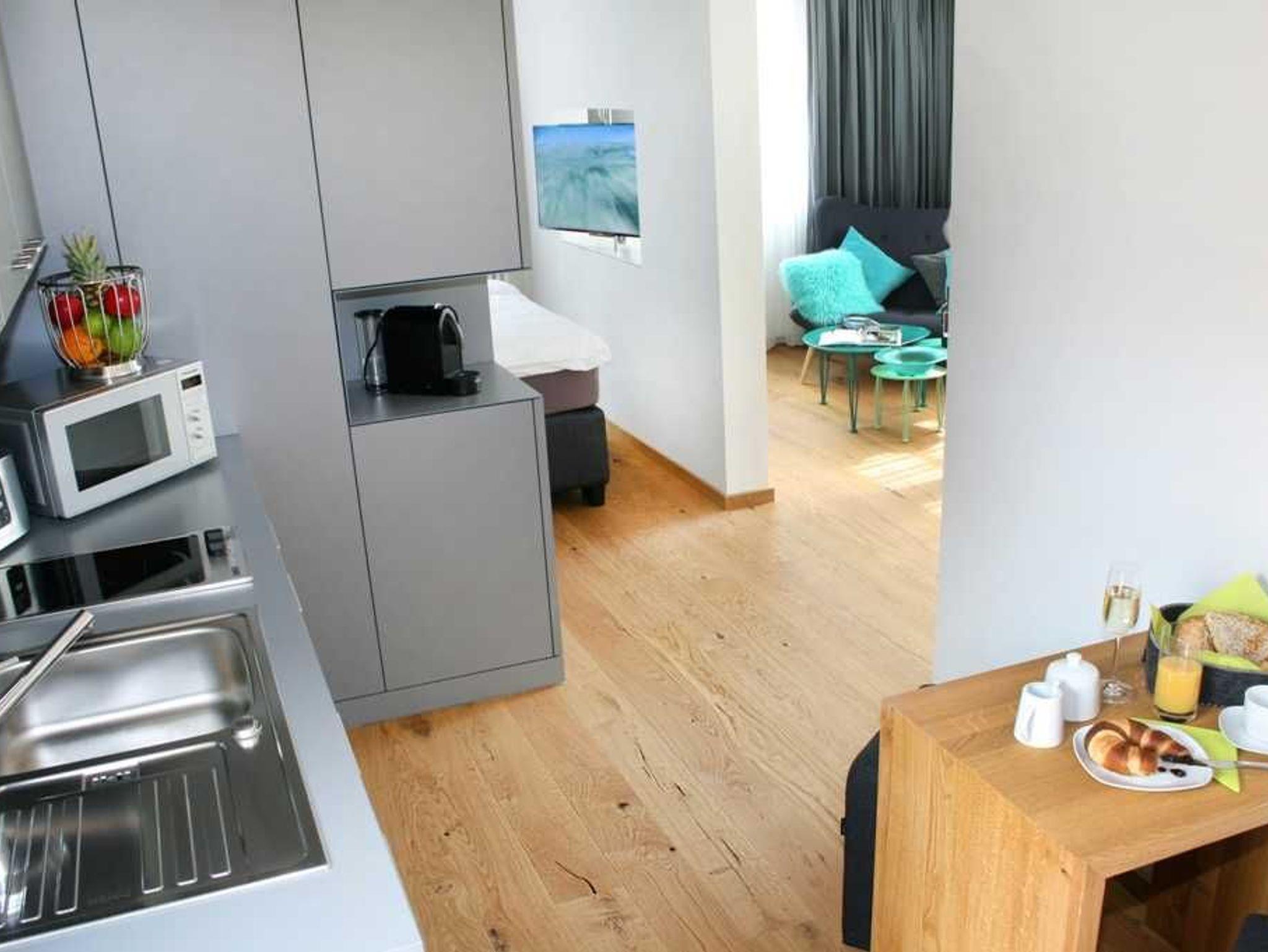 Küchenausstattung: 2 Platten-Cerankochfeld, Mikrowelle mit Grillfunktion, Wasserkocher, Toaster, Kühlschrank mit Gefrierfach, Geschirrspülmaschine, Nespresso-Maschine.
