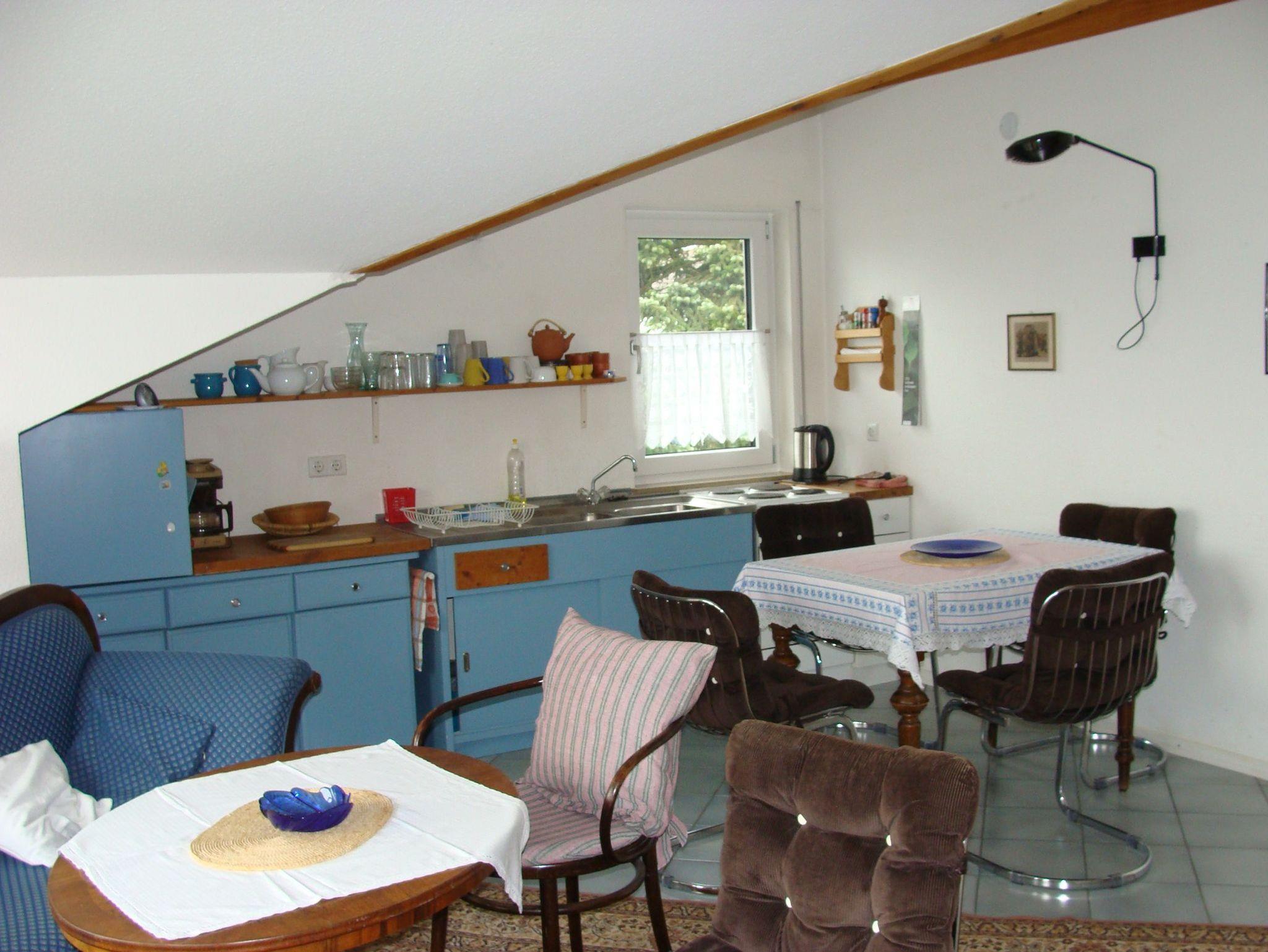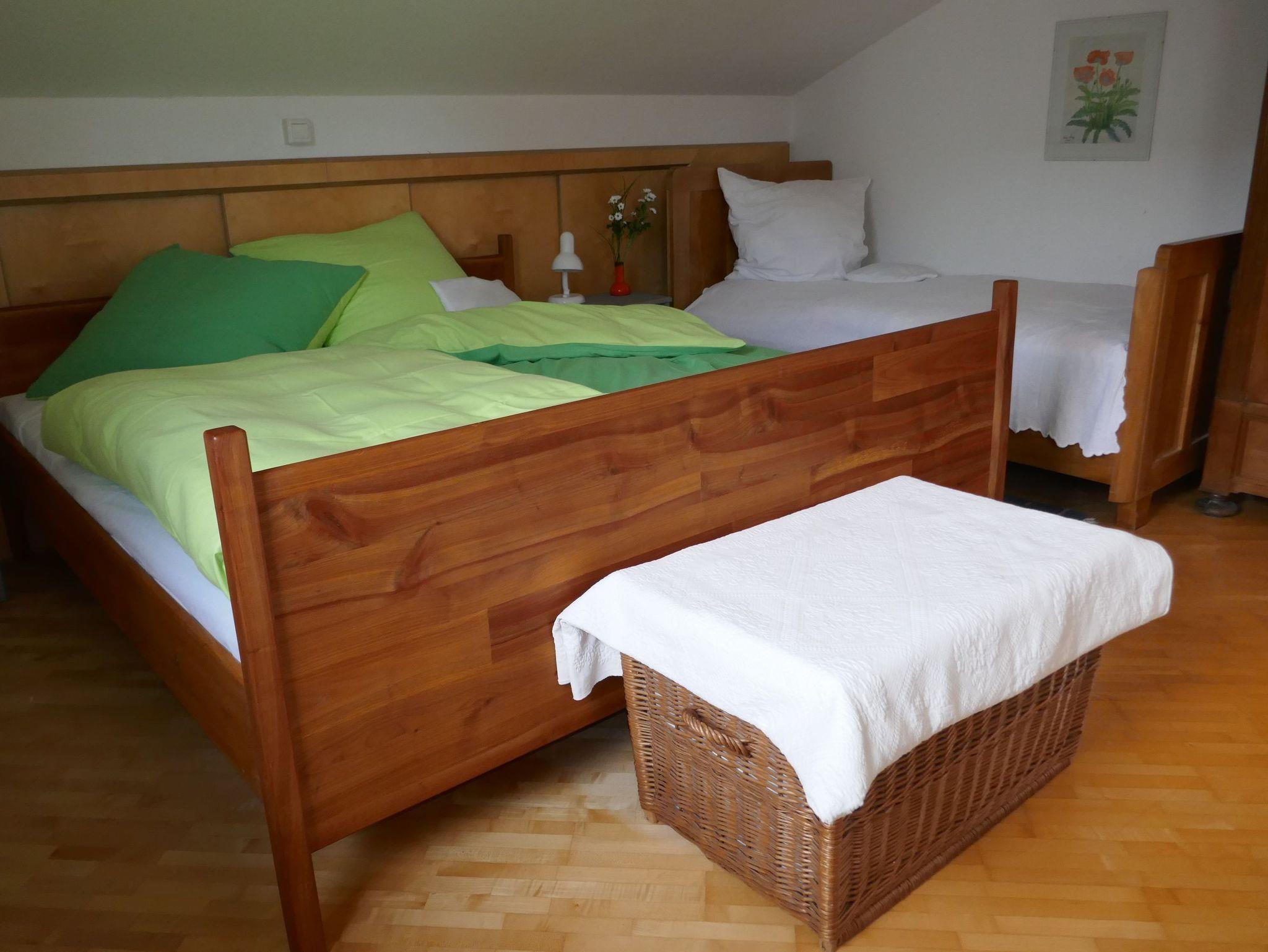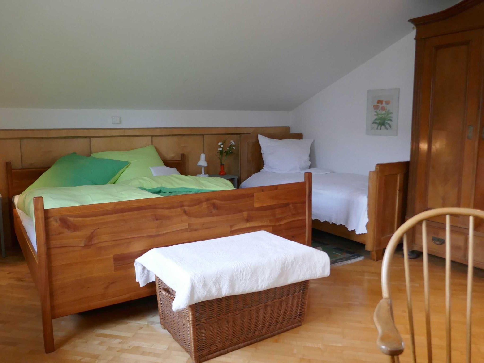 Viel Platz und Aussicht bietet unser großer Wohnraum mit kleiner Küchenzeile, Esstisch und Sitzgruppe, außerdem eine bequeme Doppel-Schlafcouch; Fernseher, Handbücherei und Spielsachen sind für Sie vorhanden. Im Schlafzimmer finden Sie ein Doppelbett (180 x 210), dazu ein weiteres Bett (90 x 190), Schrank und Schreibtisch; wahlweise ist hier noch ein Zustell- oder Babybett möglich. Das zweite Schlafzimmer ist mit einem Einzelbett (90 x 210), Tisch und Kommode möbliert, dazu kann ein Babybett aufgestellt werden. Ein kleines Bad mit Waschbecken, Badwanne und WC, sowie eine Abstellkammer komplettieren die Ferienwohnung im Dachgeschoss.
