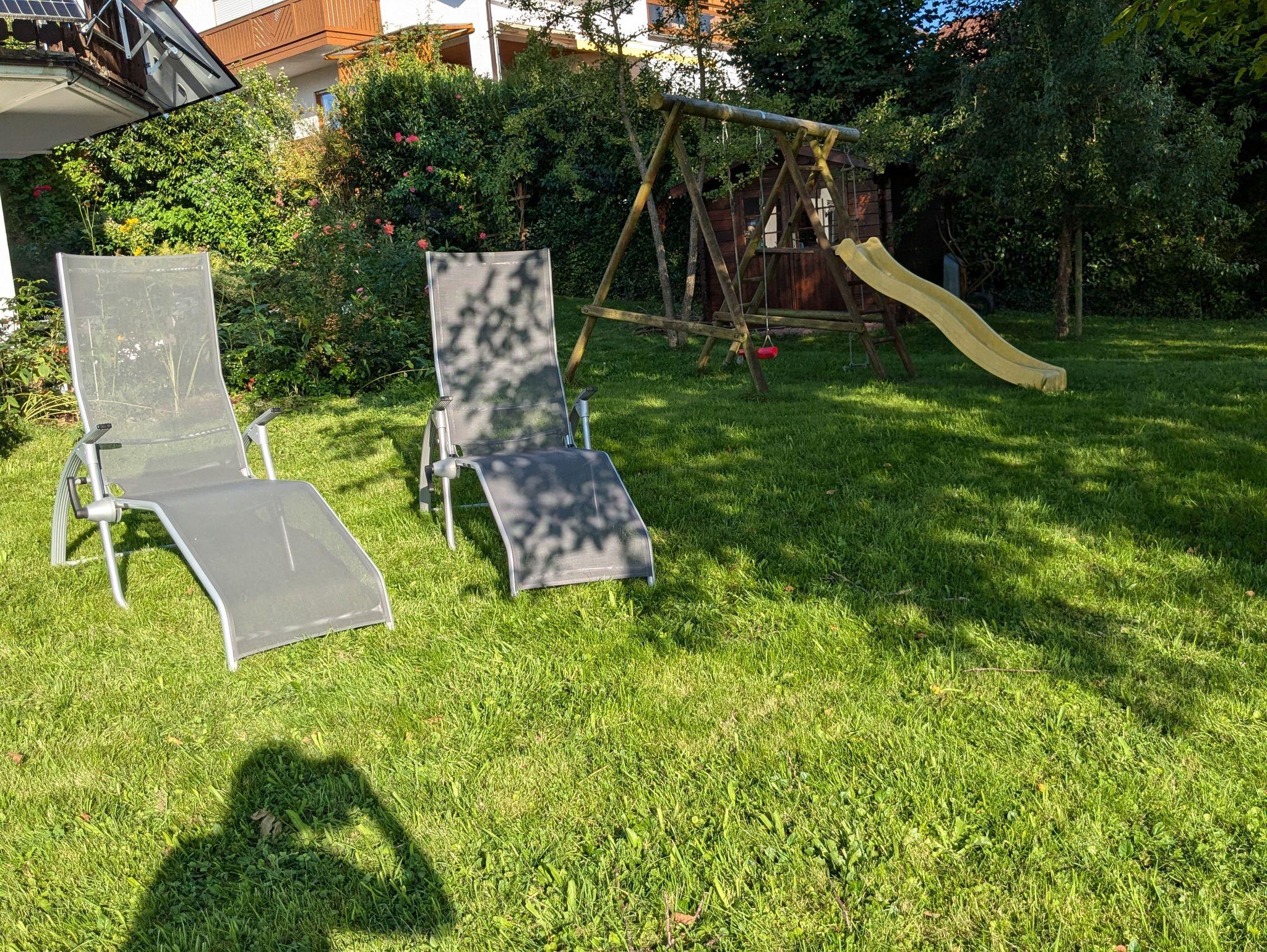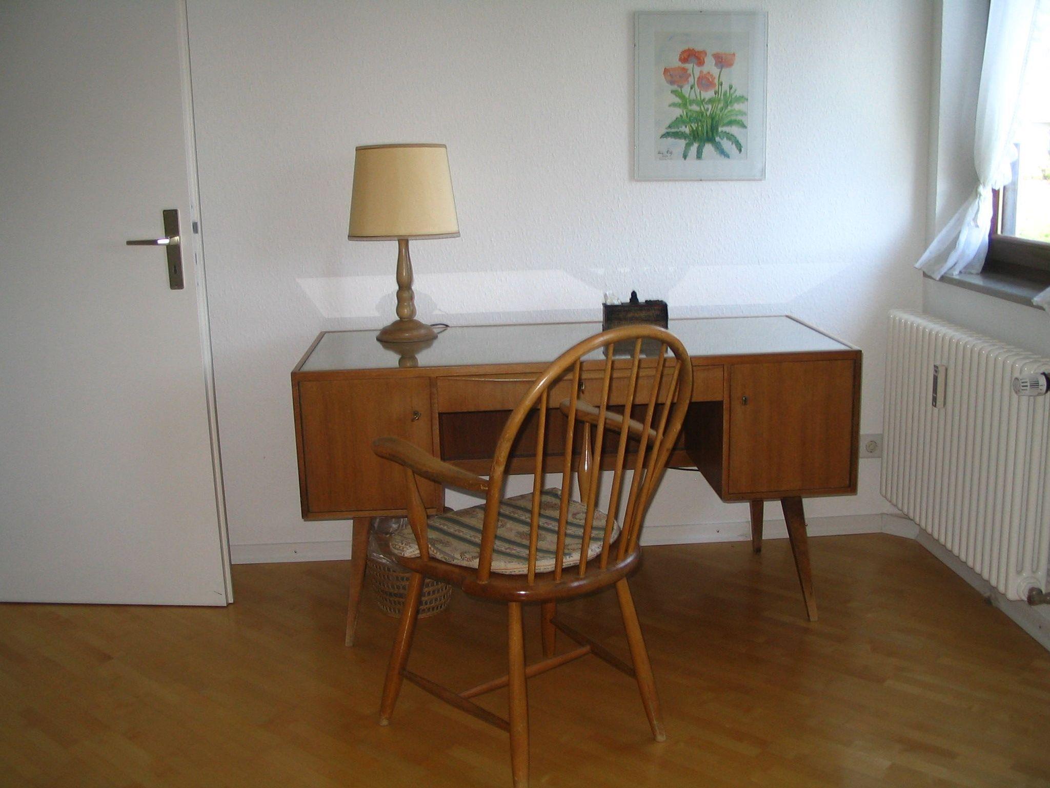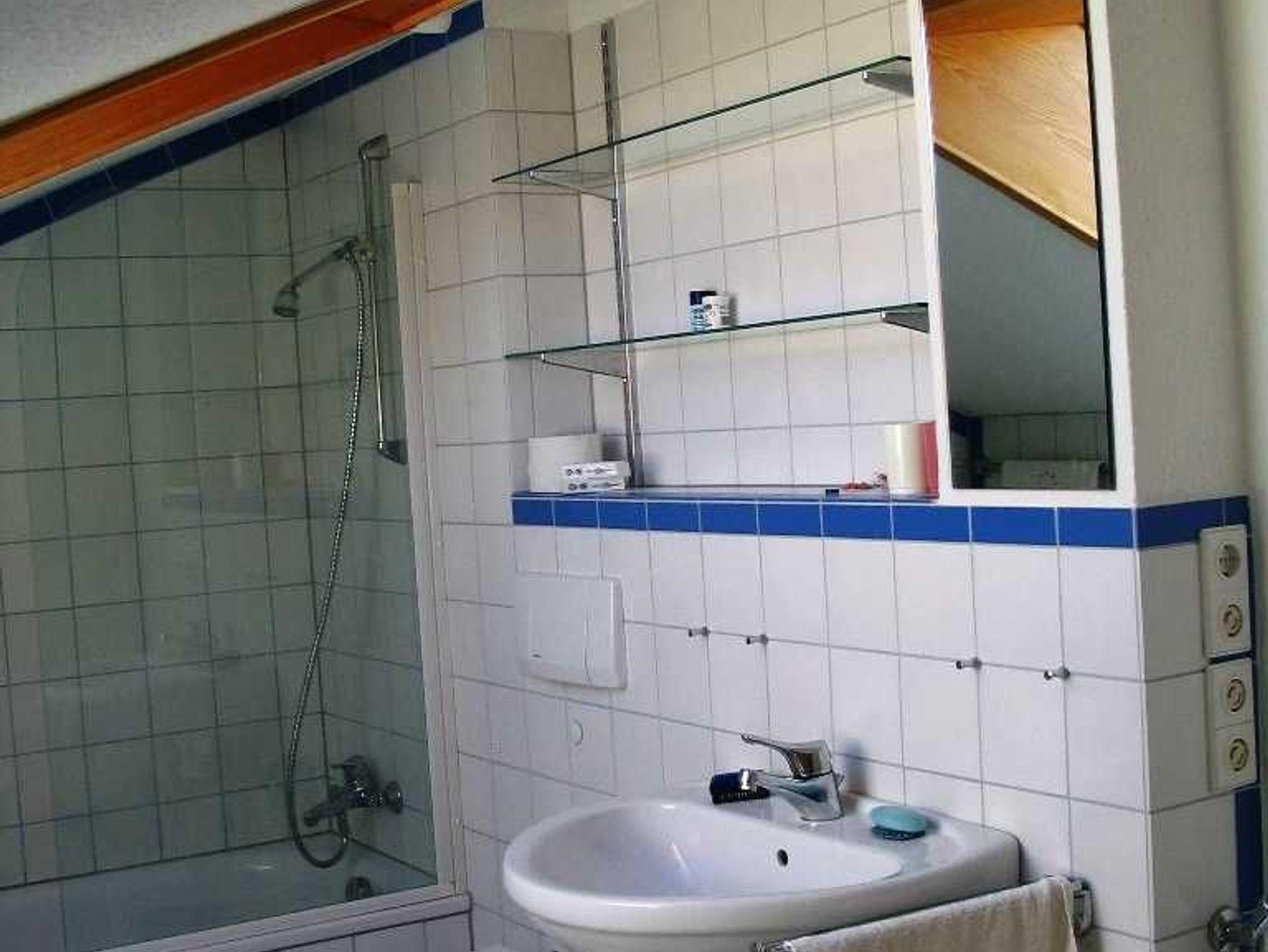 Viel Platz und Aussicht bietet unser großer Wohnraum mit kleiner Küchenzeile, Esstisch und Sitzgruppe, außerdem eine bequeme Doppel-Schlafcouch; Fernseher, Handbücherei und Spielsachen sind für Sie vorhanden. Im Schlafzimmer finden Sie ein Doppelbett (180 x 210), dazu ein weiteres Bett (90 x 190), Schrank und Schreibtisch; wahlweise ist hier noch ein Zustell- oder Babybett möglich. Das zweite Schlafzimmer ist mit einem Einzelbett (90 x 210), Tisch und Kommode möbliert, dazu kann ein Babybett aufgestellt werden. Ein kleines Bad mit Waschbecken, Badwanne und WC, sowie eine Abstellkammer komplettieren die Ferienwohnung im Dachgeschoss.