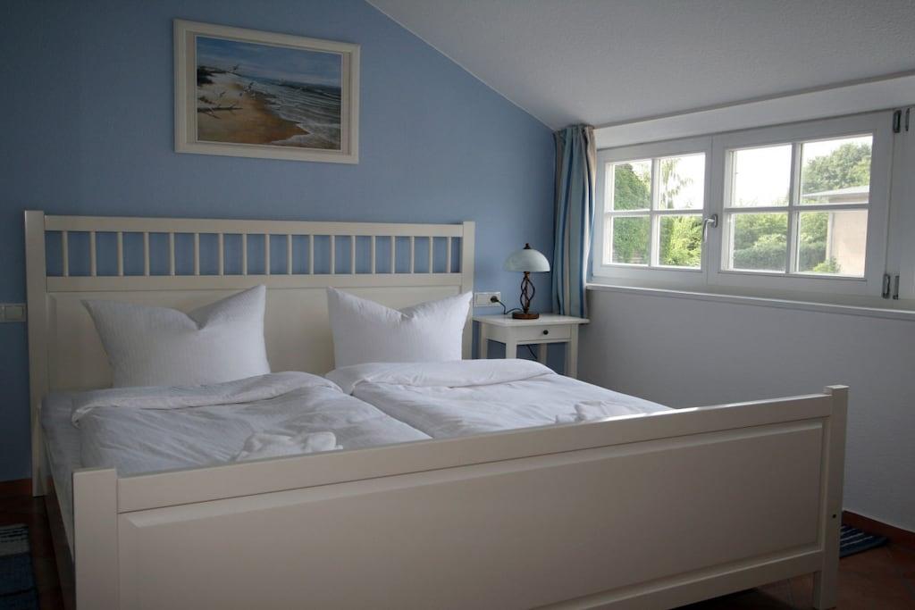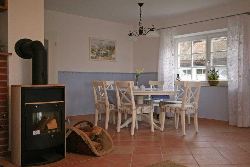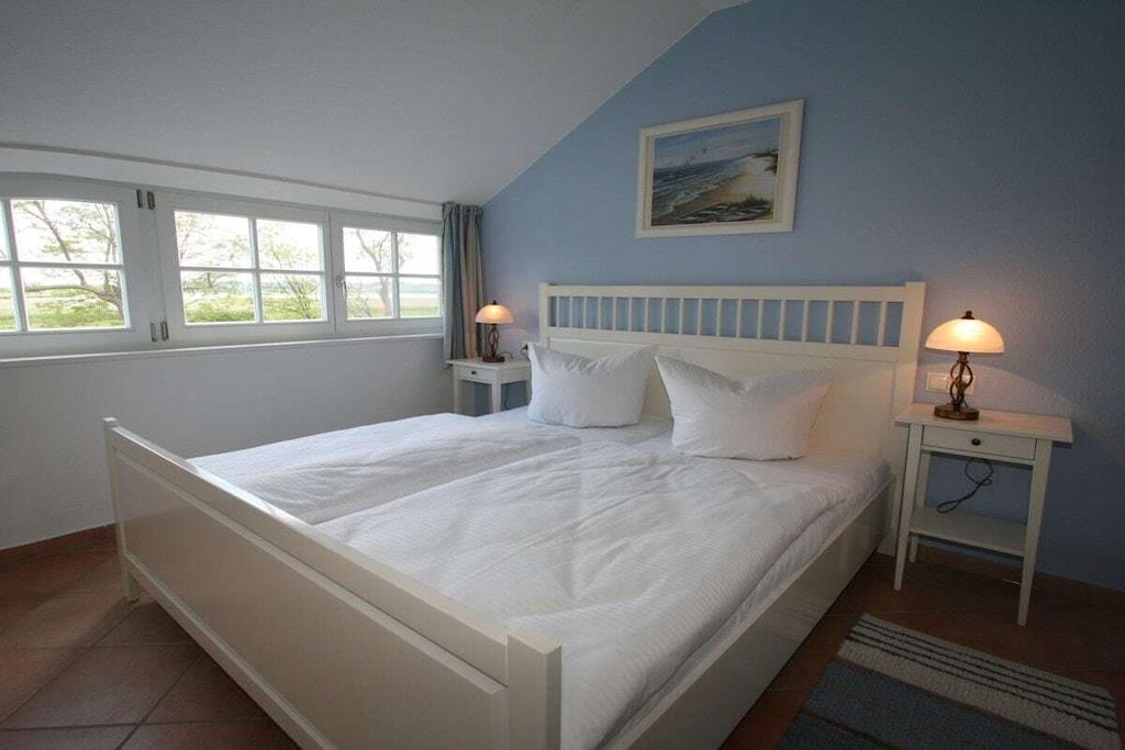 Willkommen in unserer komfortablen 2-Etagen-Ferienwohnung Tamme. Die gehobene Ausstattung ist auf max. 6 Personen (4 Erw.+ 2 Kleinkinder) abgestimmt. Der großzügige Wohnbereich im Erdgeschoss mit vielen Fenstern und Kamin lädt zum Verweilen ein. Lassen Sie sich von dem wundervollen Blick auf die idyllische Boddenlandschaft verzaubern. Direkt an das Wohnzimmer grenzt die Gartenterrasse mit bequemer Sitzgruppe. Die hochwertige Küche befindet sich ebenfalls im Erdgeschoss und bietet viel Platz zum Essen oder für einen geselligen Spielabend. Zur Ferienwohnung gehören weiterhin 2 getrennte Schlafzimmer im Dachgeschoss. Neben dem modernen Duschbad im Dachgeschoss gibt es ein Gäste-WC im Erdgeschoss.