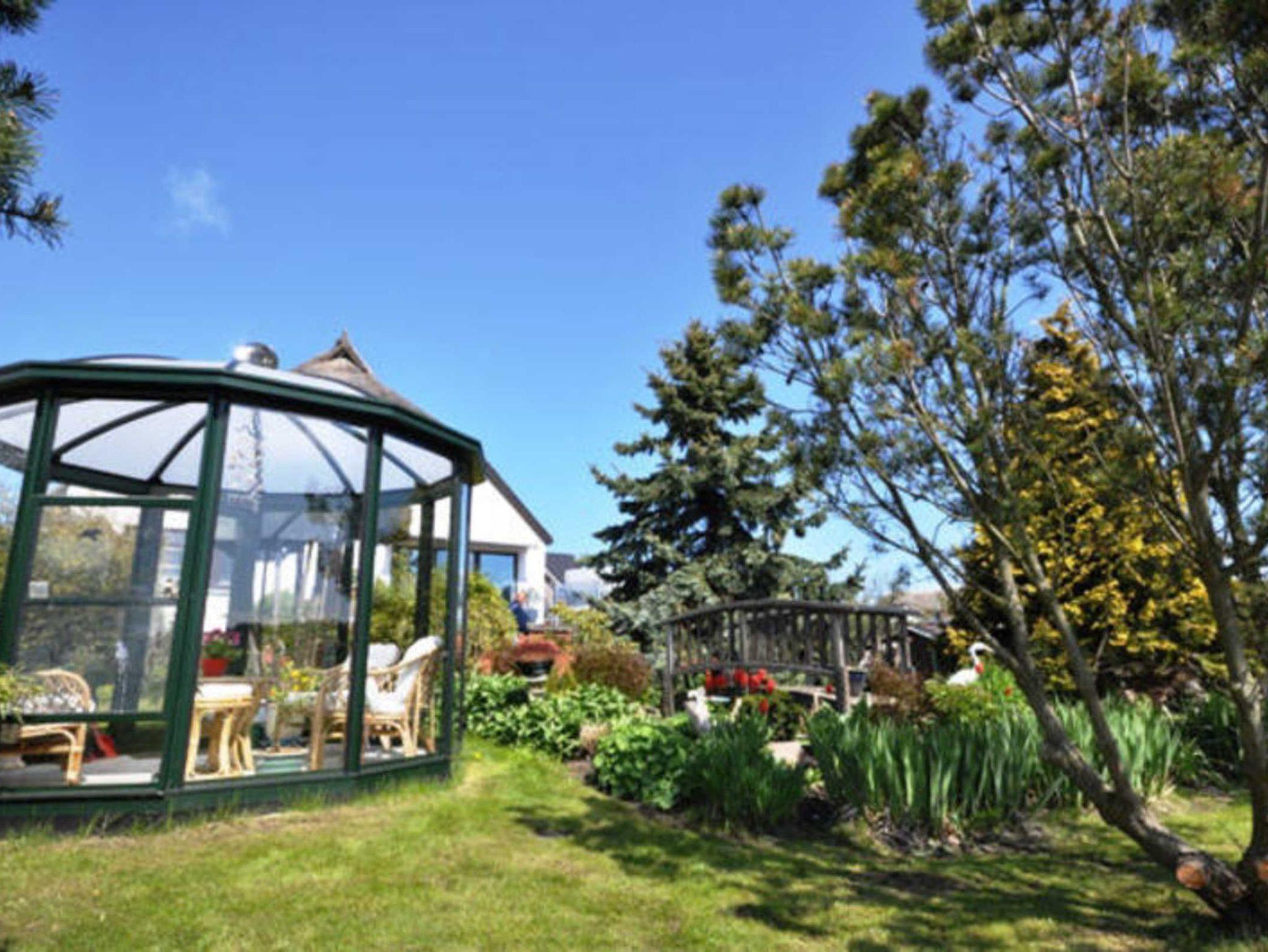Auf dem ca. 1000 m² großem Garten finden Sie einen Holzpavillon mit Bestuhlung und Terrasse mit Grill, Unterstellmöglichkeiten für Fahrräder, einen Strandkorb zum Relaxen, einen Glaspavillon mit Bestuhlung und einen kleinen Teich mit kleiner Brücke.
