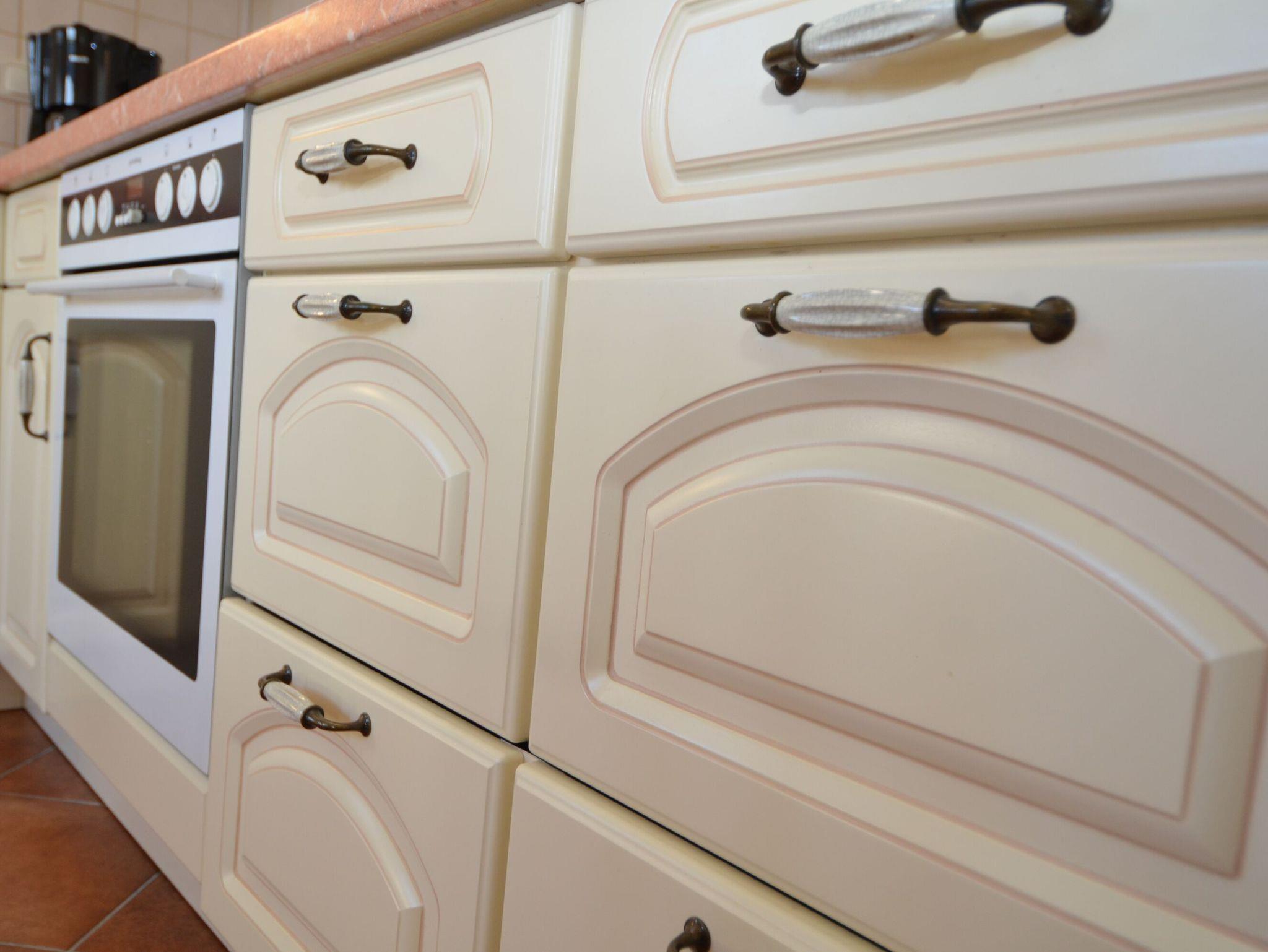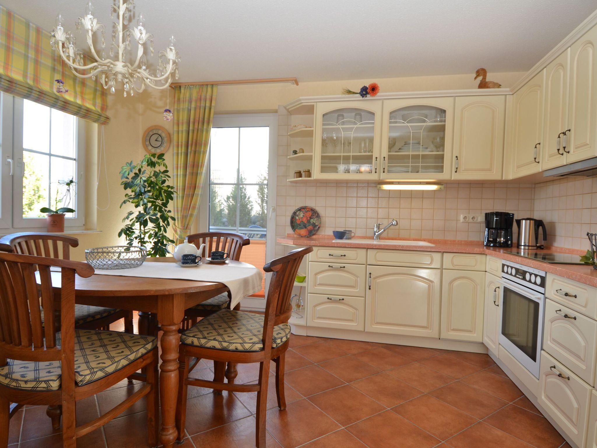 Die separate Küche ist komplett ausgestattet mit einem Kühlschrank mit Gefrierfach, einem Geschirrspüler, einem 4-Zonen-Cerankochfeld, einem Backofen, einer Mikrowelle, Wasserkocher, Kaffeemaschine, Toaster sowie diversem Kleininventar, das die hervorragende Ausstattung vervollständigt. Hier befindet sich auch der Esstisch für 4 Personen.