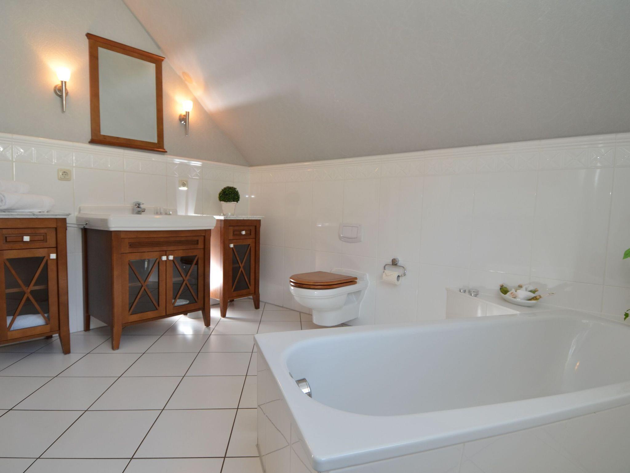 Im Obergeschoss sind die beiden Schlafzimmer und das große Badezimmer untergebracht. Beide Schlafzimmer sind mit modernem Laminat ausgelegt und verfügen je über ein Doppelbett der Größe 1,80 x 2,00 m sowie genügend Stauraum für Ihre Urlaubsgarderobe. Eines der Schlafzimmer verfügt über einen weiteren Flachbild-TV.