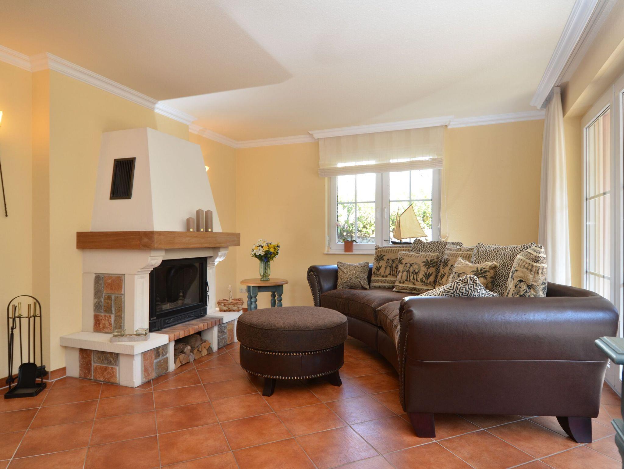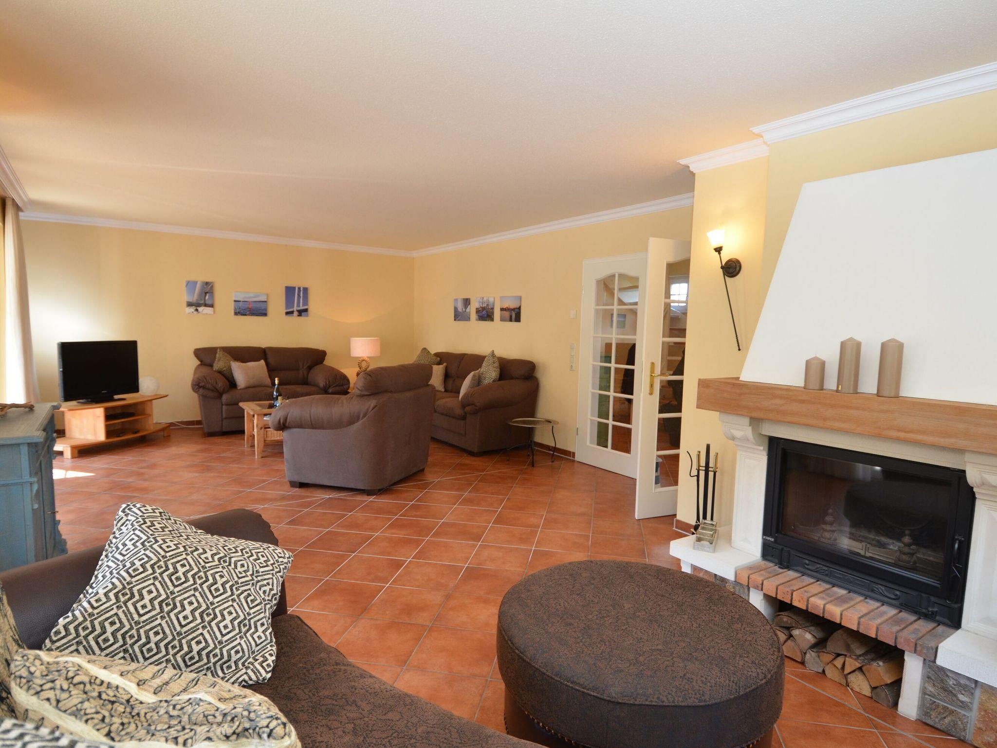 Vom Eingangsbereich aus betreten Sie durch den großen Flur den komfortabel ausgestatteten Wohnbereich, der auf ca. 30 m² mit einer schönen Couchecke, dem Flachbild-TV und einer Mini-Stereoanlage zum Entspannen einlädt. Die großzügige Relaxcouch vor dem offenen Kamin ermöglicht kuschelige Stunden vor dem prasselnden Kaminfeuer.
