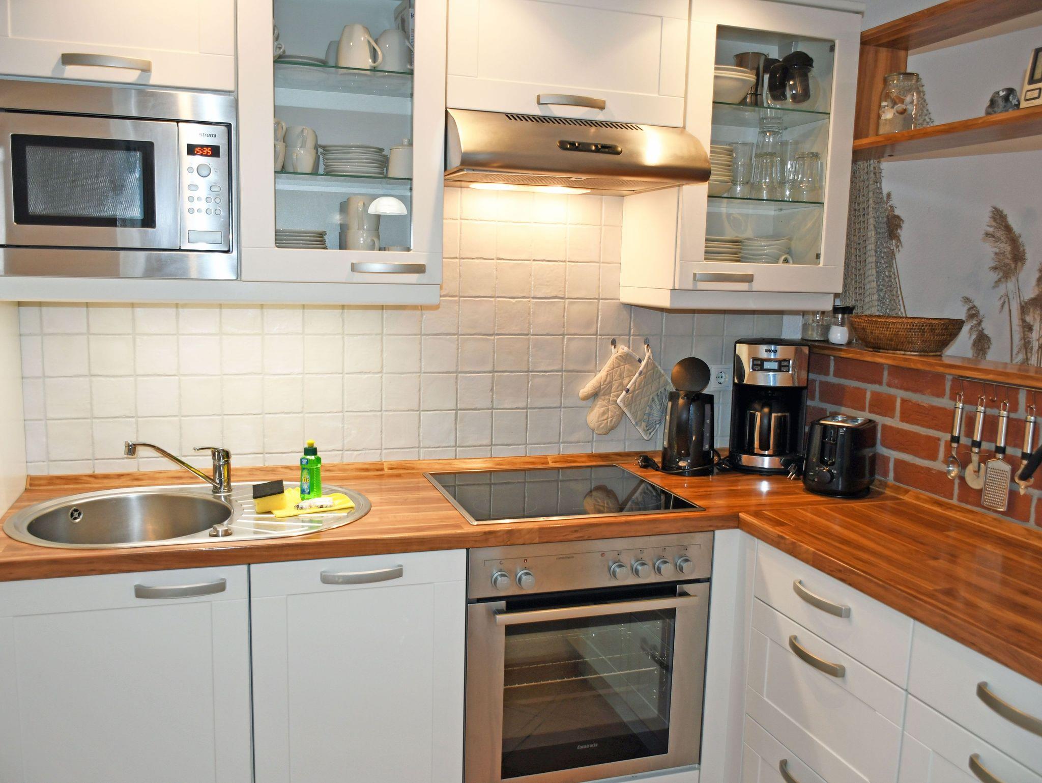 - Küchenzeile mit Ceranfeldherd, Backofen, Abzugshaube, Mikrowelle, Geschirrspüler, Wasserkocher, Kaffeemaschine, Toaster, Kühlschrank mit Gefrierfach