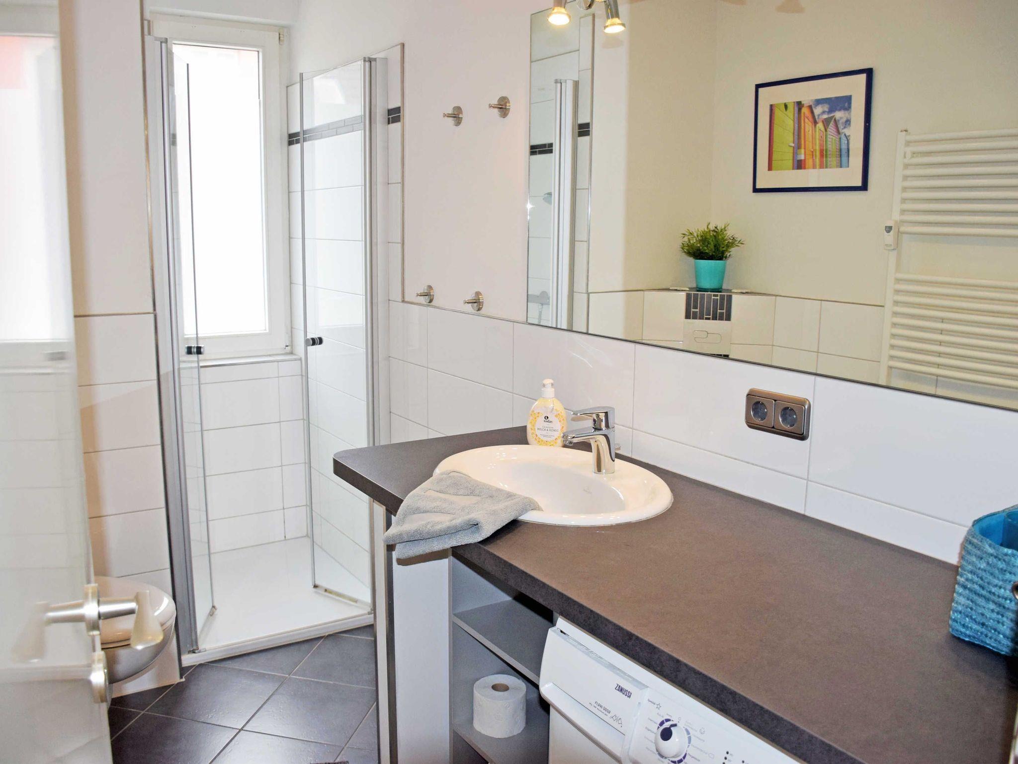 Für Freunde der kulinarischen Unabhängigkeit steht die voll ausgestattete Küche mit Geschirrspüler zur Verfügung. Neben einem Kühlschrank und einem Gefrierschrank, einem Backofen, Mikrowelle und E-Herd (Ceranfeld), stehen Ihnen auch ein Wasserkocher, eine Kaffeemaschine und ein Toaster bereit. Das hell erleuchtete Tageslicht-Badezimmer mit ebenerdiger Dusche verfügt über ein WC und einen Waschtisch mit großem Spiegel. Die dort vorhandene Waschmaschine wird Ihnen kostenfrei zur Verfügung gestellt. Alle vorhandenen Räume, bis auf die Küche, sind zur Unterstützung der Privatsphäre mit blickdichten Plissees ausgestattet.