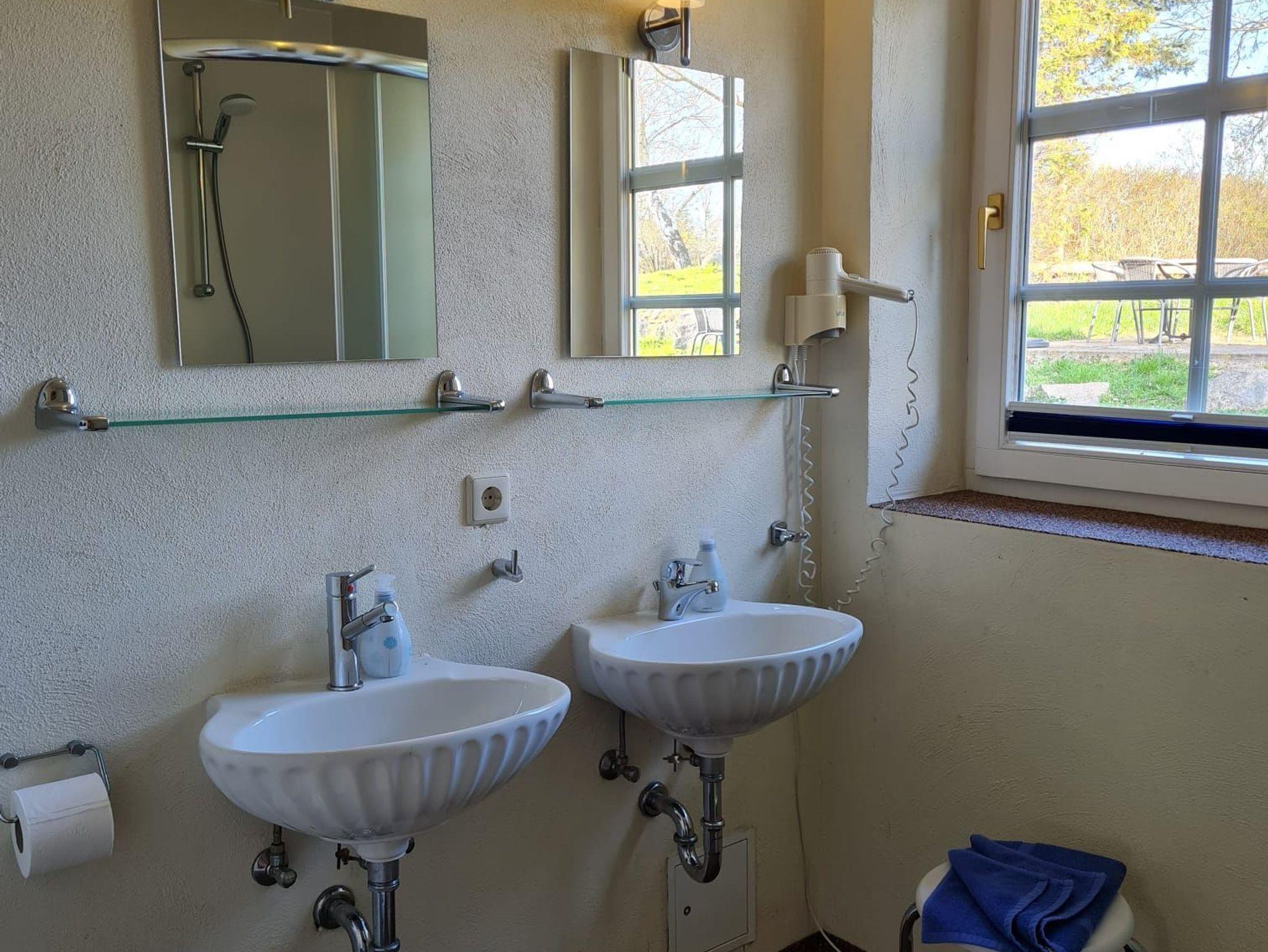 Ein Föhn ist auch vorhanden. Über eine Treppe gelangen Sie in das Obergeschoss