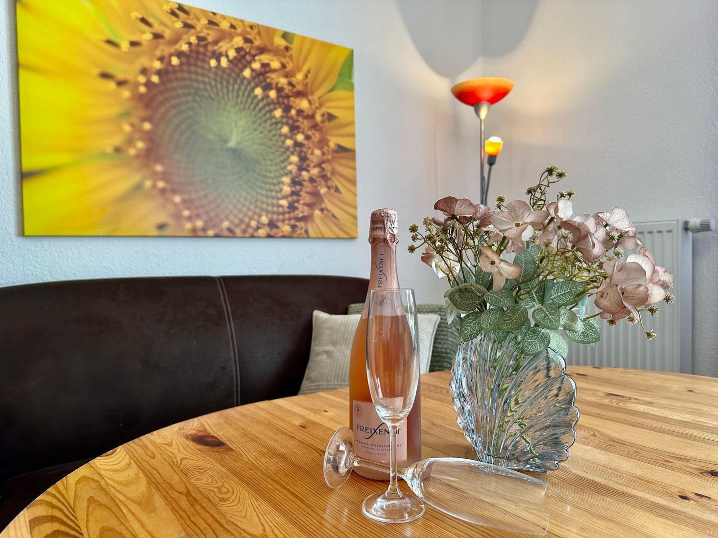 Der Wohnbereich ist offen und einladend gestaltet – mit einer gemütlichen Sitzecke und einem separaten Essplatz. Die Küche ist umfassend ausgestattet mit: