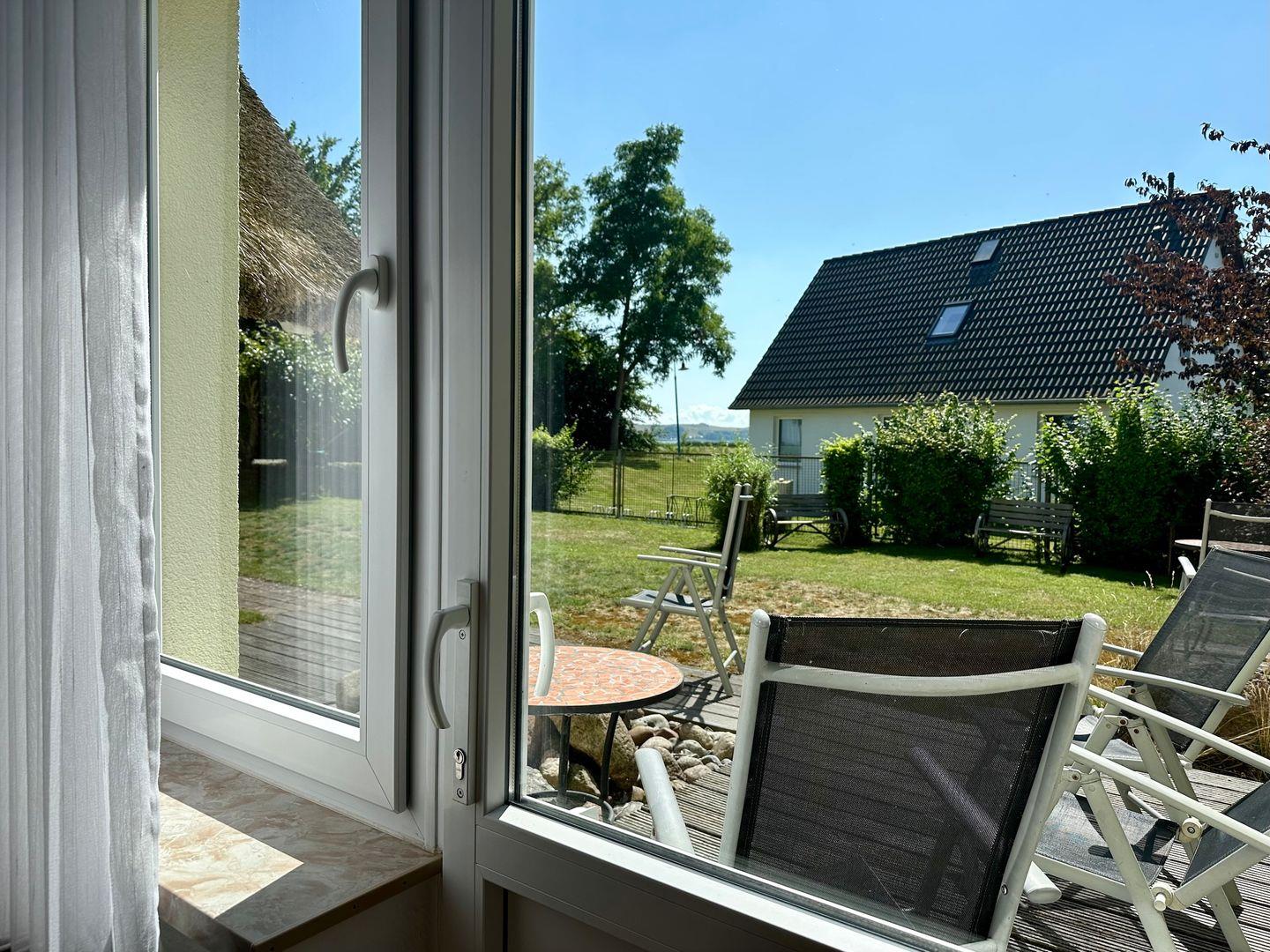 Die Wohnung befindet sich im Erdgeschoss, nur wenige Schritte von der Badestelle am Bodden entfernt. Kostenfreie Parkplätze stehen direkt auf dem Grundstück zur Verfügung.
