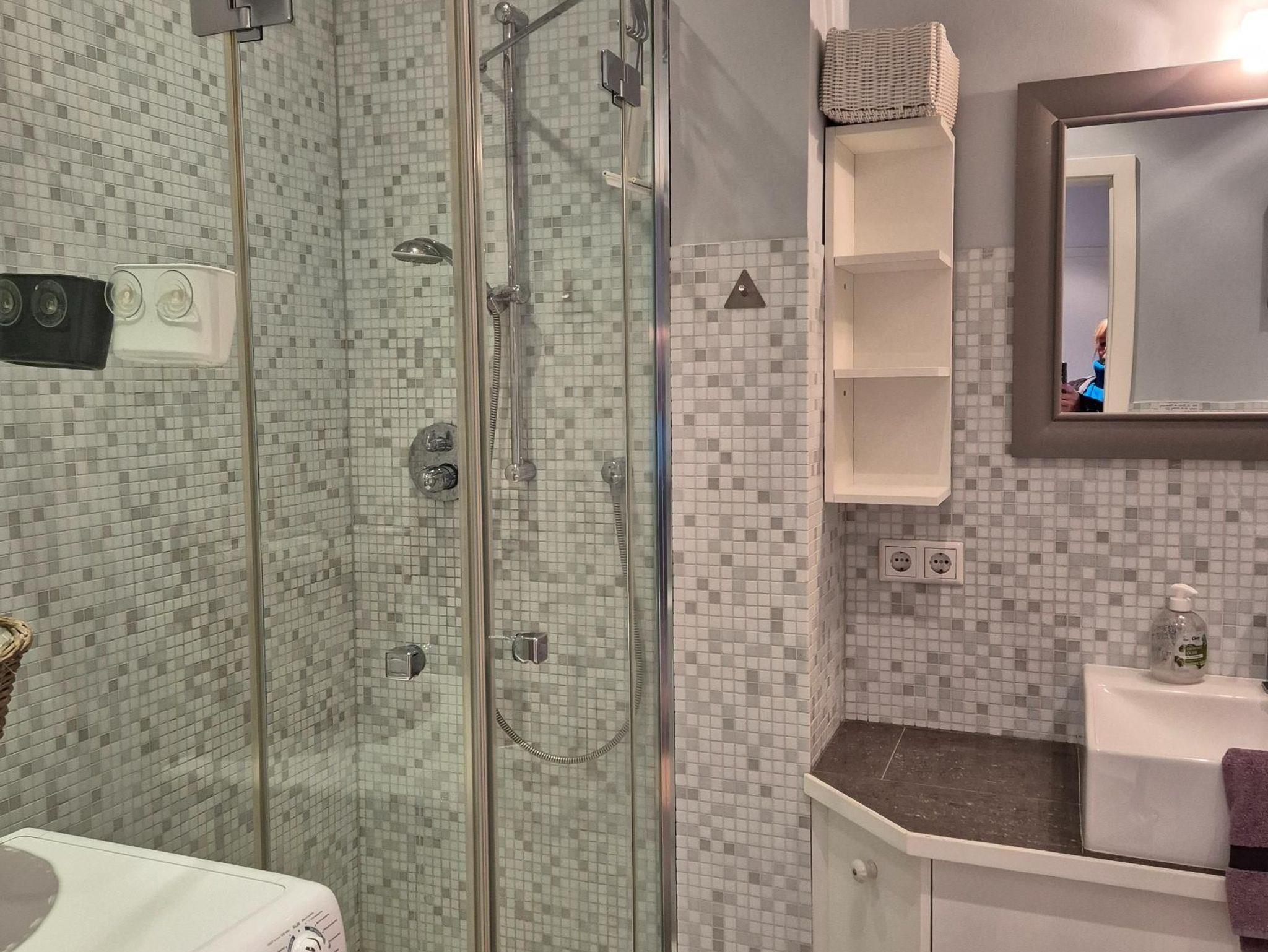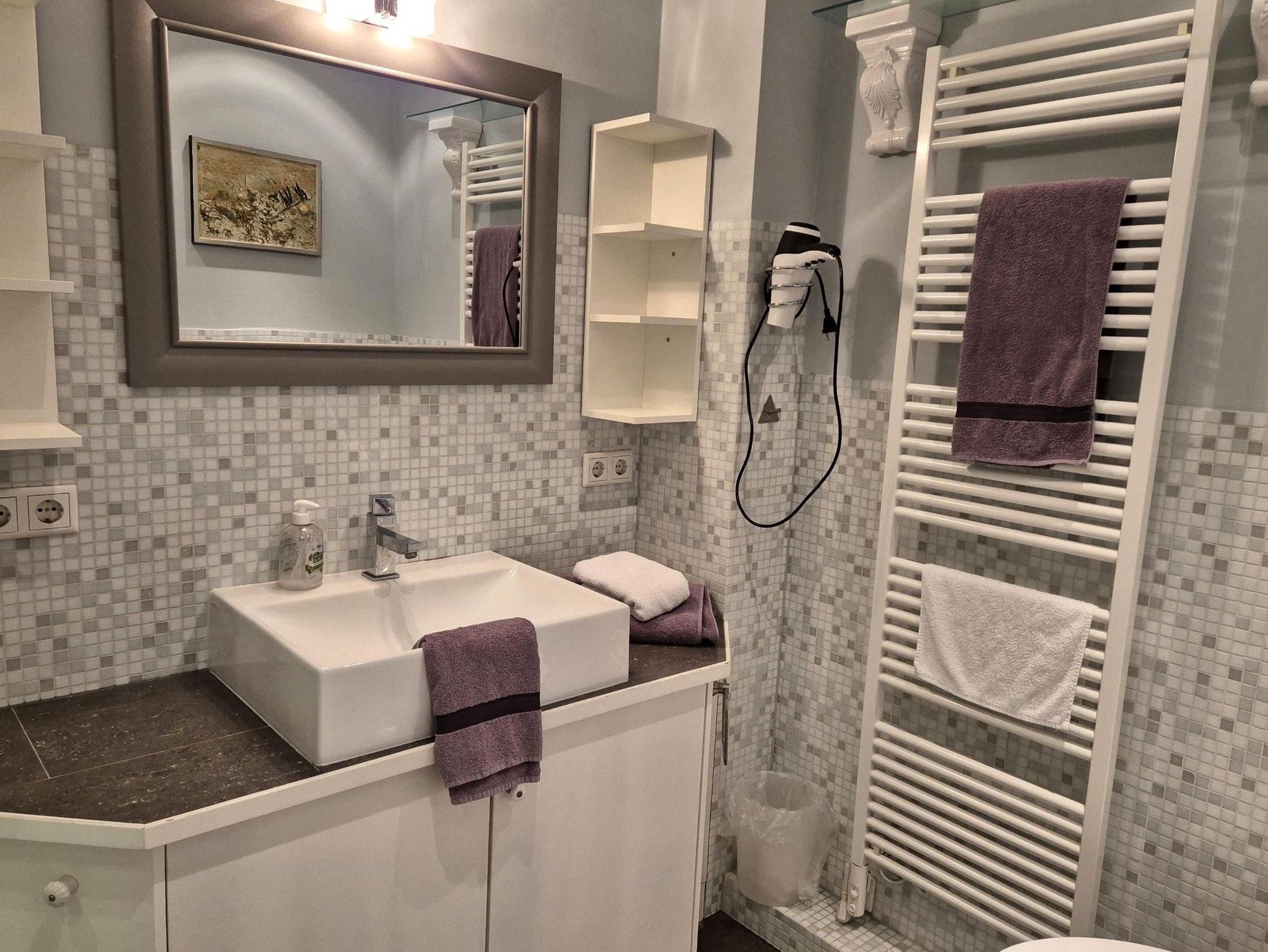 Sanitär: bodenebene Dusche, Föhn, Handtuchheizkörper, Schminkspiegel.