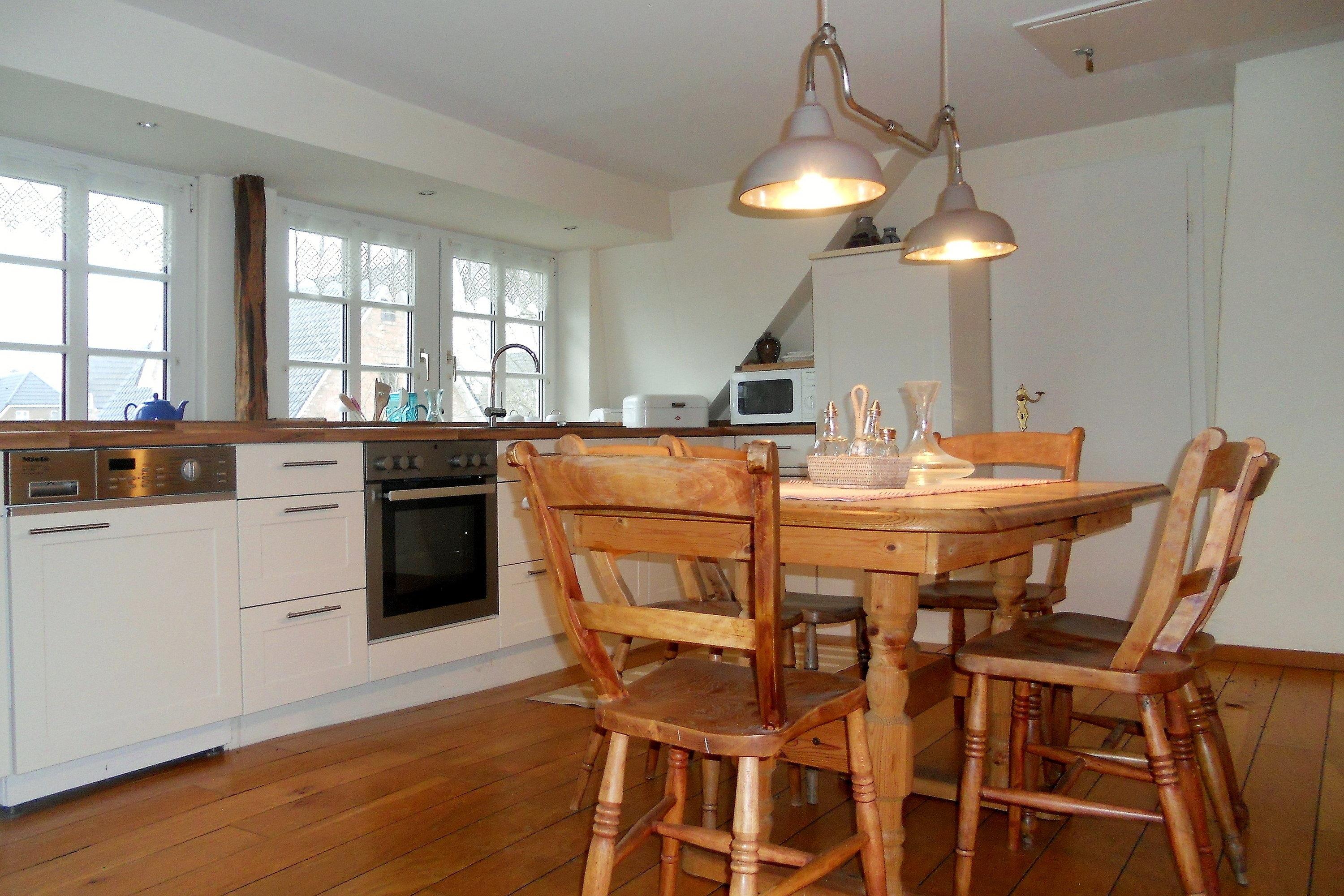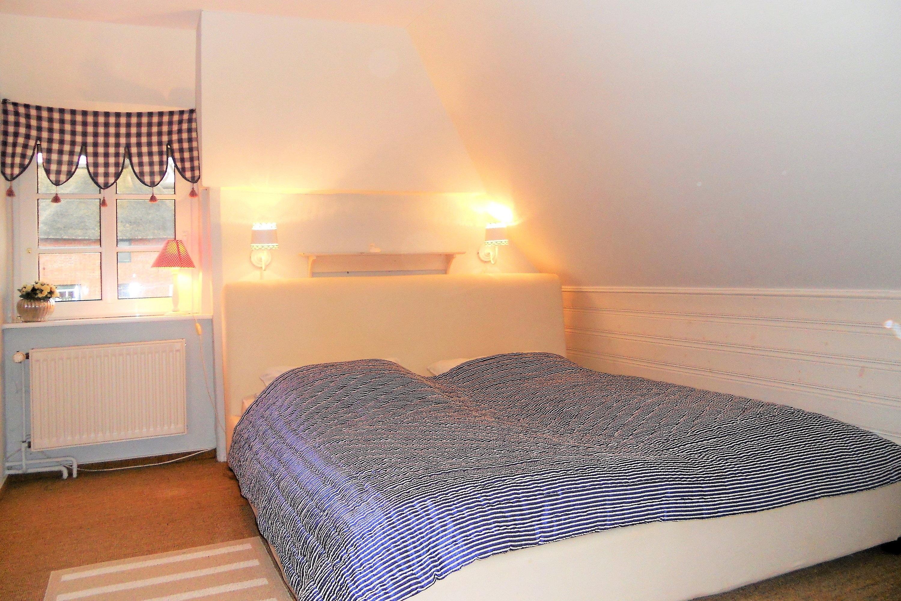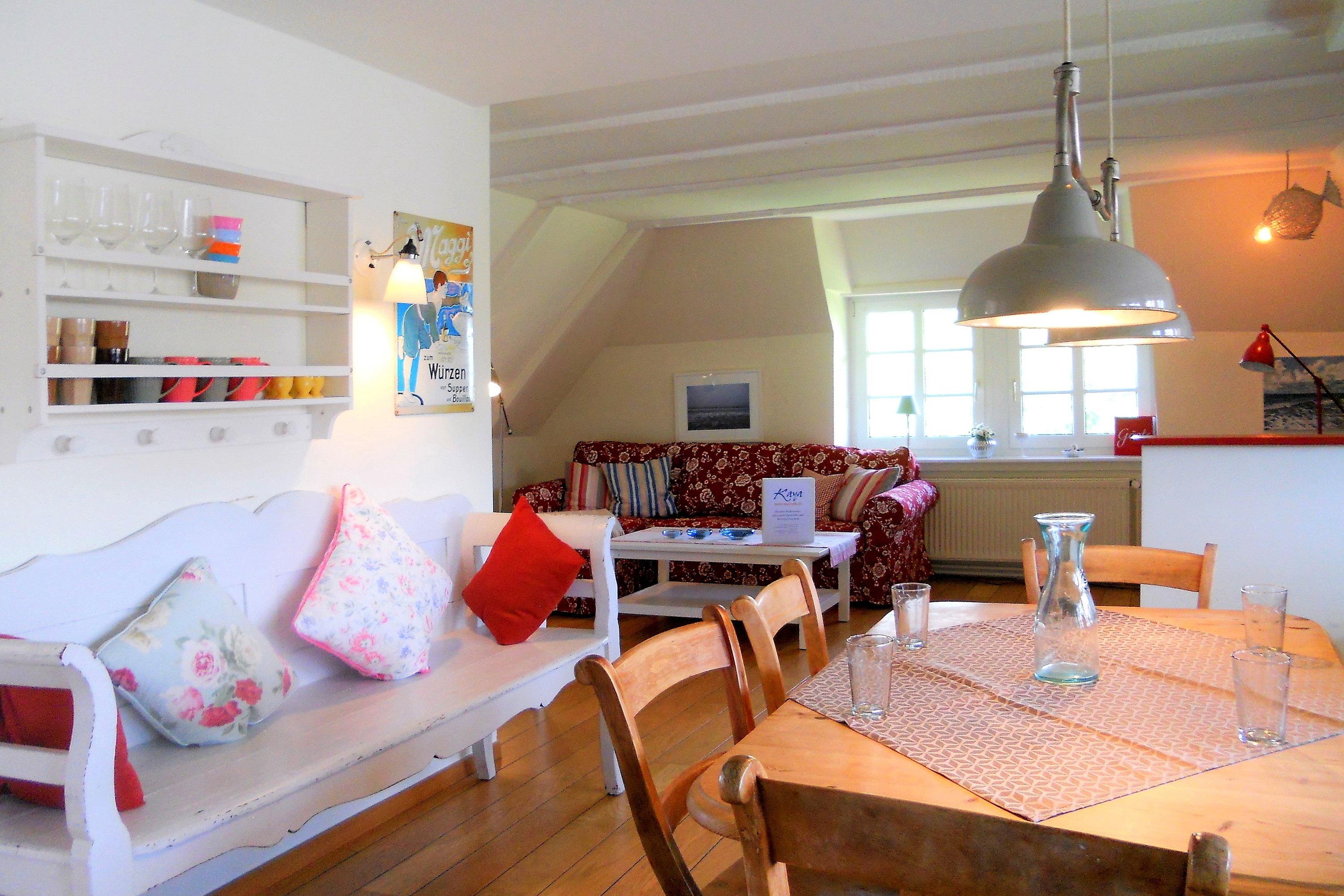 Die Obergeschosswohnung "Peppin" bietet bis zu sechs Personen herrliche Urlaubstage im ruhigen Ort Midlum- ca. 5 Kilometer von der Stadt Wyk entfernt. Über die eigene Terrasse gelangen Sie durch einen separaten Eingang in die Wohnung mit dem im Erdgeschoss befindlichen Badezimmer. Von hier aus führt eine Treppe hinauf zu dem großen Wohnbereich mit integrierter Wohnküche. Friesische Gastfreundlichkeit heißt Sie willkommen und lässt Sie sich sogleich Wohlfühlen. Drei abgehende Schlafzimmer, eines mit Doppelbett (180 x 200 cm) und die anderen beiden mit je zwei Einzelbetten (2x 100 x200 cm und 2x 80x 190cm), versprechen ruhige Nächte nach aufregenden Urlaubstagen. Die Wohnung ist liebevoll eingerichtet und gut ausgestattet. Ihr vierbeiniger Freund (max. 2 Hunde) ist hier ebenfalls Willkommen und wird sich über die weitreichende Marsch, die zu Spaziergängen einlädt, freuen.