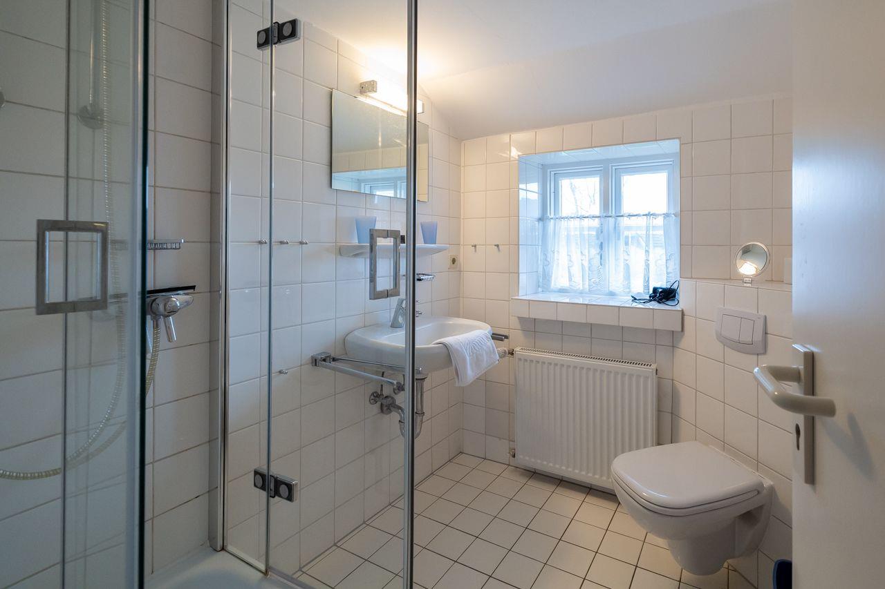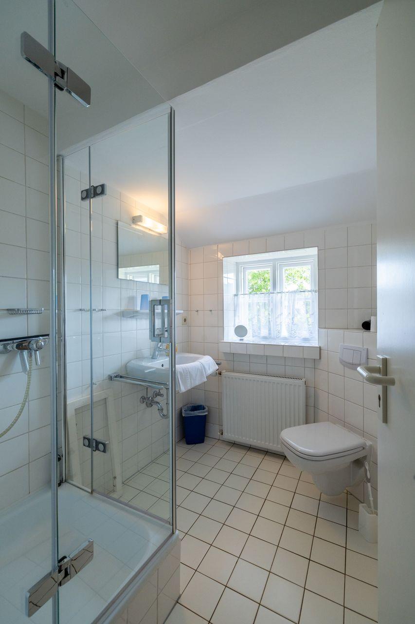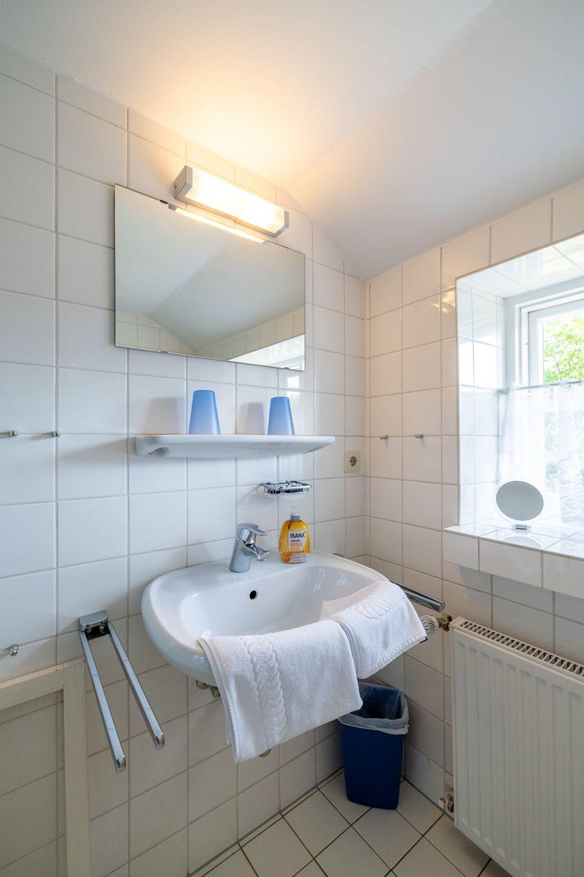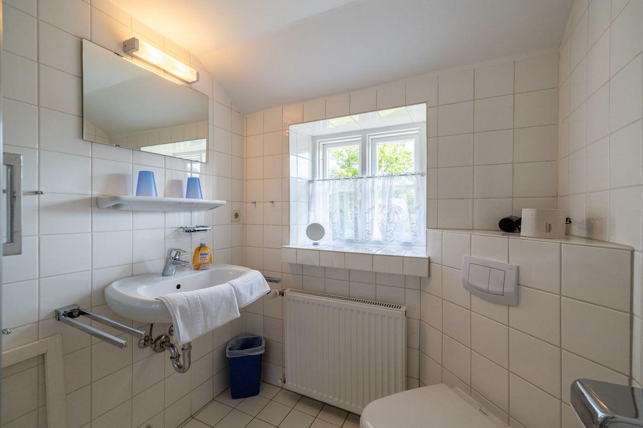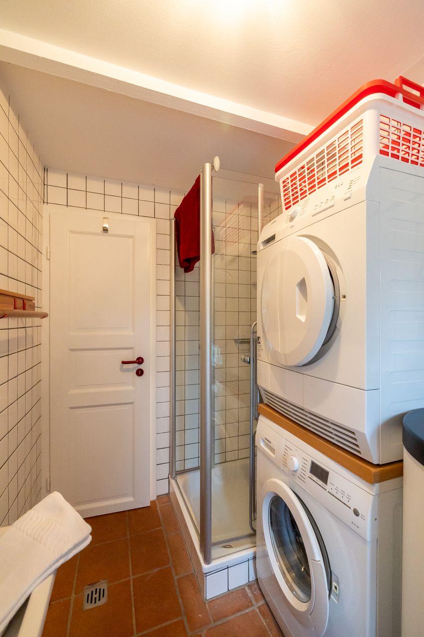 Das Badezimmer im Ferienhaus ist mit einer Dusche ausgestattet, die zusätzlich eine Wanne bietet – perfekt zum Entspannen nach einem ereignisreichen Tag. Ein Gäste-WC sorgt für zusätzlichen Komfort. Zu den weiteren Annehmlichkeiten zählen eine Gemeinschafts-Waschmaschine und ein Trockner, die Ihnen während Ihres Aufenthalts zur Verfügung stehen.