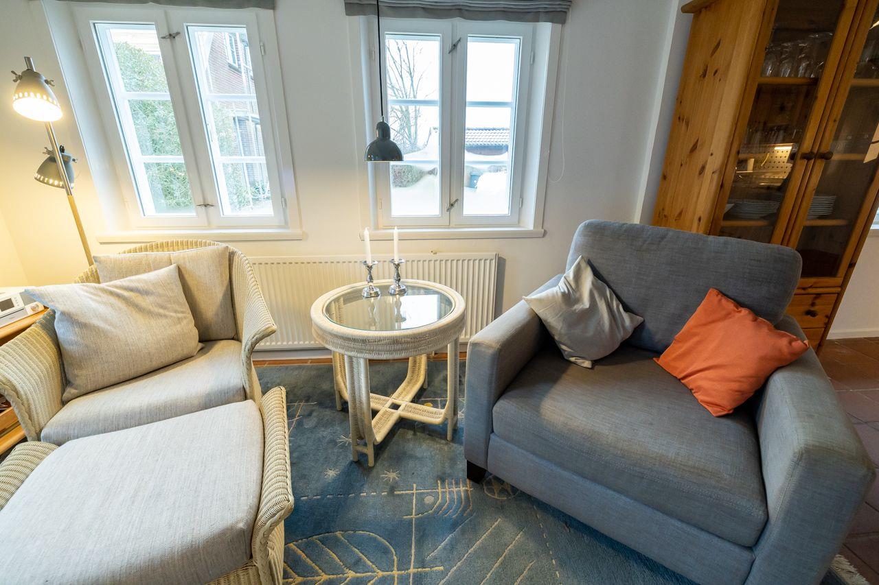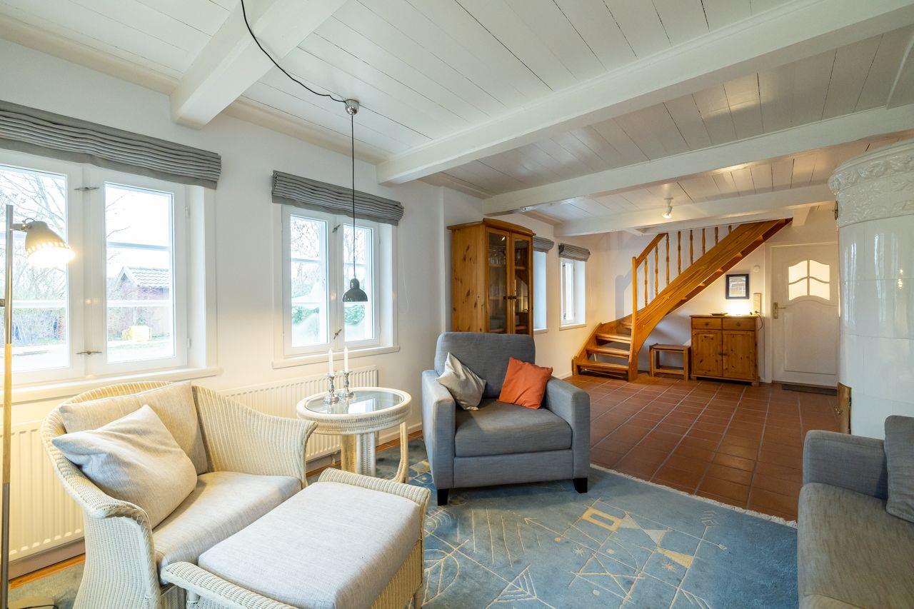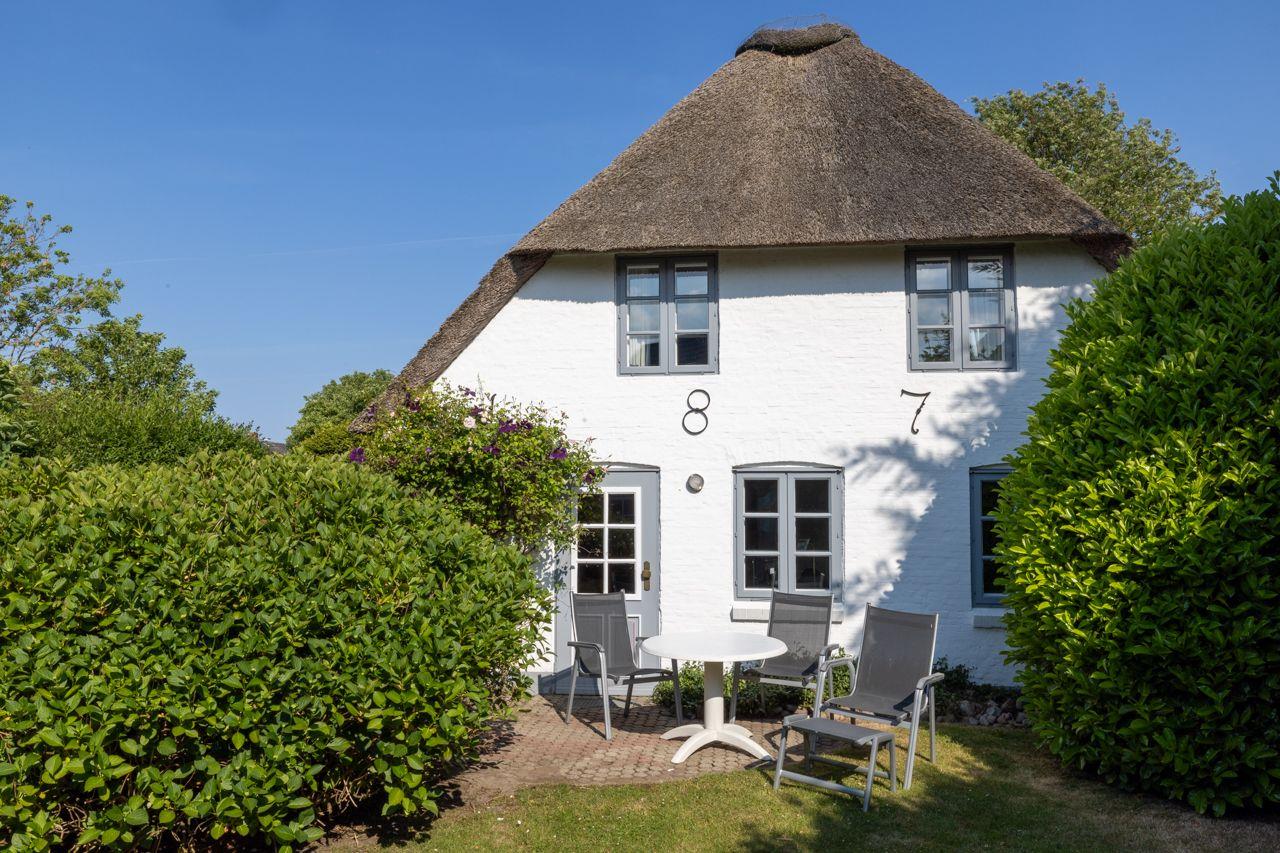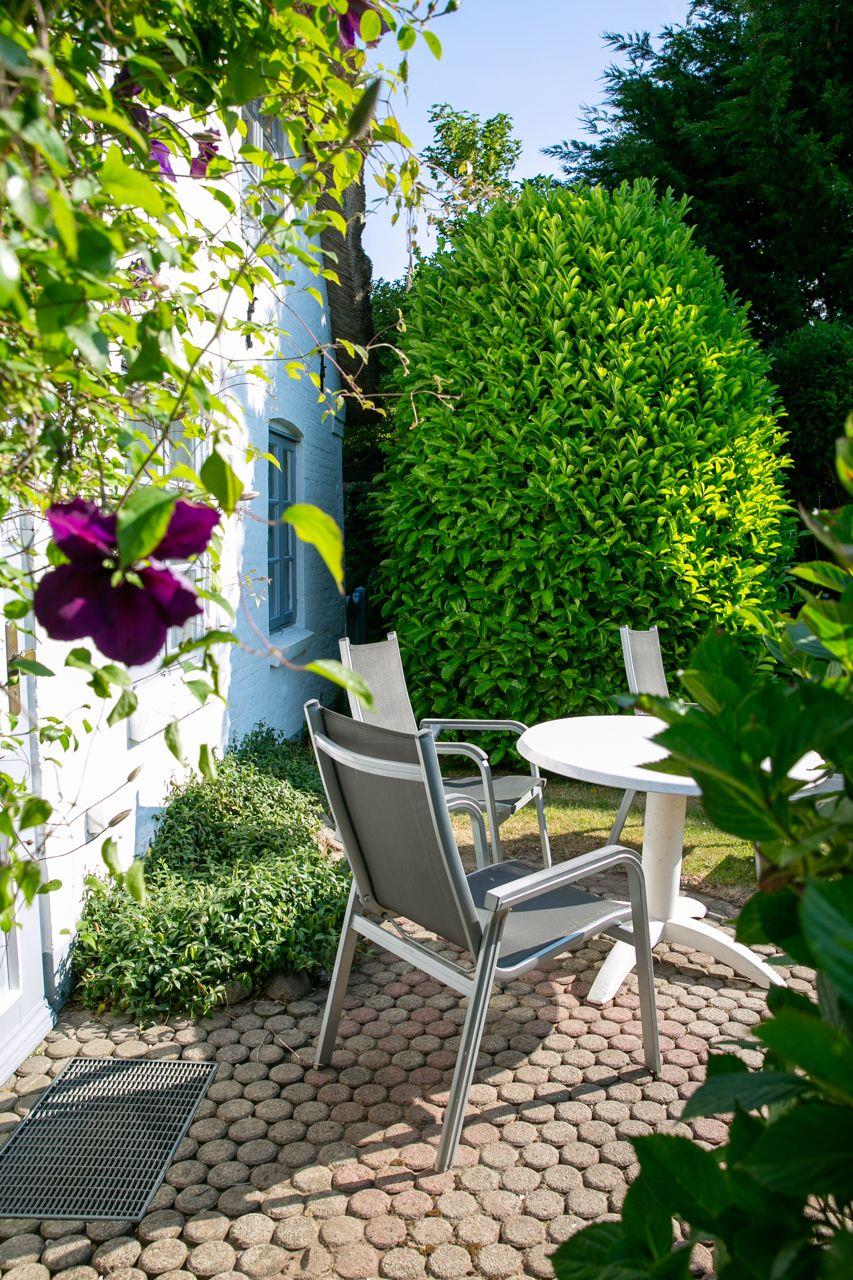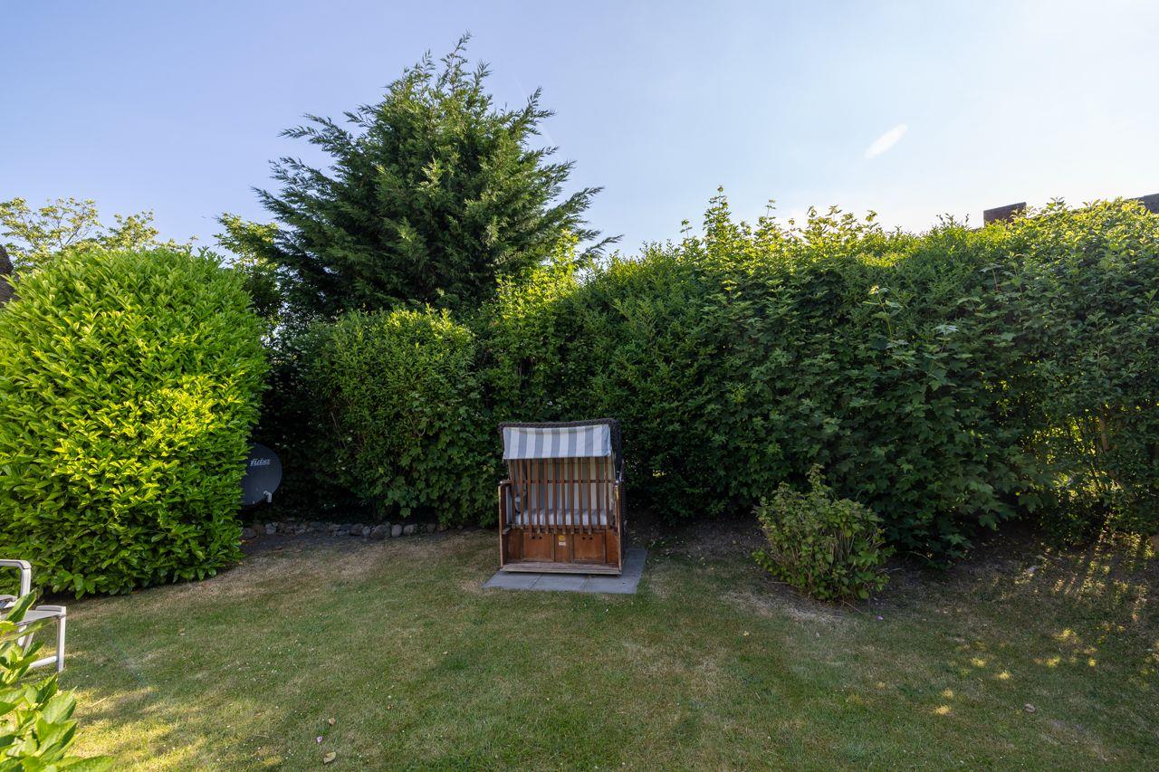 Der Außenbereich des Ferienhauses ist ein wahres Highlight. Hier erwarten Sie eine private Terrasse sowie ein gepflegter Garten mit Gartenmöbeln, Sonnenliegen und einem Strandkorb, wo Sie den Blick ins Grüne genießen können. Für Familien mit Kindern bietet die Liegewiese ausreichend Platz zum Spielen und Toben. Nach einem erlebnisreichen Tag am Strand können Sie sich gemütlich im Garten entspannen und die Seele baumeln lassen.