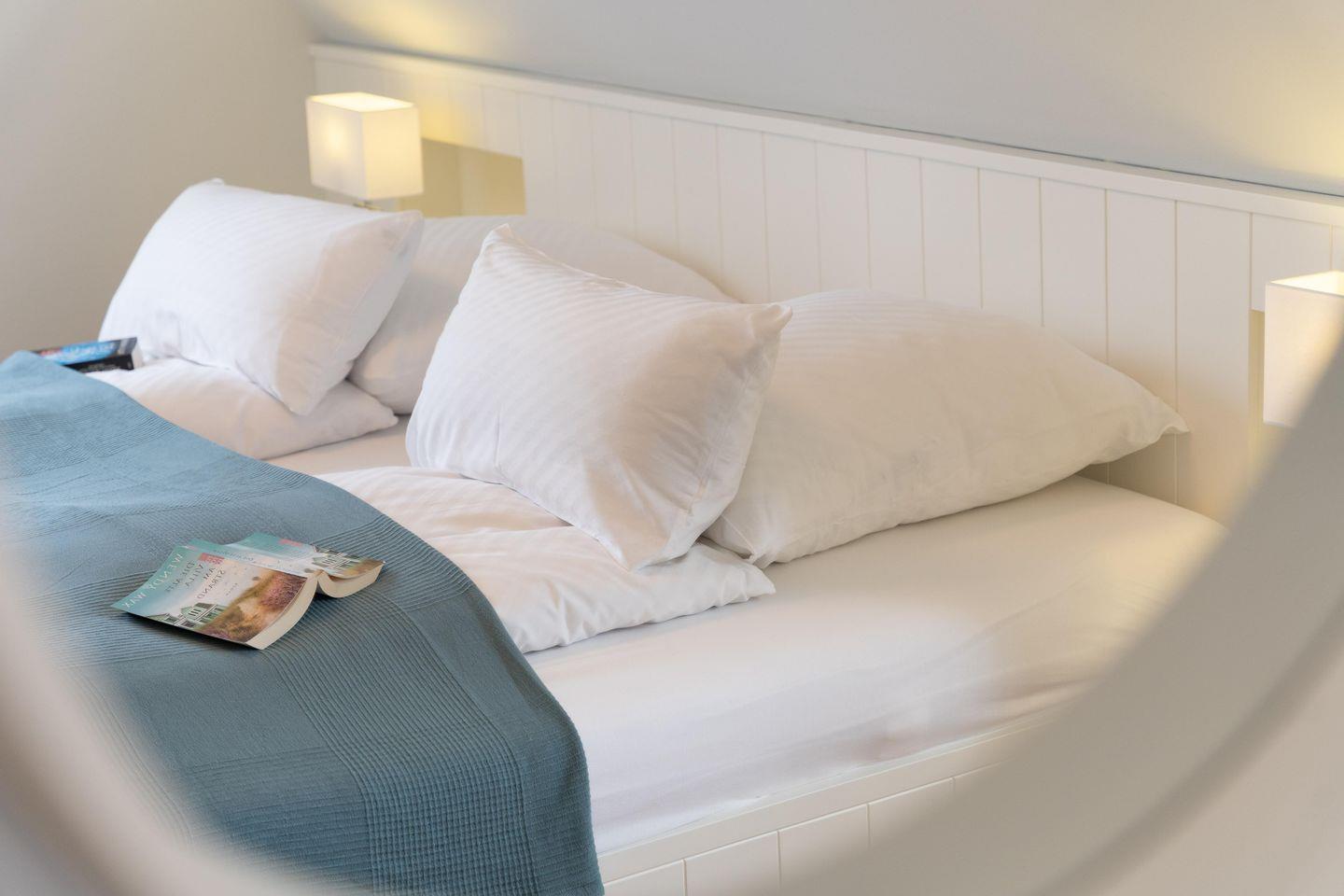 Im Obergeschoss befindet sich ein Schlafzimmer mit Doppelbett (2,00m x 2,00m) und einem en-suite Bad mit Dusche. Im großzügigen Masterbedroom (Doppelbett 2,00m x 2,00m) mit Récamière und Lesesessel befindet sich auch ein Arbeitsbereich. Direkt nebenan liegt ein weiteres Bad mit Dusche und Badewanne.