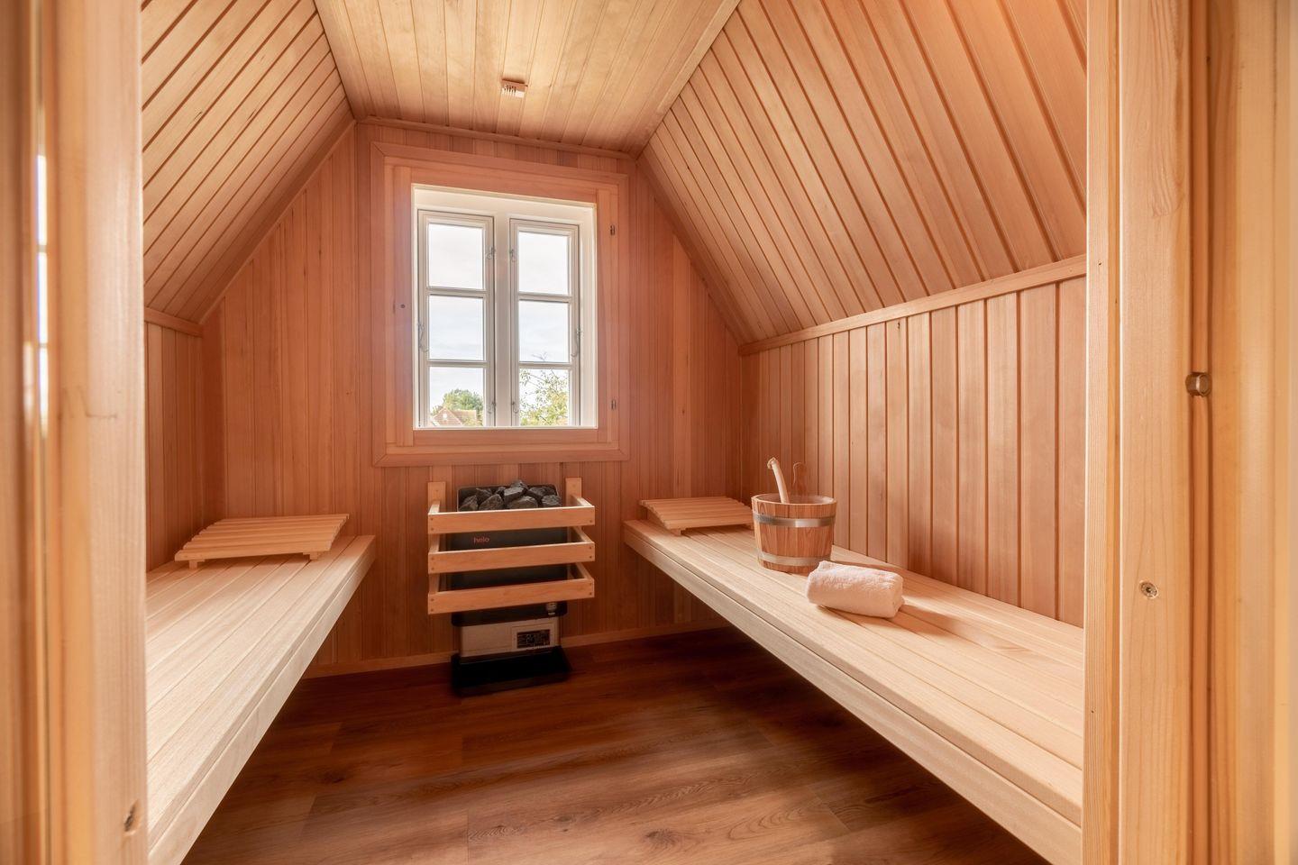 Das hohe Dachgeschoss strahlt nordisch noble Gemütlichkeit aus und lädt mit Sauna und zwei Relax-Sesseln im Ruhebereich zur Urlaubsentspannung ein. Ein großzügiger Schlafbereich mit Doppelbett (2,00m x 2,00m) befindet sich ebenfalls im Dachgeschoss.