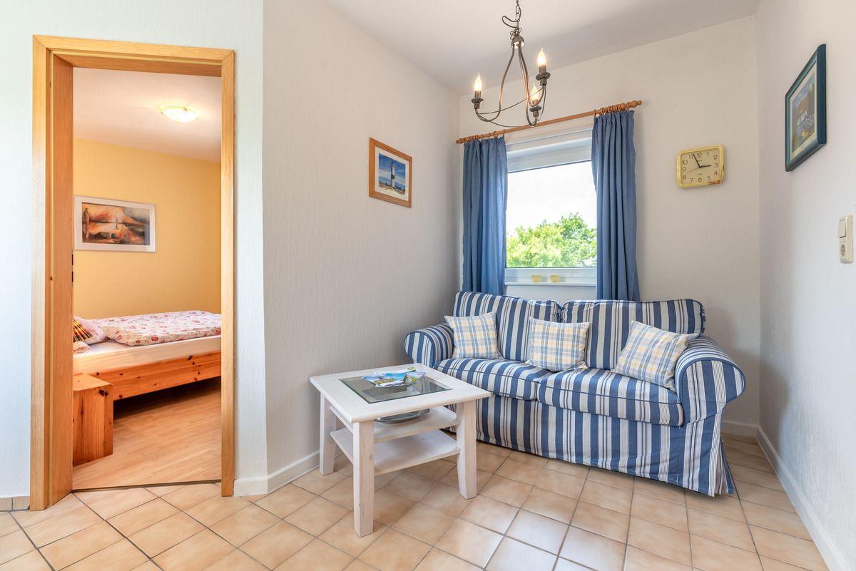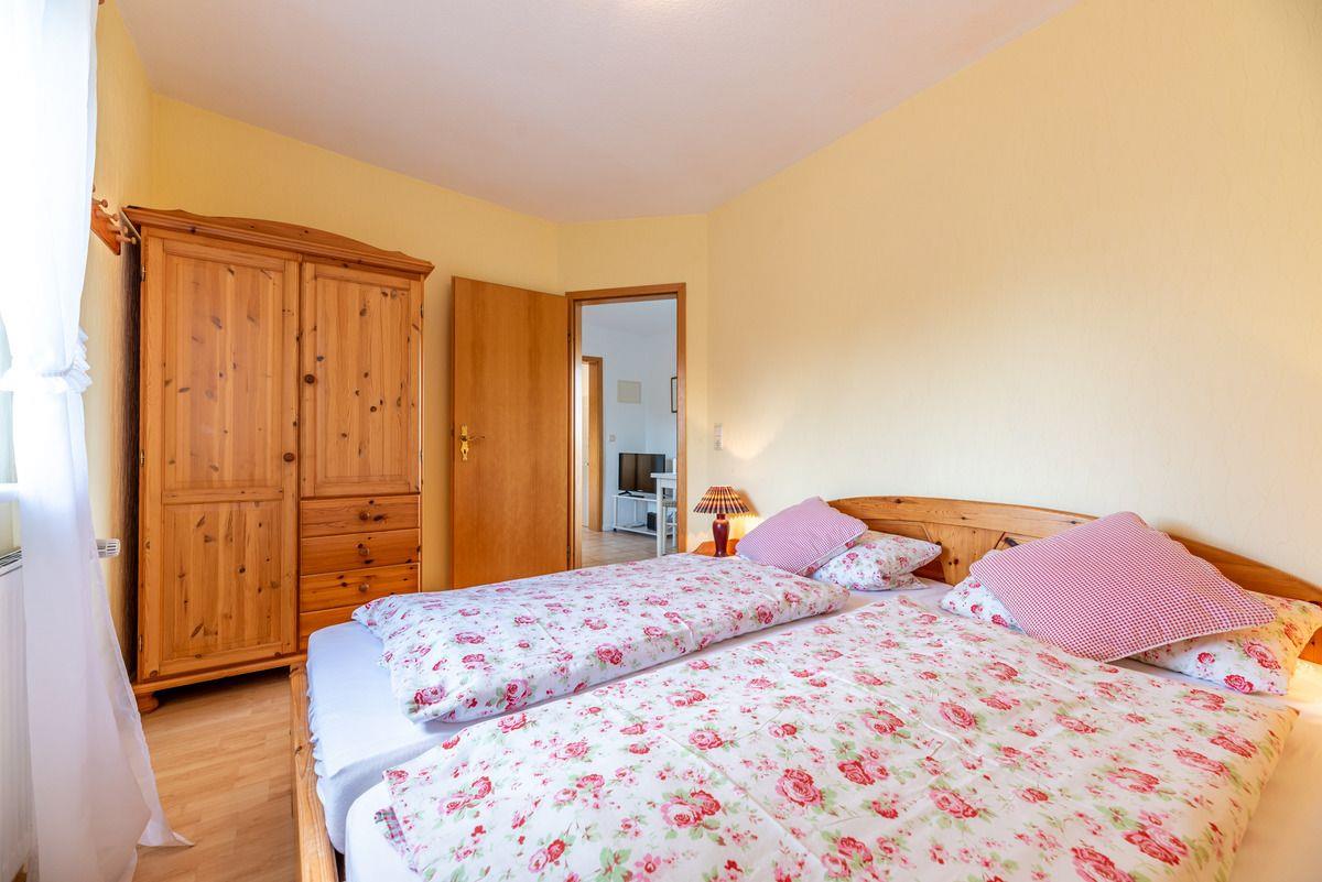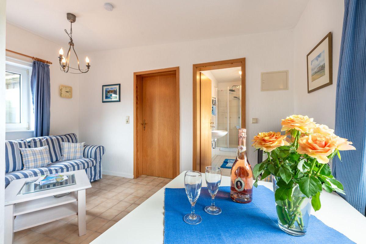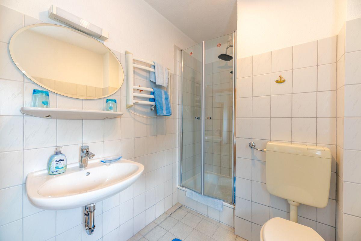 Über den Hofplatz erreichen Sie den Hausflur, der zu den Ferienwohnungen 1-3 im Obergeschoss führt. Diese Ferienwohnung umfasst ein Duschbad mit WC, eine offene Wohnküche sowie ein Schlafzimmer.