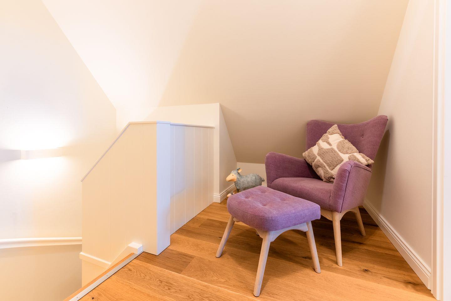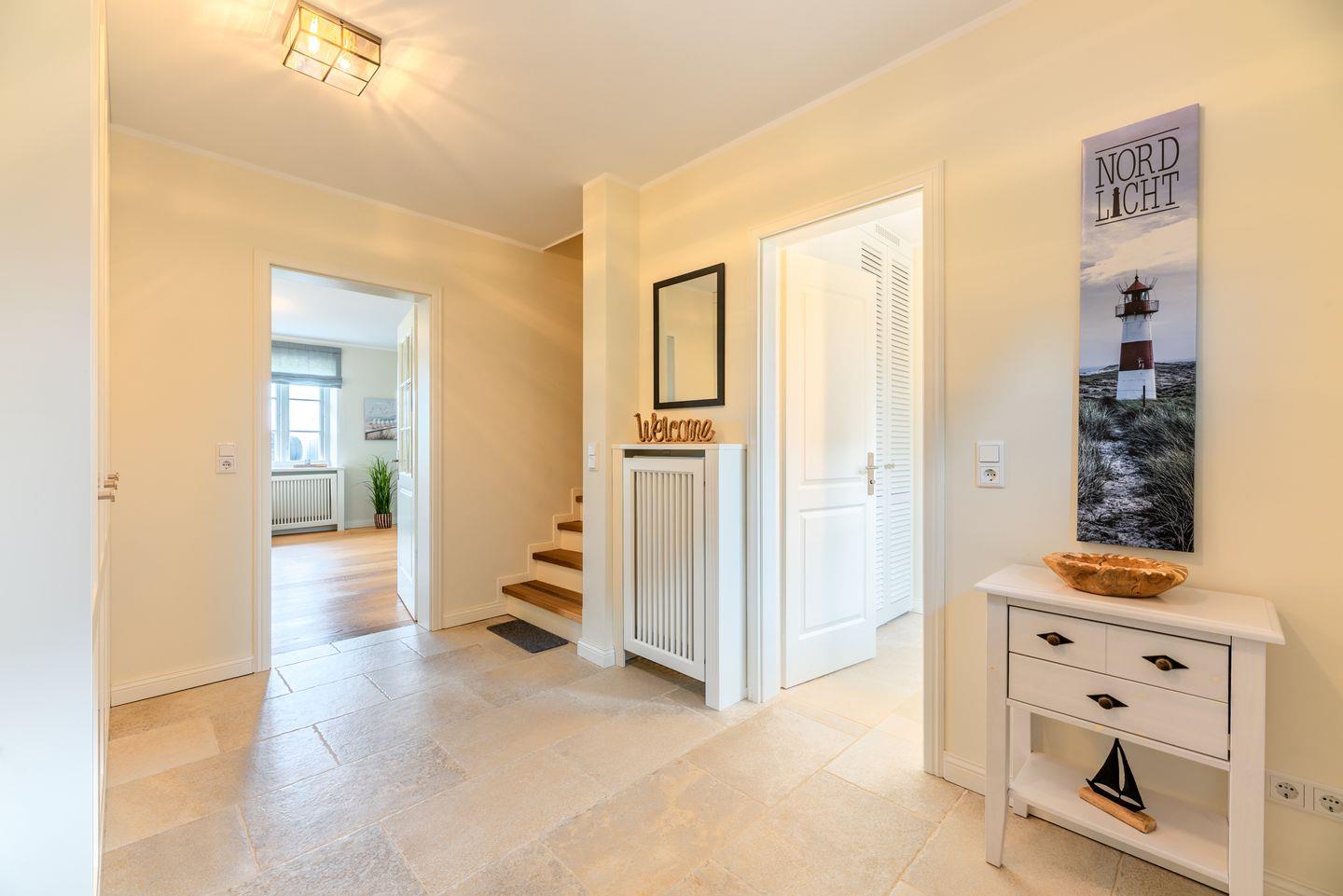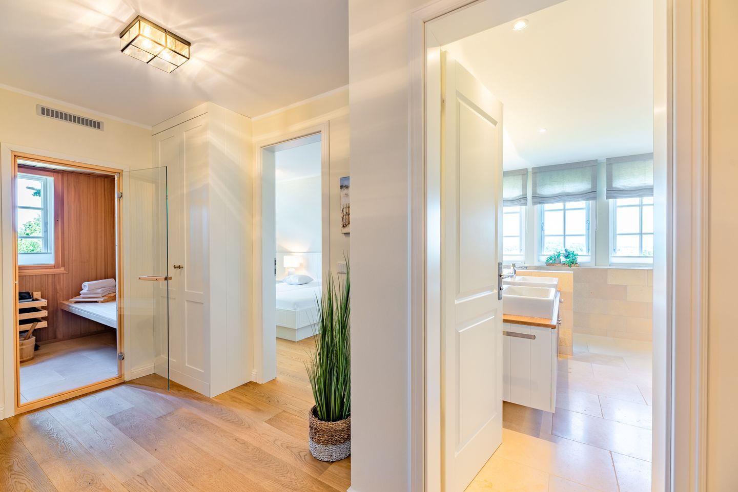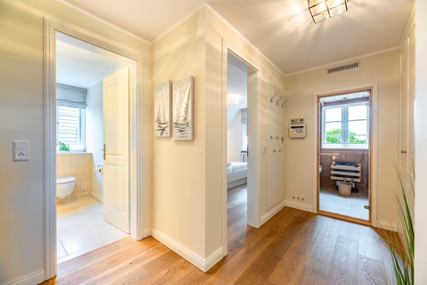 Ein großzügiger Flur sorgt für Übersichtlichkeit. Im Obergeschoss befinden sich zwei liebevoll gestaltete Schlafzimmer mit je einem Doppelbett, ausgestattet mit Einbauschränken für erholsamen Schlaf und jeweils einem Fernseher. Beide Zimmer verfügen über Verdunklungsplissees. Des Weiteren stehen zwei moderne Duschbäder mit ebenerdiger Dusche und WC zur Verfügung – eines davon ist zusätzlich mit einer Badewanne ausgestattet. Eine separate Sauna rundet das Angebot ab.