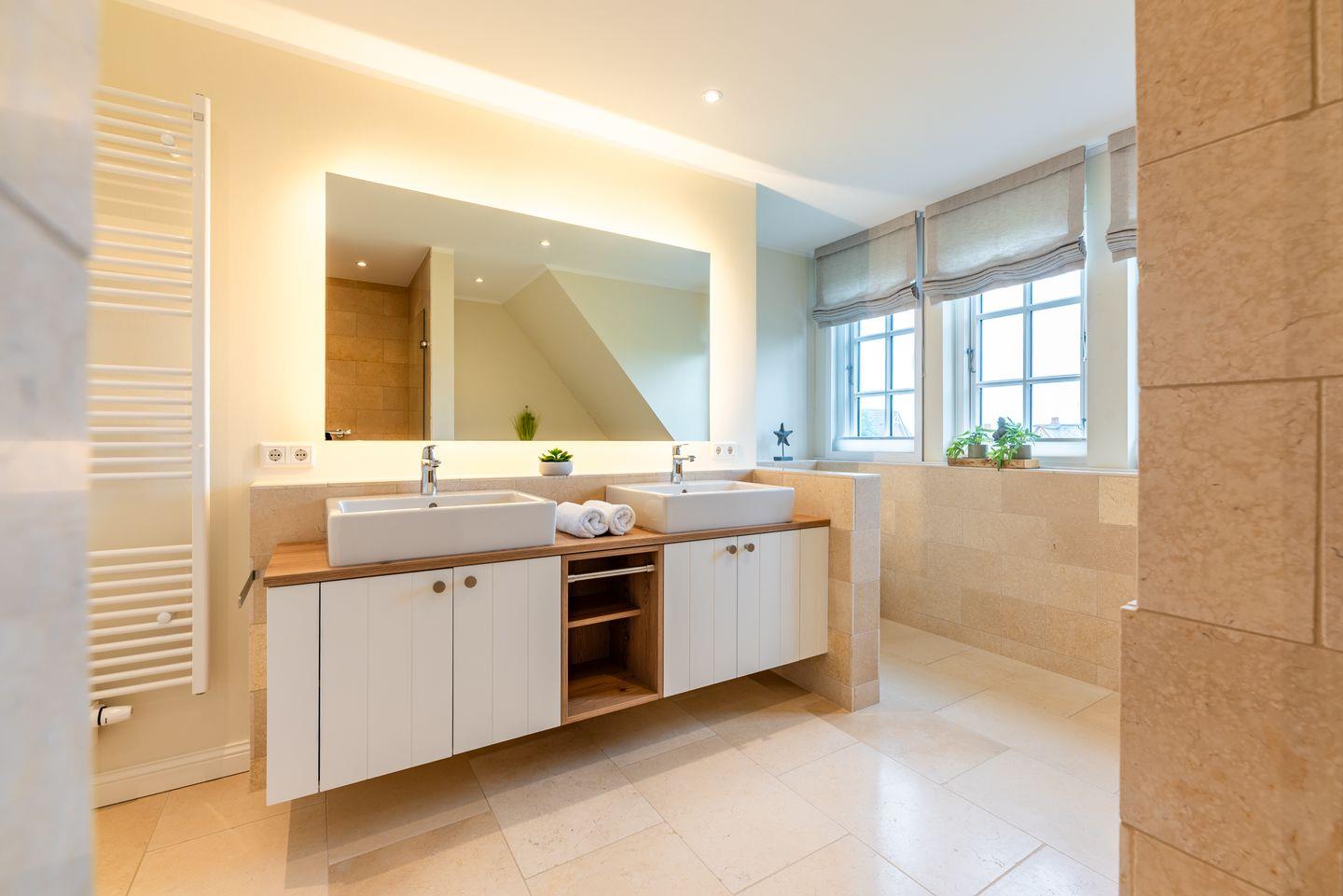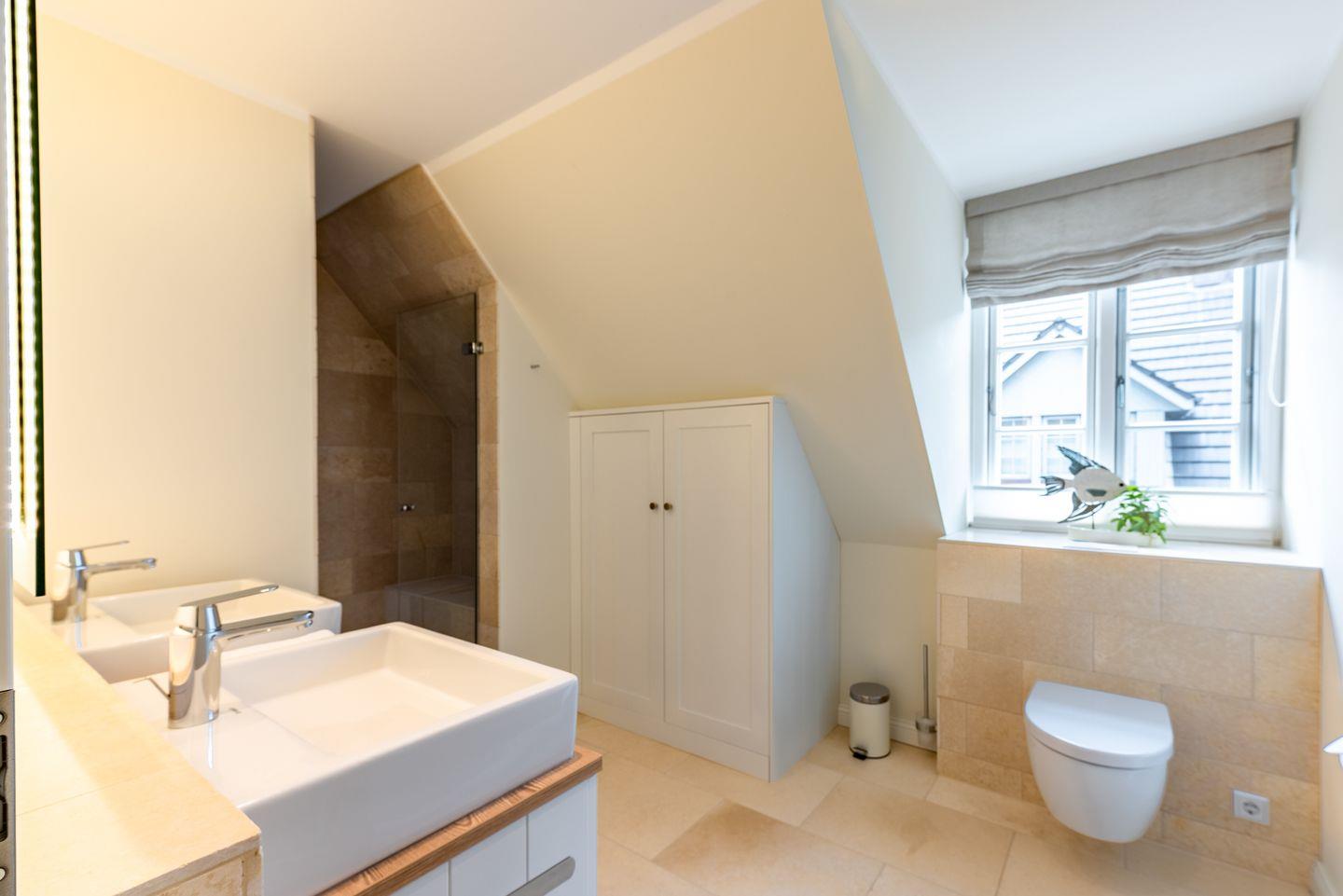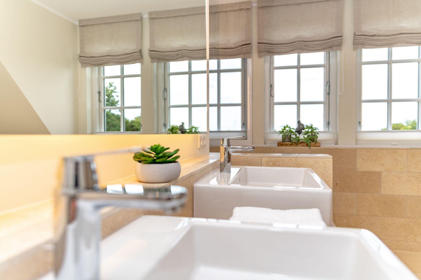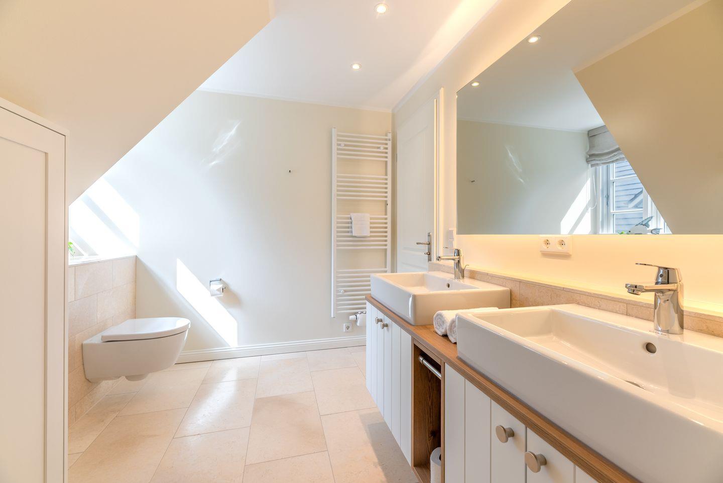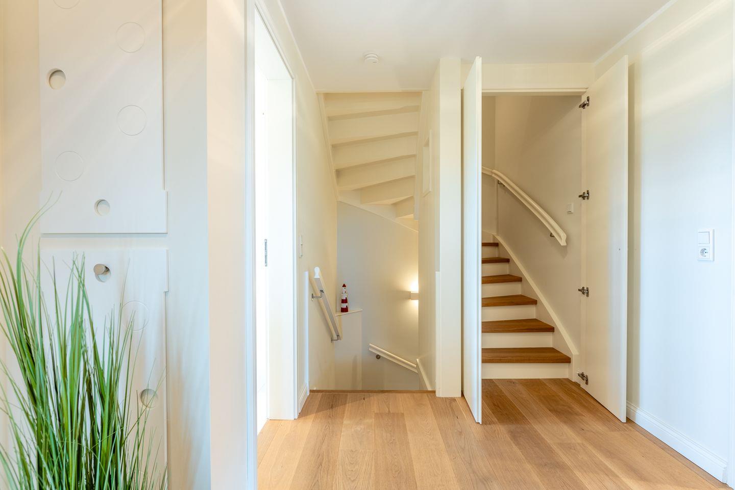Ein großzügiger Flur sorgt für Übersichtlichkeit. Im Obergeschoss befinden sich zwei liebevoll gestaltete Schlafzimmer mit je einem Doppelbett, ausgestattet mit Einbauschränken für erholsamen Schlaf und jeweils einem Fernseher. Beide Zimmer verfügen über Verdunklungsplissees. Des Weiteren stehen zwei moderne Duschbäder mit ebenerdiger Dusche und WC zur Verfügung – eines davon ist zusätzlich mit einer Badewanne ausgestattet. Eine separate Sauna rundet das Angebot ab.