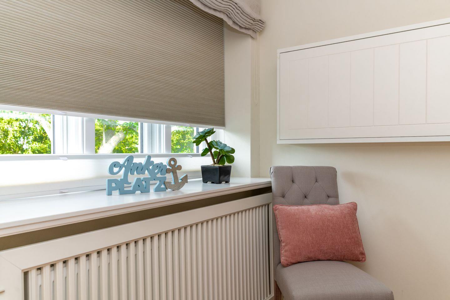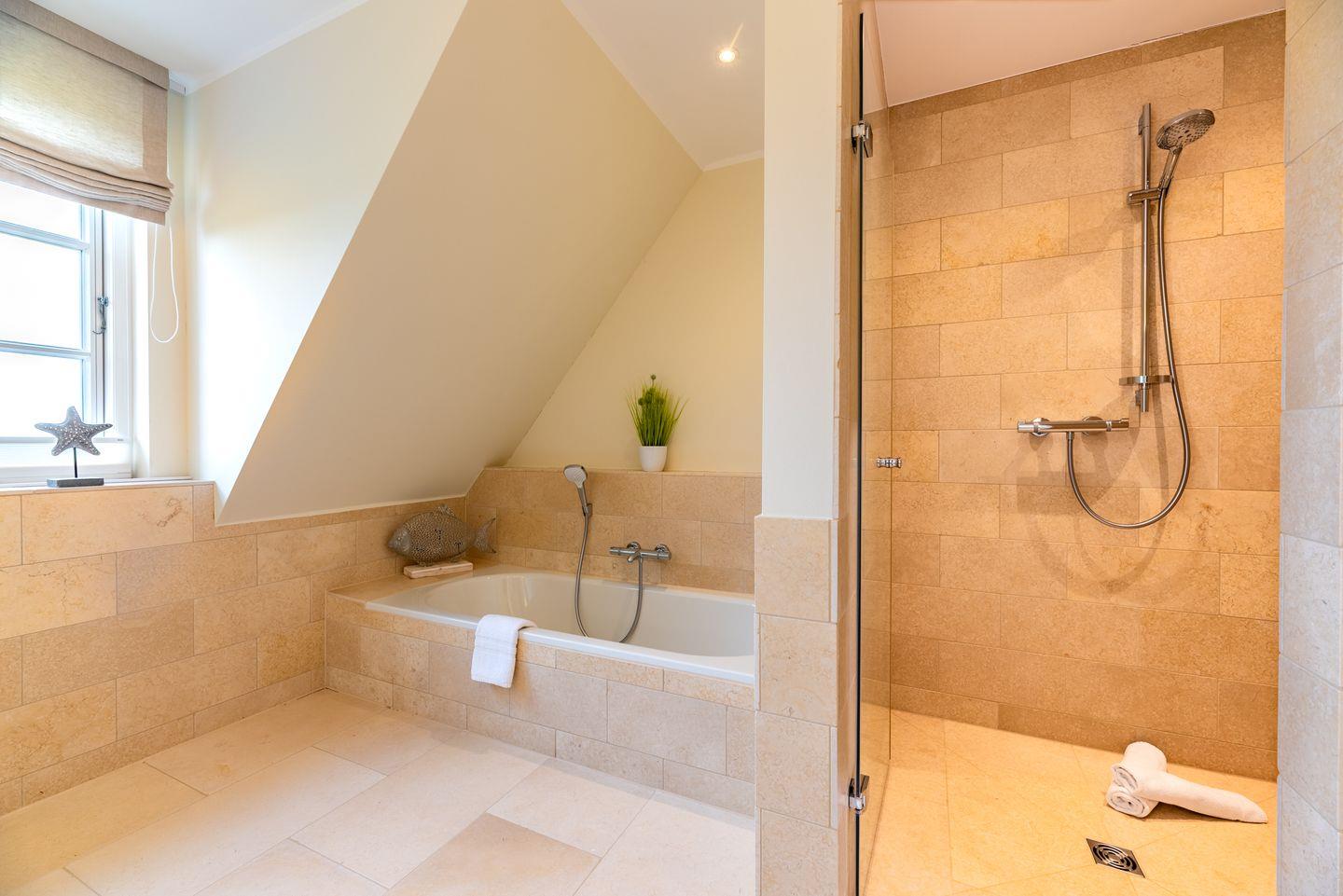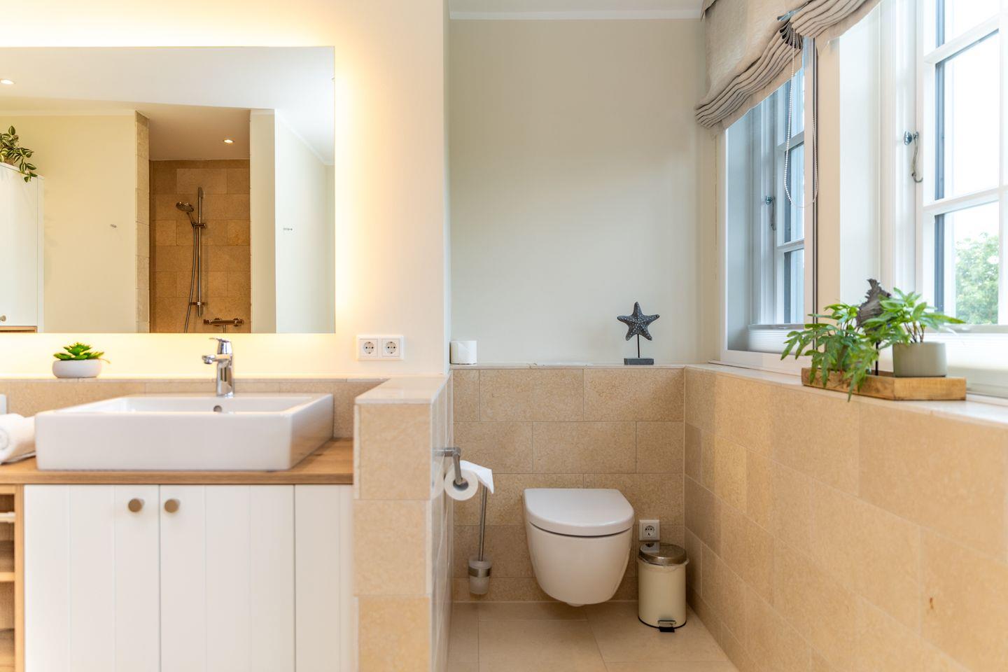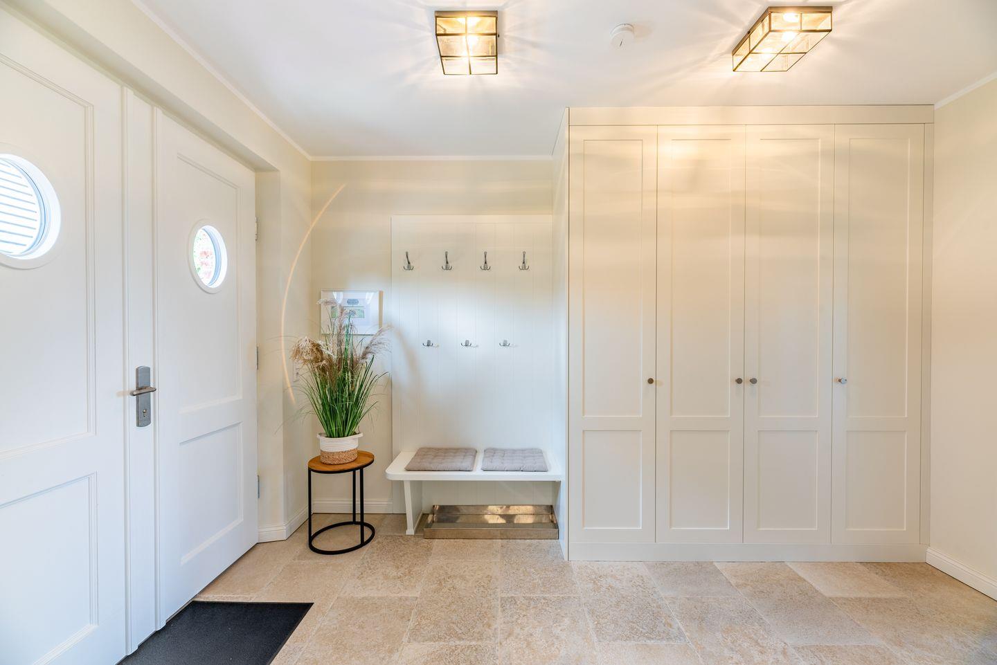 Ein großzügiger Flur sorgt für Übersichtlichkeit. Im Obergeschoss befinden sich zwei liebevoll gestaltete Schlafzimmer mit je einem Doppelbett, ausgestattet mit Einbauschränken für erholsamen Schlaf und jeweils einem Fernseher. Beide Zimmer verfügen über Verdunklungsplissees. Des Weiteren stehen zwei moderne Duschbäder mit ebenerdiger Dusche und WC zur Verfügung – eines davon ist zusätzlich mit einer Badewanne ausgestattet. Eine separate Sauna rundet das Angebot ab.