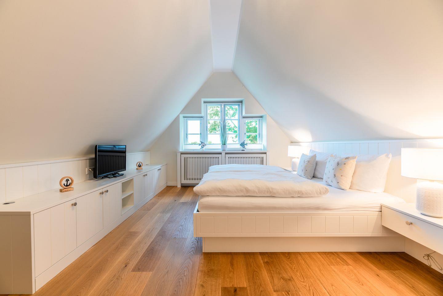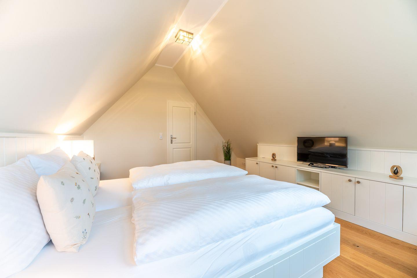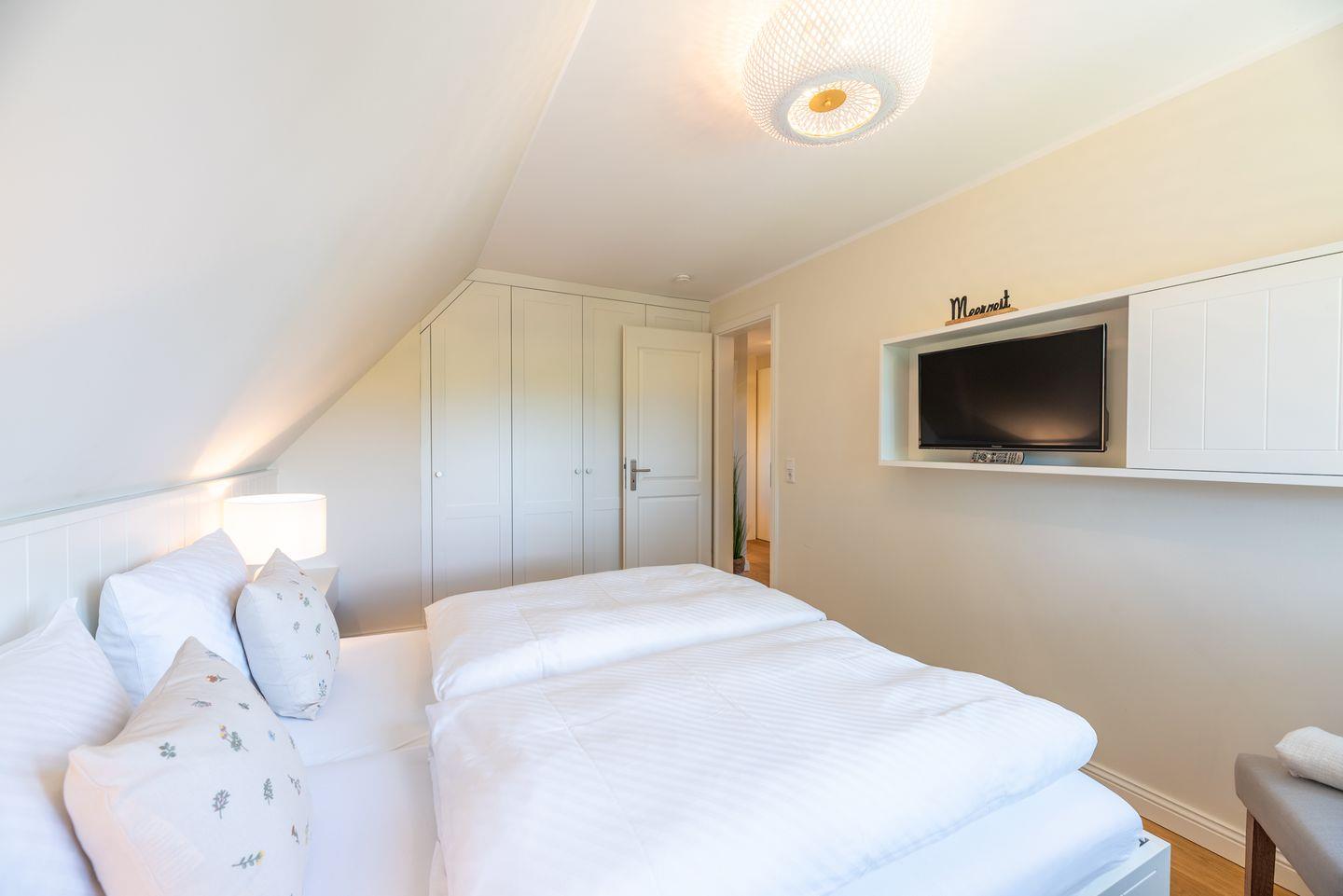 Im Dachgeschoss befindet sich ein weiteres Schlafzimmer (3) mit Doppelbett (für 2 Personen), eigenem TV und Ankleidezimmer.