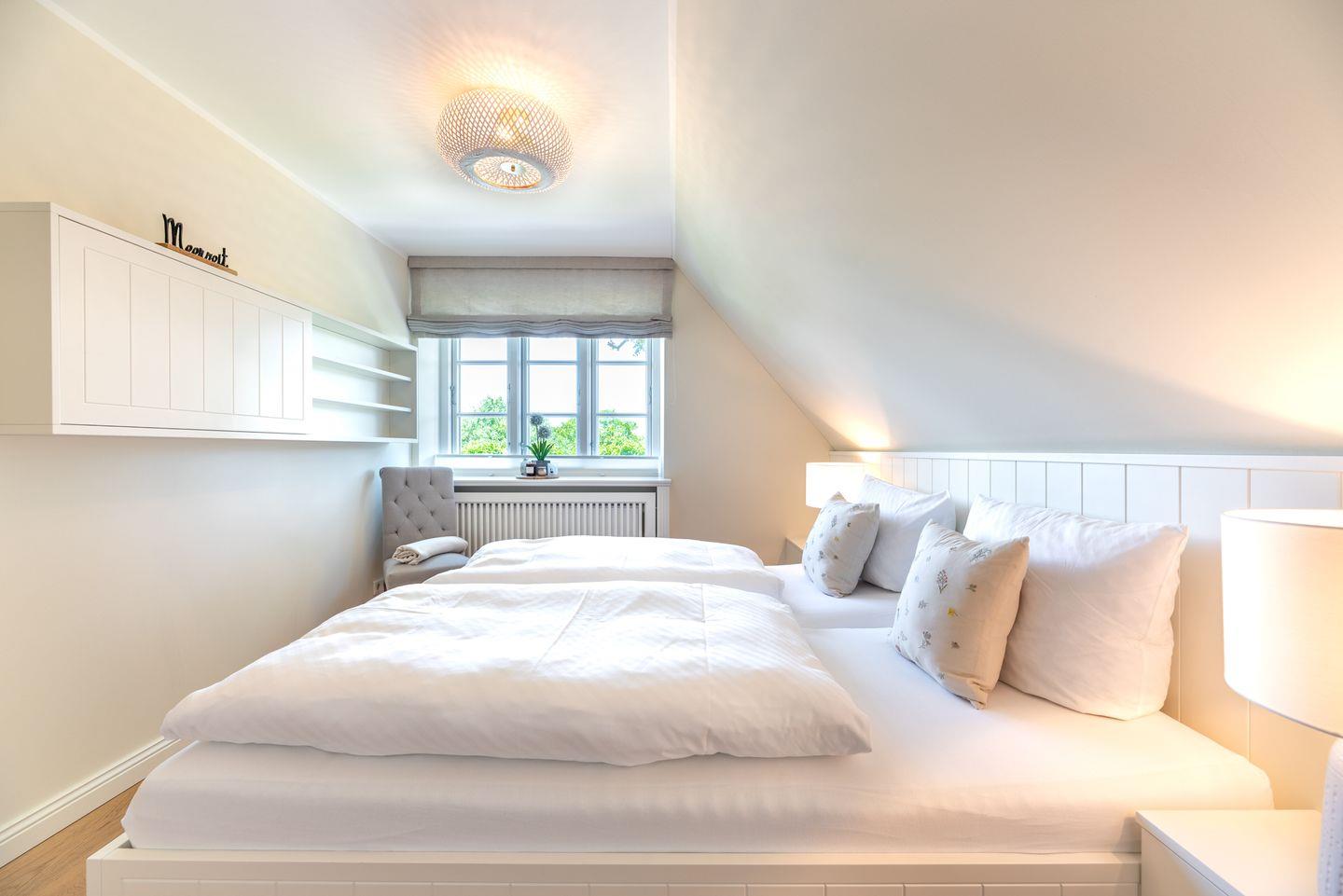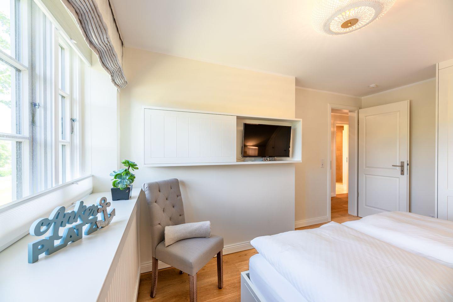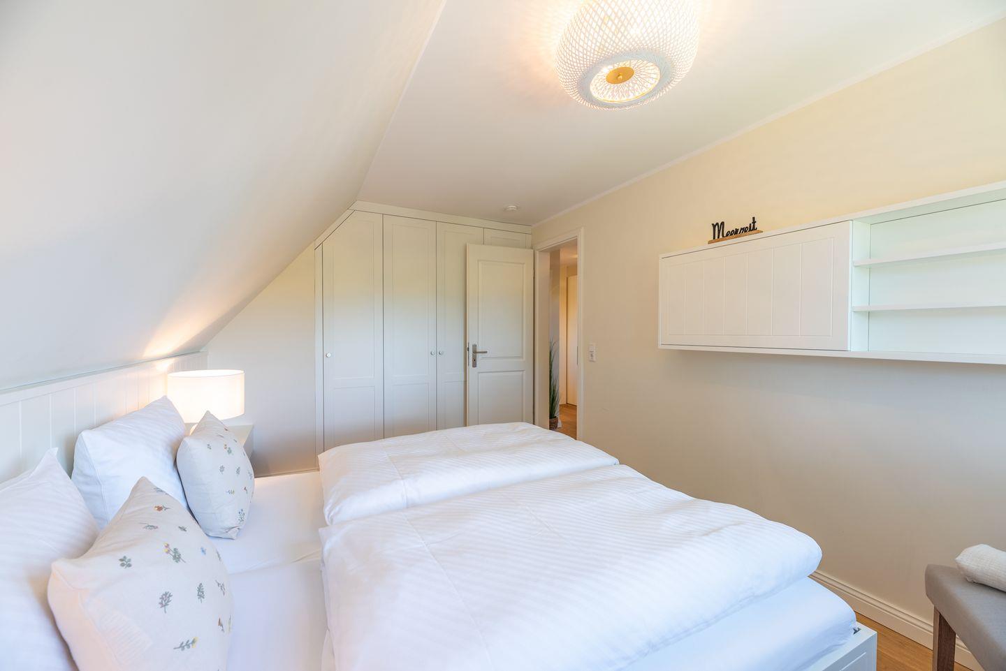 Im Dachgeschoss befindet sich ein weiteres Schlafzimmer (3) mit Doppelbett (für 2 Personen), eigenem TV und Ankleidezimmer.
