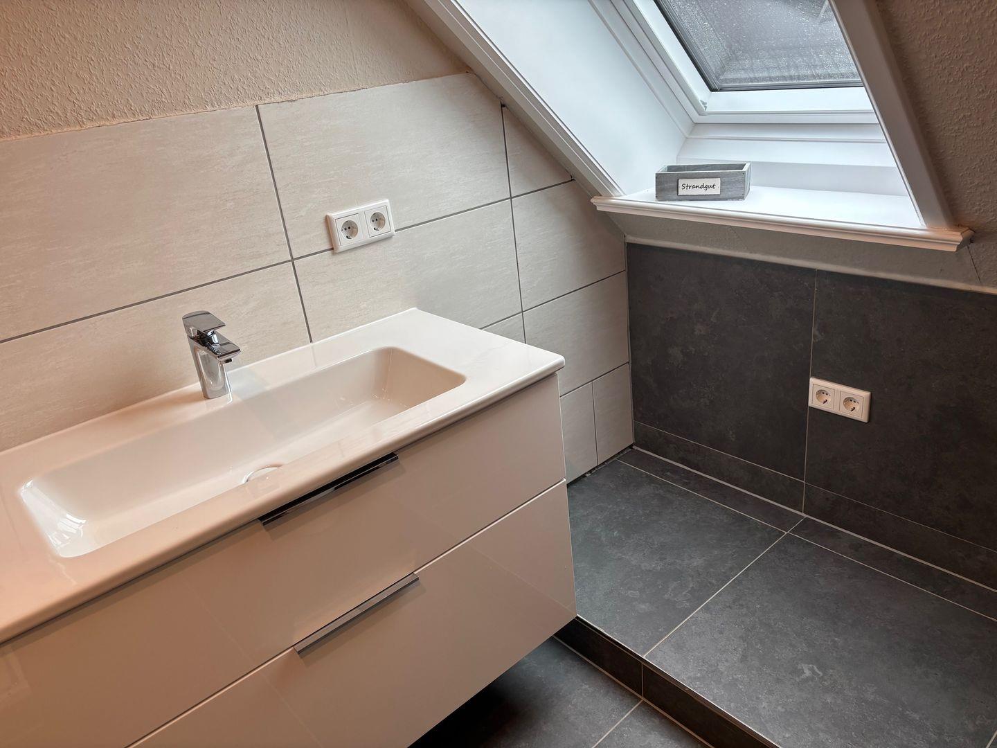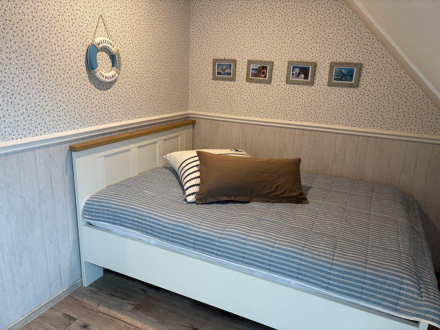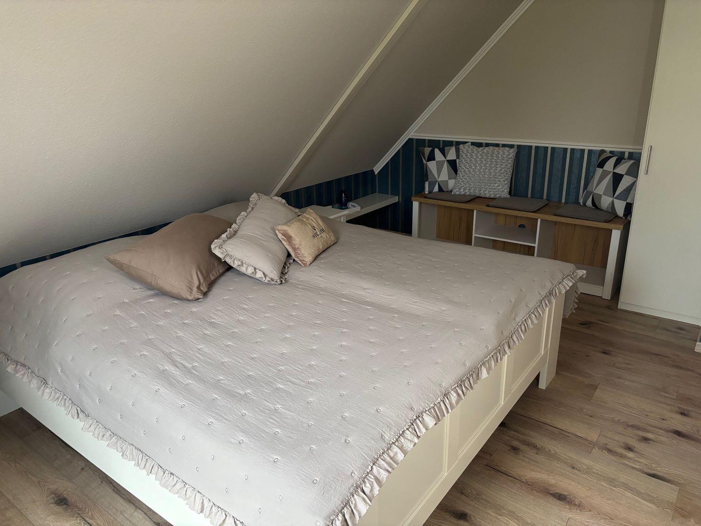 Die Unterkunft verfügt über zwei gemütliche Schlafzimmer: eines mit einem Doppelbett (180x200 cm) und und ein weiteres mit einem Doppelbett (140×190 cm). Damit eignet sich die Wohnung ideal für Paare, Familien oder Freunde, die gemeinsam Urlaub auf Föhr machen möchten. Das moderne Badezimmer ist mit einer ebenerdigen Dusche ausgestattet und verfügt zusätzlich über einen Waschtrockner, was besonders bei längeren Aufenthalten sehr praktisch ist.