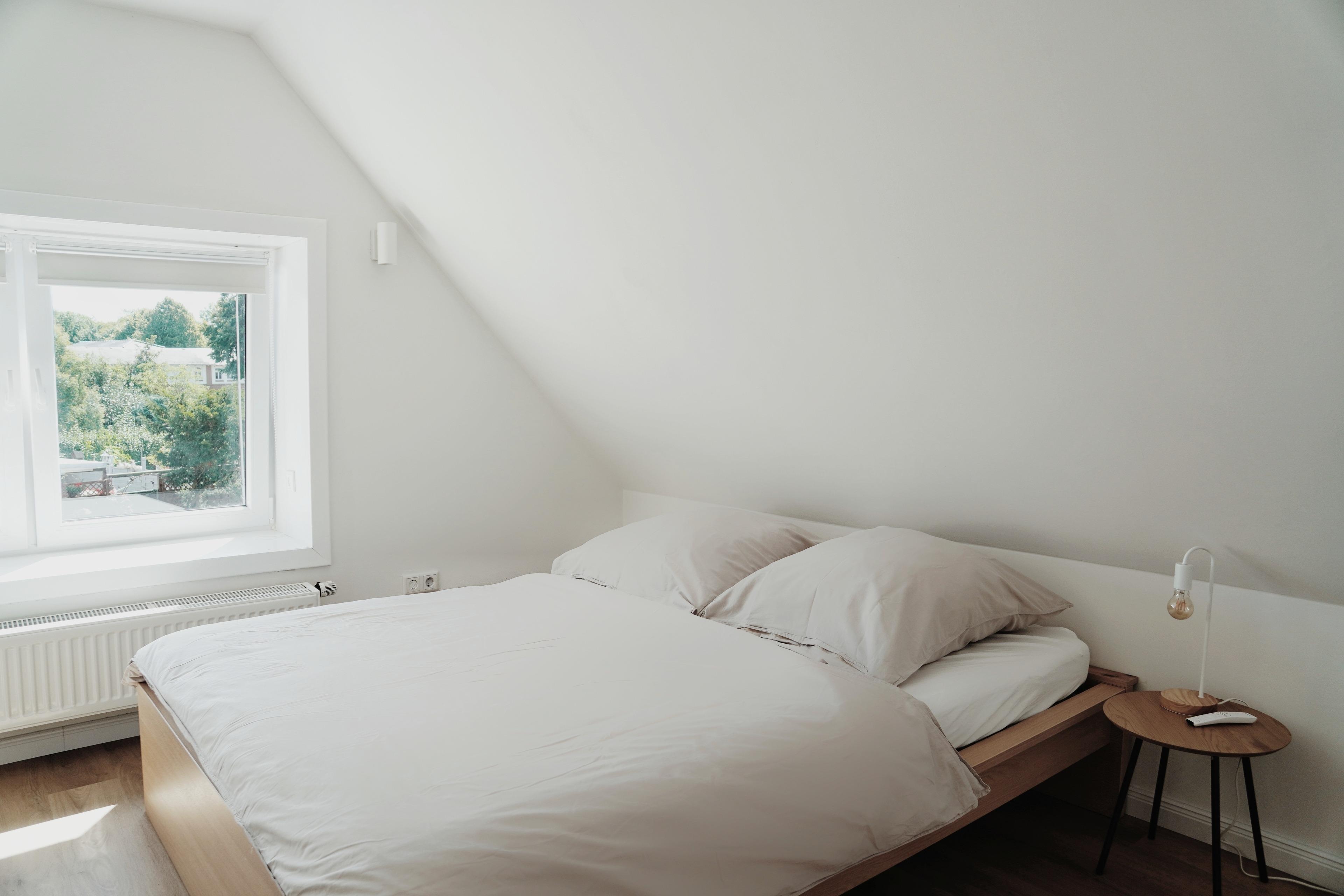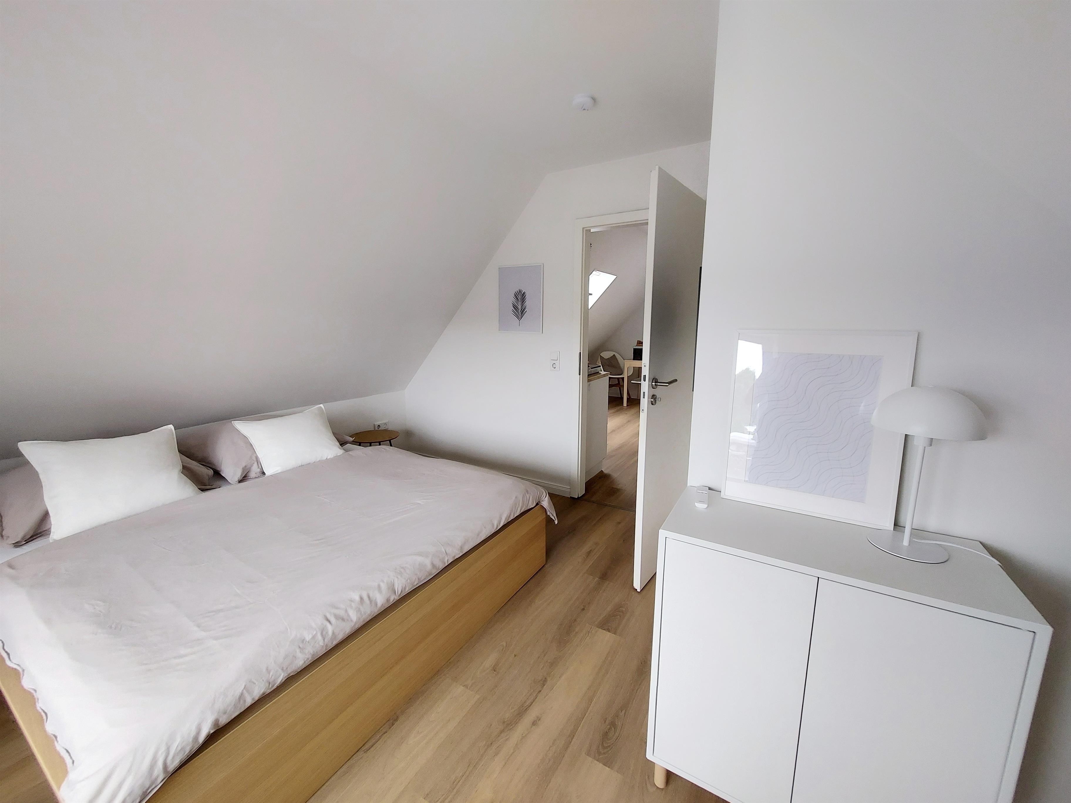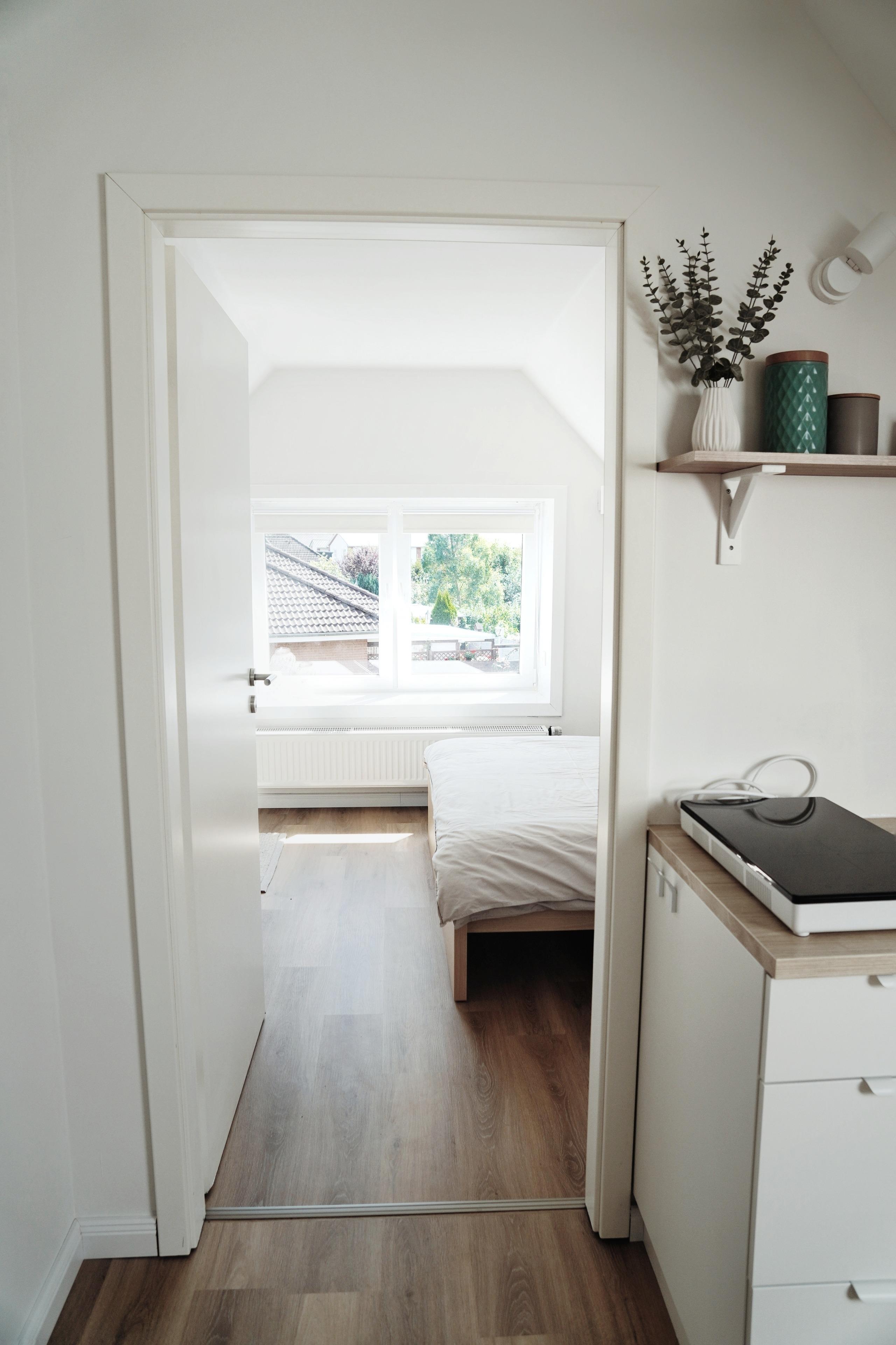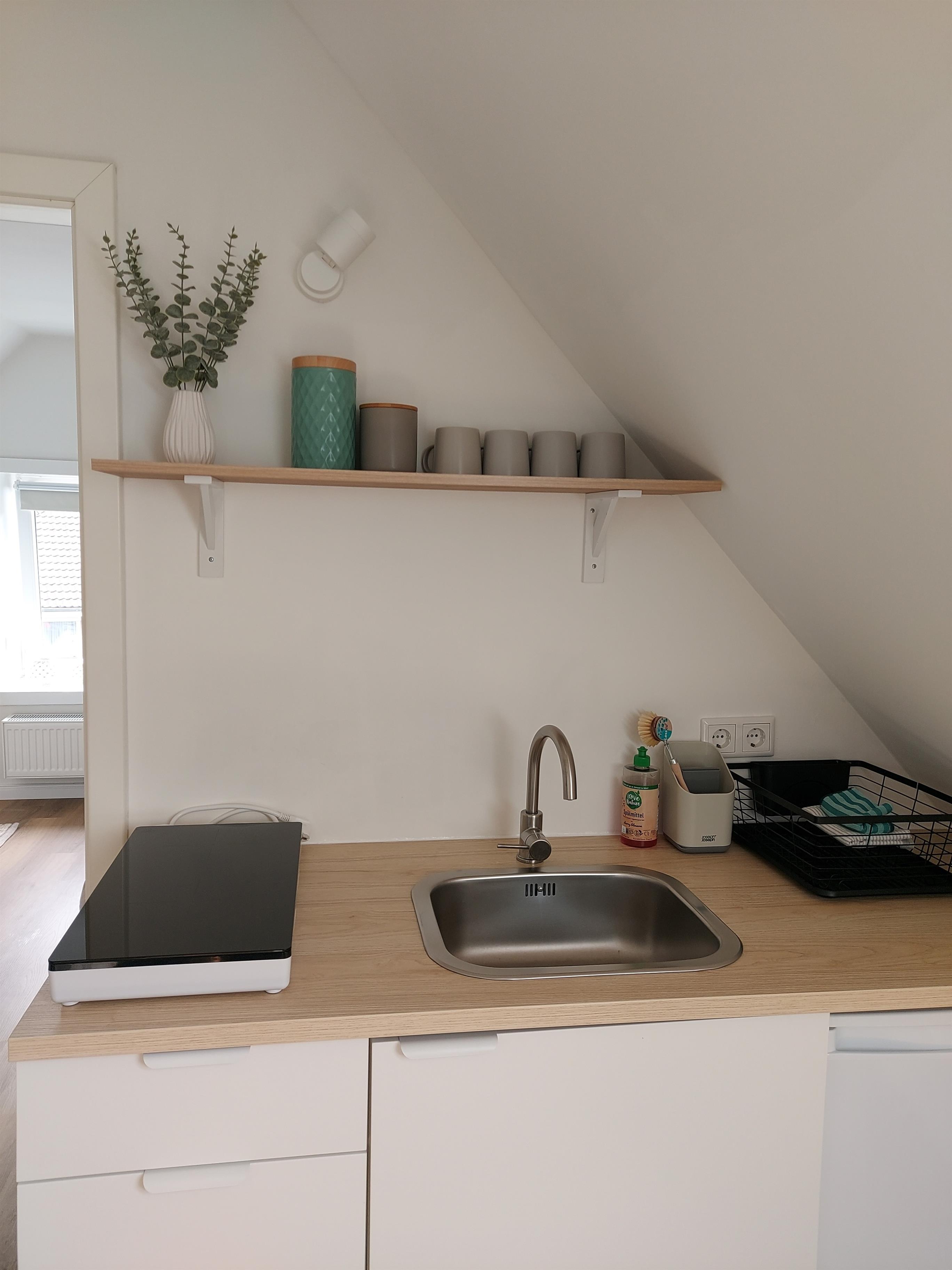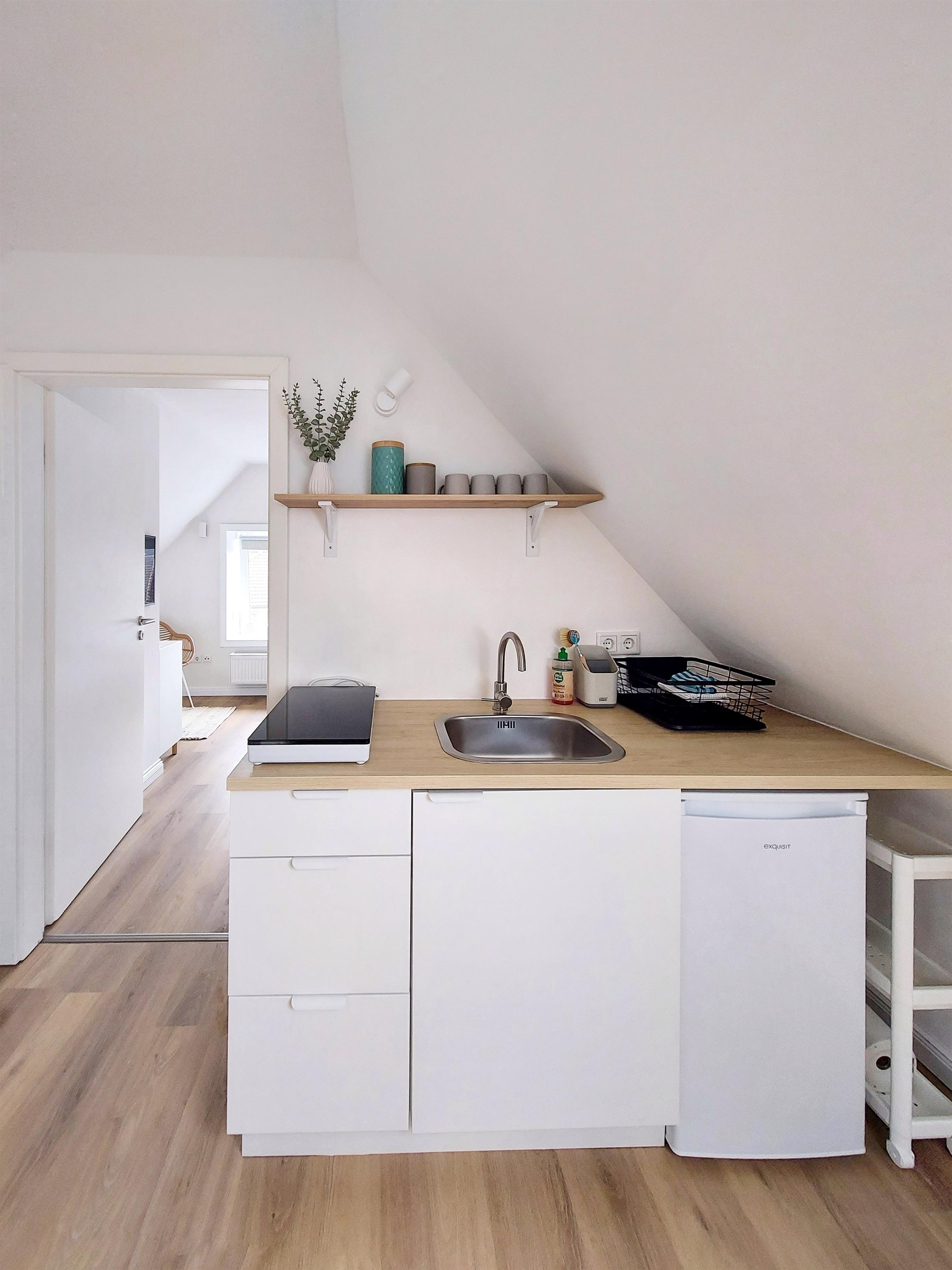 Ein Schlafzimmer mit einem gemütlichen, neuen 160 cm Bett, eine kleine Küche, mit zwei Induktionsplatten und gemütlicher Essecke, sowie ein kleines Duschbad.