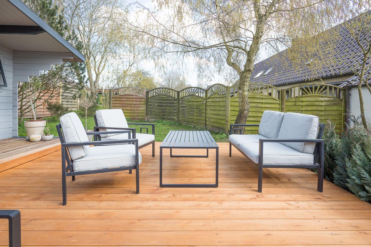 Auf der geschützten Terrasse stehen für Sie Gartenmöbel, Grill und Liegen bereit.
