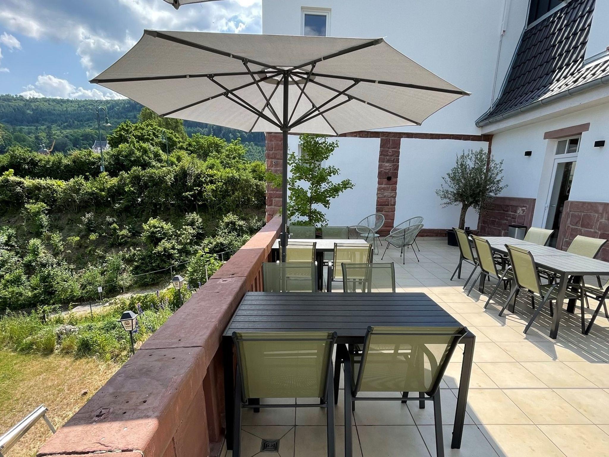 Von der großen gemeinsam genutzten Terrasse genießt Du den traumhaften Blick auf die Altstadt von Miltenberg und auf den Main mit seinen passierenden Schiffen. Einfach mal die Seele baumeln lassen und bei einem guten Glas Wein den Tag genießen.