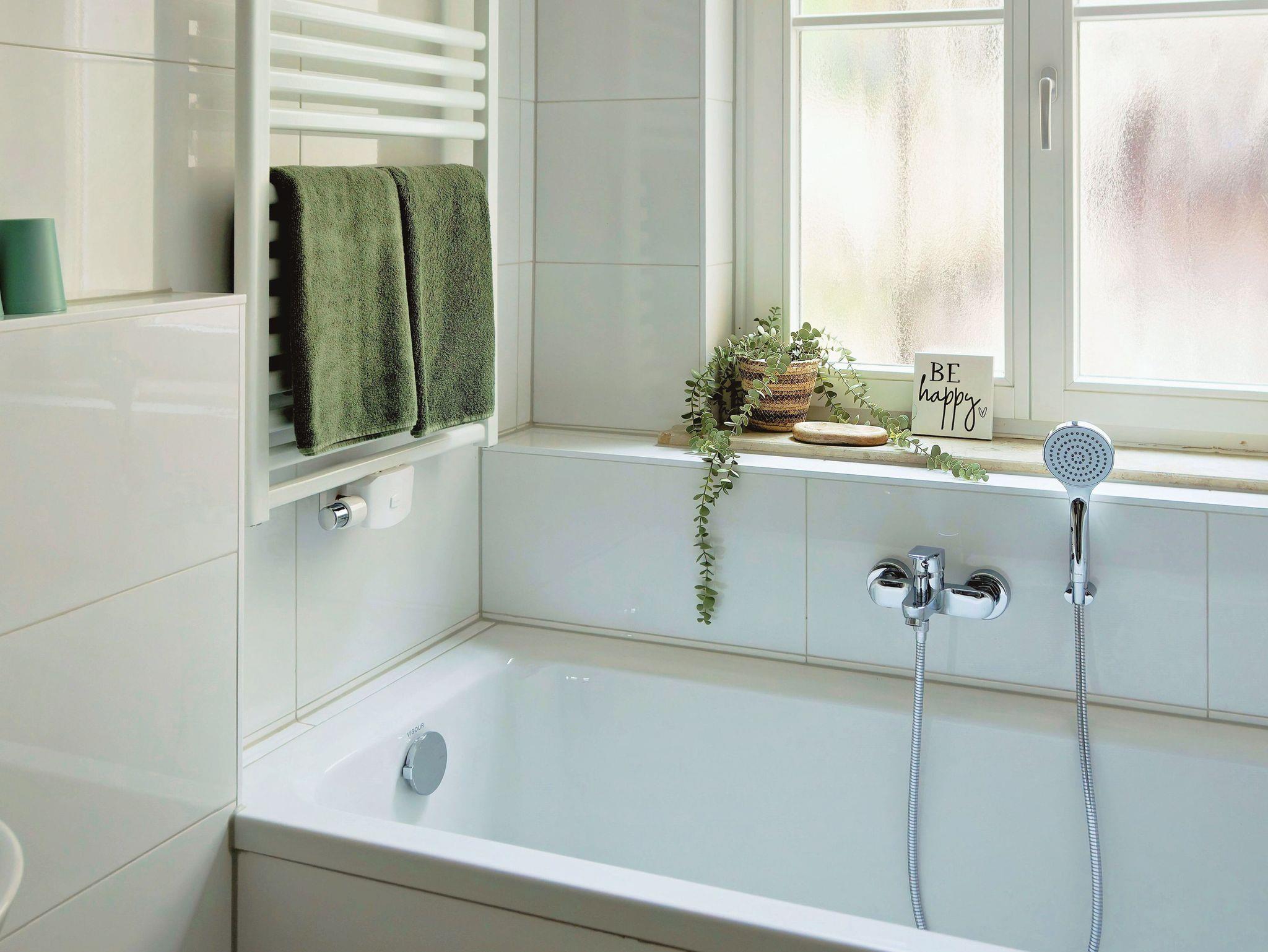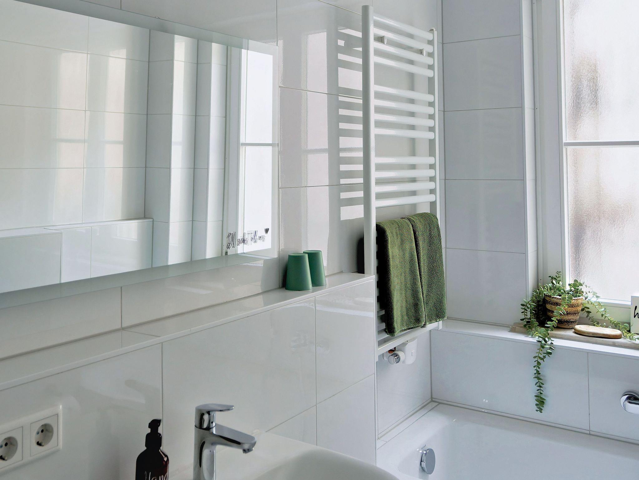 Badezimmer: Modern und lichtdurchflutetes Tageslichtbad mit einer Dusche und einer Badewanne, Föhn