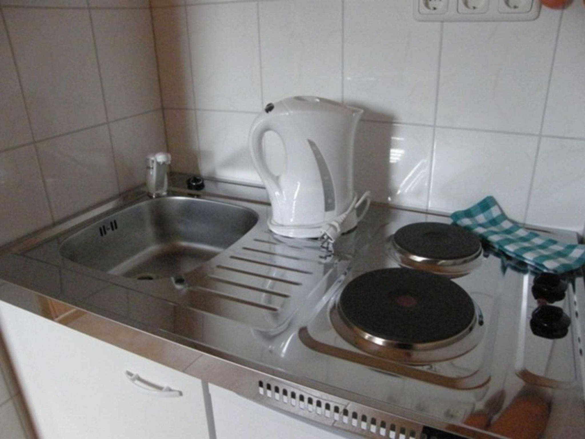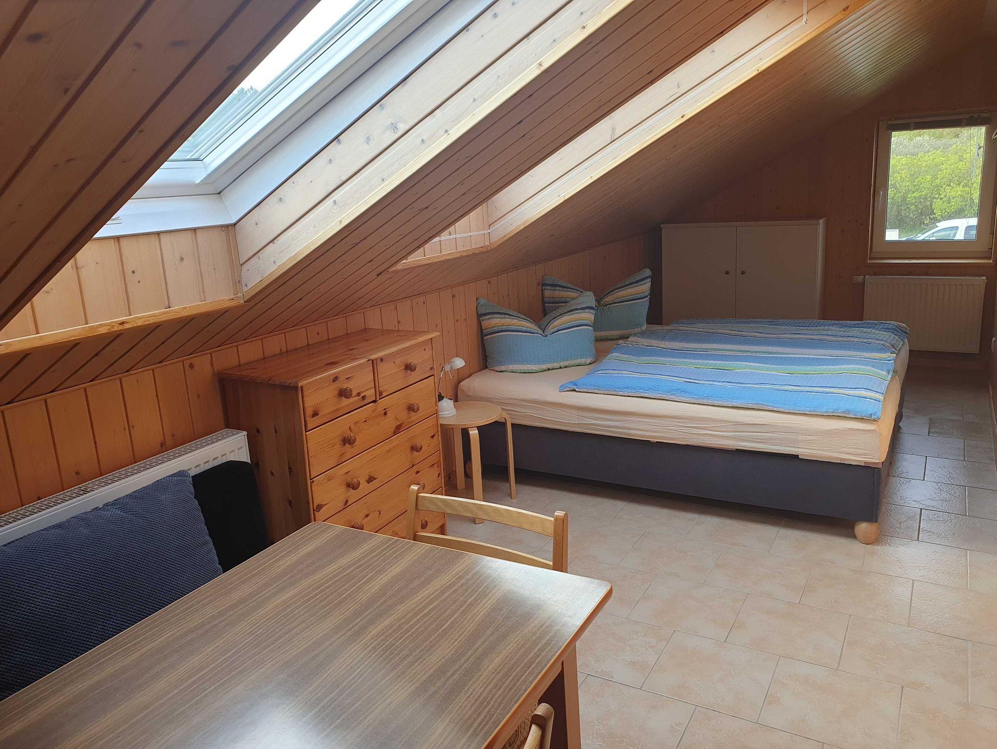 Die helle, ruhig gelegene, im Dachgeschoss befindliche Nichtraucherwohnung ist nach Südwesten ausgerichtet und am besten für zwei Personen geeignet. Für eine dritte Person ist eine Aufbettung gegen Entgelt möglich. Die Ferienwohnung ist voll gefliest, und die Wände sind mit hellem Fichtenholz getäfelt. Sie verfügt über einen Raum mit Sofa, Pantryküche, Kühlschrank mit Gefrierfach, Mikrowelle, Minibackofen, zwei Betten, SAT-TV und Spielesammlung sowie ein Bad mit Dusche und WC. Die große Wiese lädt zu sportlichen Aktivitäten, zum Sonnen und Grillen ein. Weiterhin stehen Ihnen ein kleiner Bootssteg, Gartenmöbel, eine Wäschespinne, Grill und Abstellmöglichkeiten für PKW, Fahrrad und Boot zur Verfügung. Im Mietpreis inbegriffen sind Bettwäsche, Handtücher, Geschirrhandtuch, Strom, Wasser und Heizung. Fahrräder und Boote können Sie bei uns vor Ort zum Haustarif mieten.