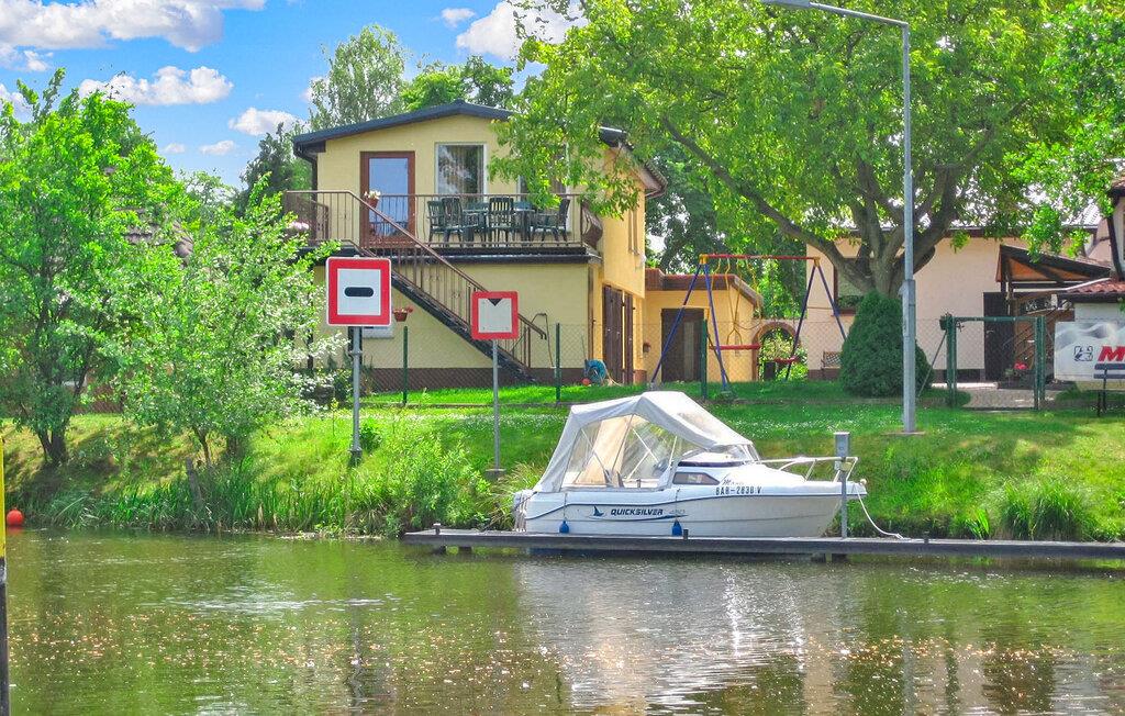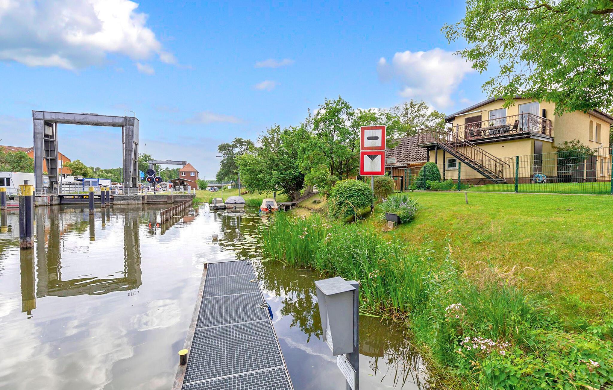 Den komfortable ferielejlighed med separat adgang ligger på øverste etage i en beboelsesejendom på en ejendom ved vandet direkte ved Müritz-Havel-kanalen (ingen privat svømmeplads). Det er udstyret med et opholdsområde (polstrede møbler, LCD TV, hi-fi, DVD), et åbent køkken (elkomfur, køleskab, mikroovn, spisebord, forskellige køkkenmaskiner), et soveværelse (dobbeltseng), et børneværelse. (køjeseng) og bruser/toilet og centralvarme. Der er en møbleret terrasse, fiskemole og grillplads til rådighed. Værten driver en marineteknologibutik og en bådudlejningsbutik separat på ejendommen. Forskellige motorbåde (med og uden kørekort) kan lejes efter aftale. Som lejer af lejligheden får du adgang til bådene de første 7 nætter. 20% rabat og for de næste 7 nætter. 25 %. Den samlede pris inkluderer slutrengøring og vandforbrug. Energiforbrug afregnes på stedet. Du kan medbringe dit eget sengelinned og håndklæder eller leje dem. Mirow er underlagt turistskat. Mirow, den lille by ved søen af samme navn, er et turistcenter i Mecklenburgs lille sølandskab. Ideelle forhold til al vandsport. Attraktioner er slotsøen med beboelsespaladset og Johanneskirken samt den idylliske Love Island. I byen: passagerbådtur, badestrand, båd- og cykeludlejning. Ferielejligheden ligger direkte ved Müritz-Havel-kanalen.