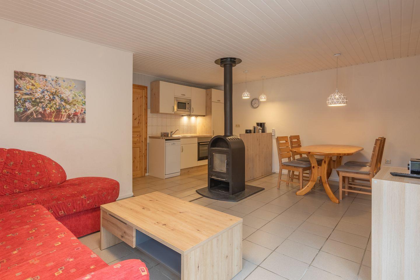 Die Doppelhaushälfte bietet Platz für bis zu 4 Personen auf einer Etage mit 2 Schlafzimmern, offenem Wohn- und Essbereich, Küchenzeile, Terrasse und Abstellraum.