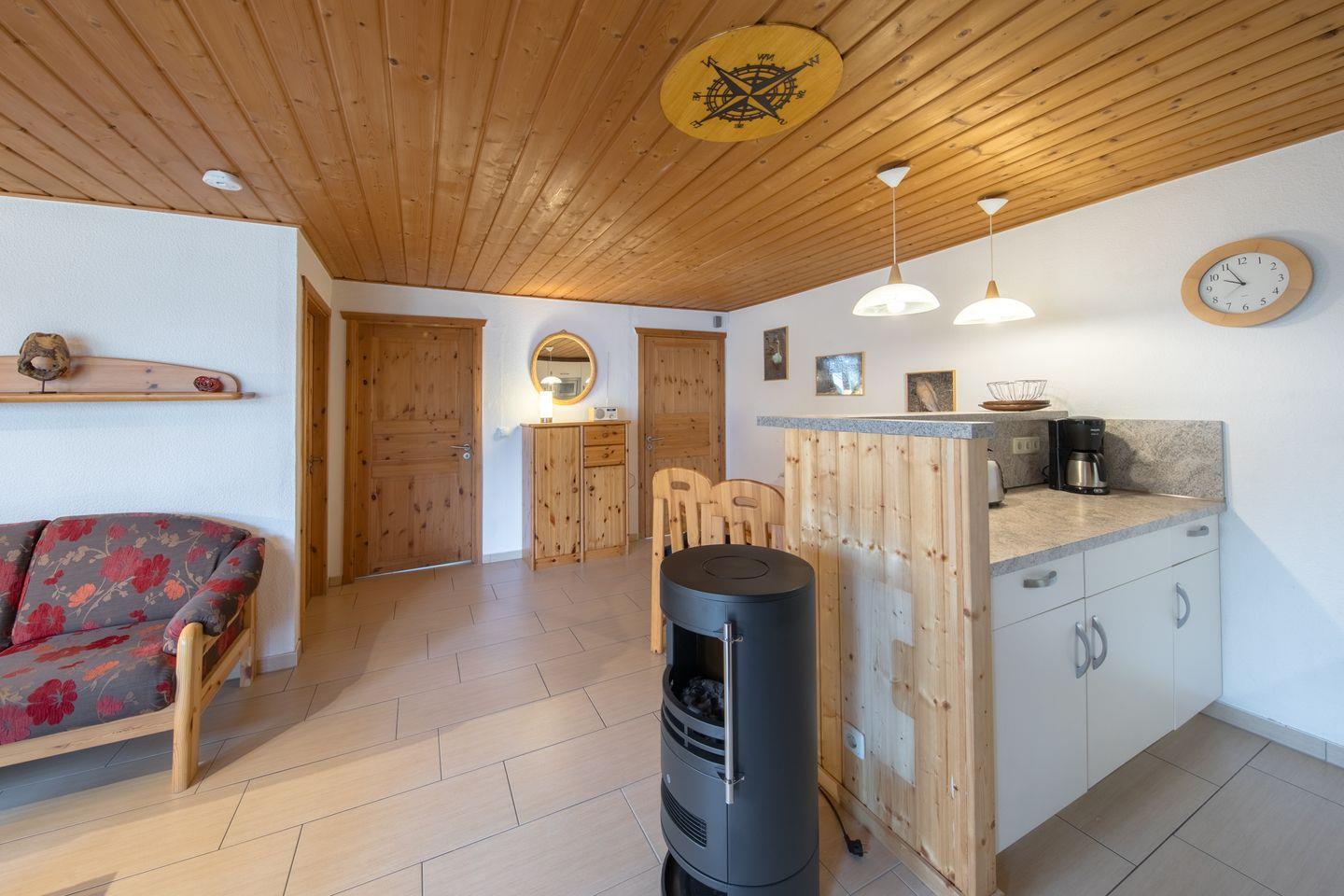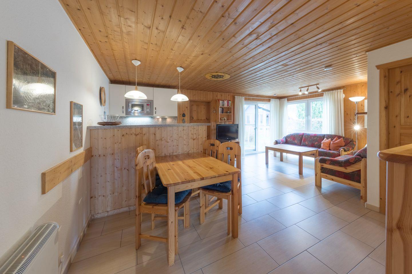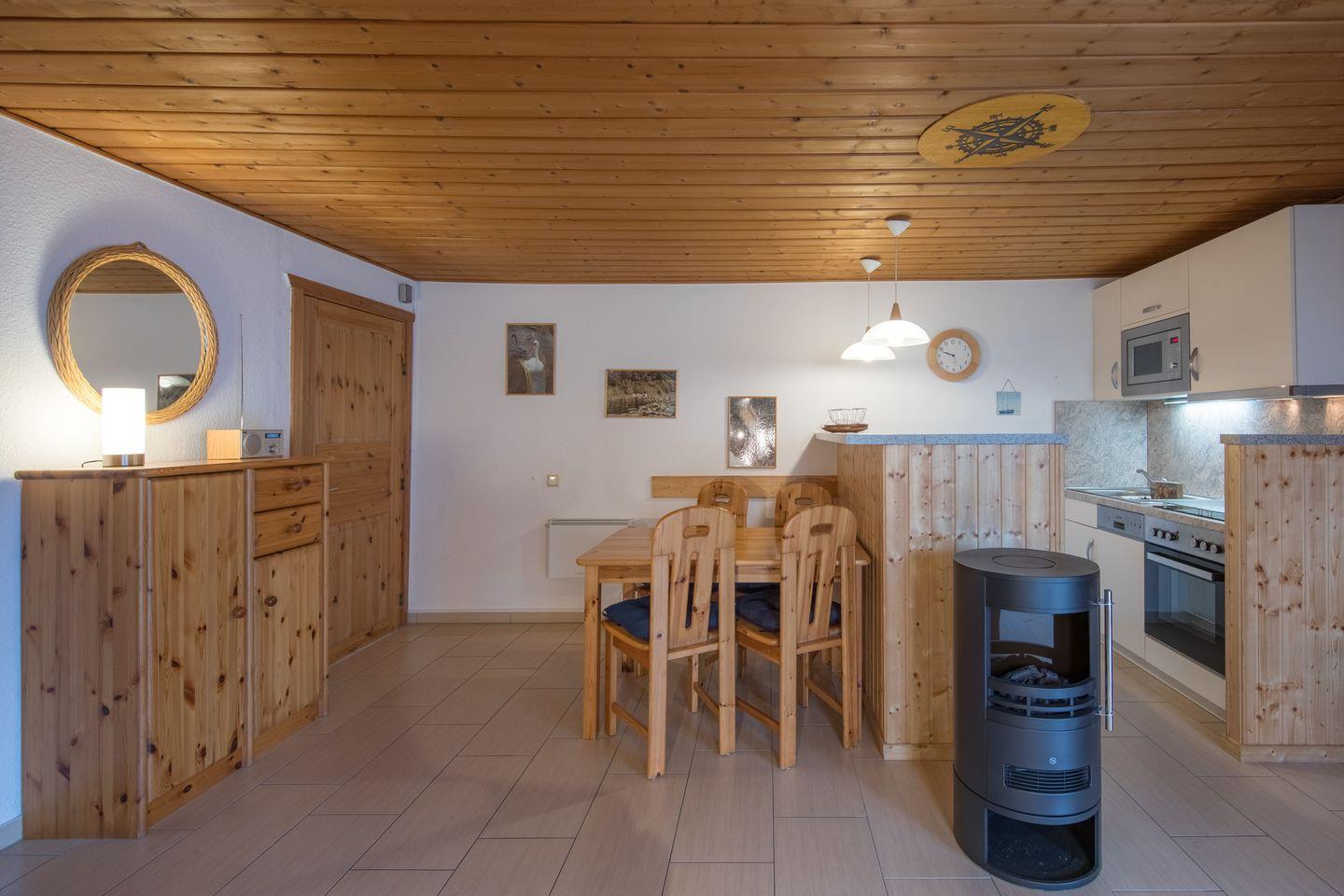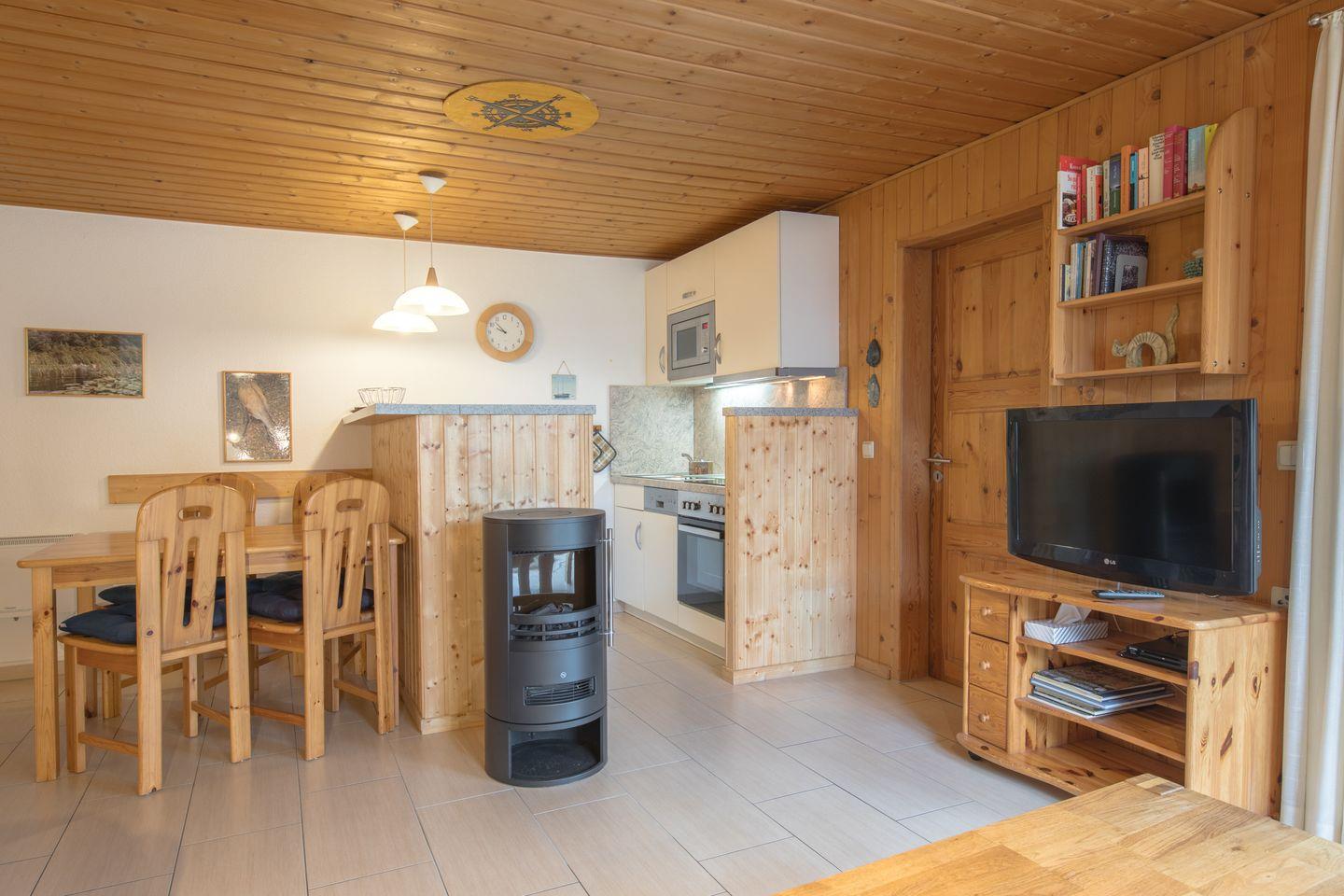 Die Doppelhaushälfte bietet Platz für bis zu 4 Personen auf einer Etage mit 2 Schlafzimmern, offenem Wohn- und Essbereich, Küchenzeile, Terrasse und Abstellraum.