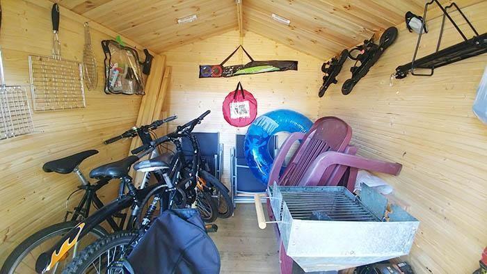 - einen Geräteschuppen mit: Grill, weiteren Gartenstühlen, Liegestuhl und Sonnenliege,