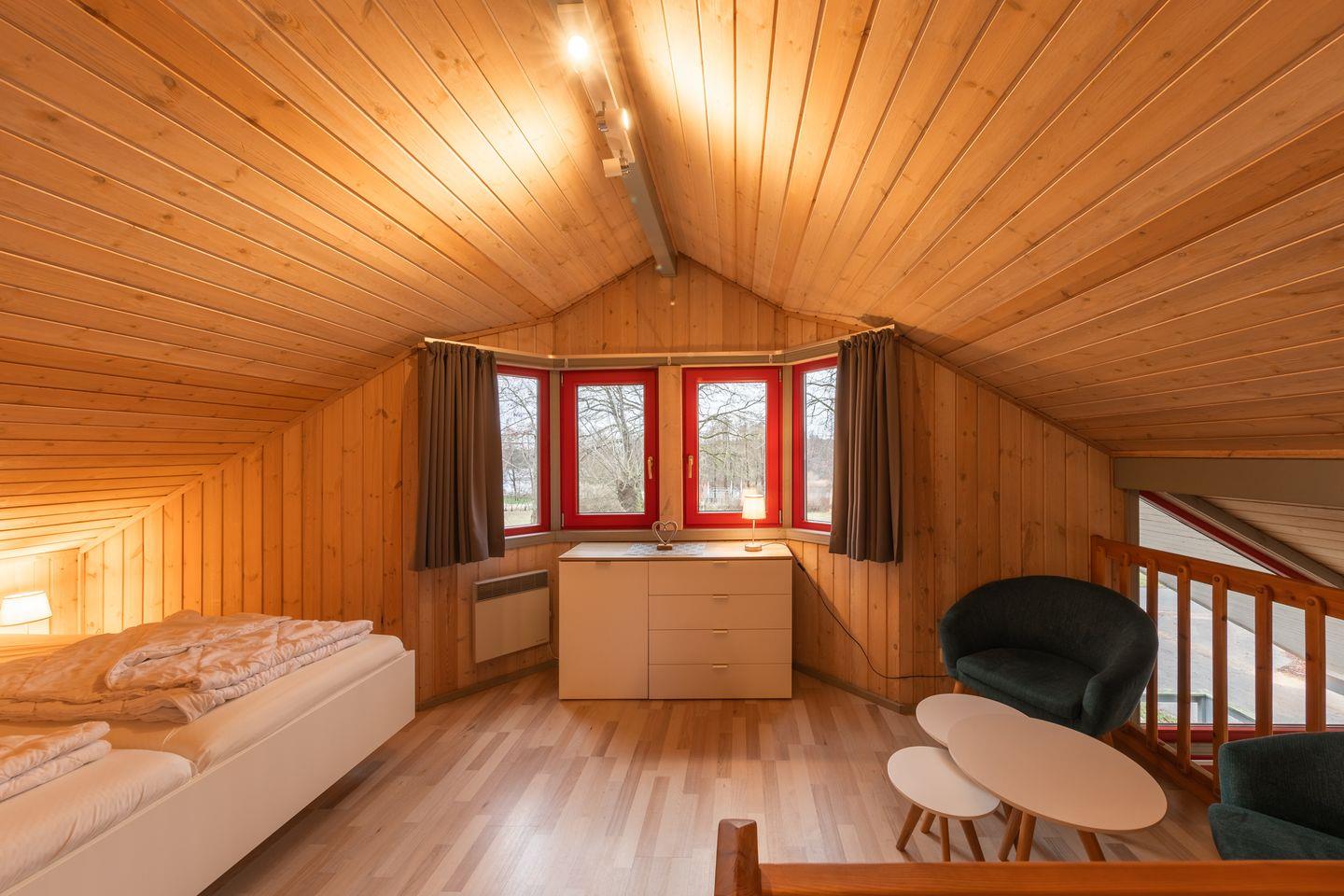 Das Ferienhaus im skandinavischen Stil bietet Platz für bis zu 6 Personen auf 2 Etagen mit 2 Schlafzimmern und offener Schlafgalerie, Wohn-/Essbereich, Einbauküche, Sauna, Terrasse, Abstellraum und Pkw-Stellplatz. Energiekosten werden nach Verbrauch abgerechnet.