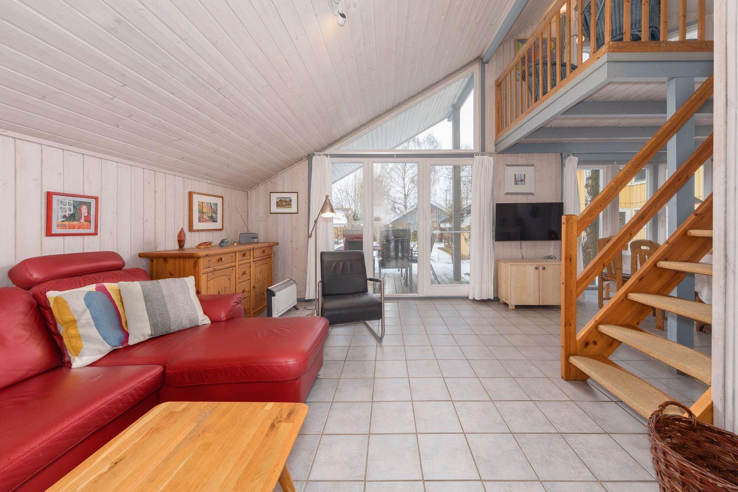 Das Ferienhaus im skandinavischen Stil bietet Platz für bis zu 6 Personen auf 2 Etagen mit 2 Schlafzimmern und offener Schlafgalerie, Wohn-/Essbereich, Einbauküche, Sauna, Terrasse, Abstellraum und Pkw-Stellplatz. Energiekosten werden nach Verbrauch abgerechnet.