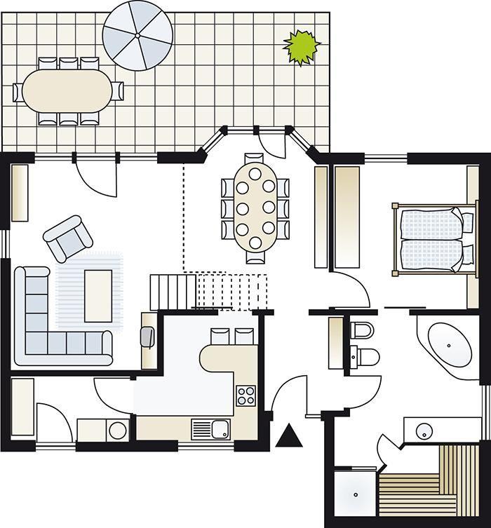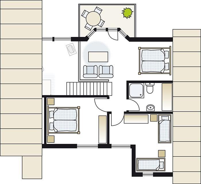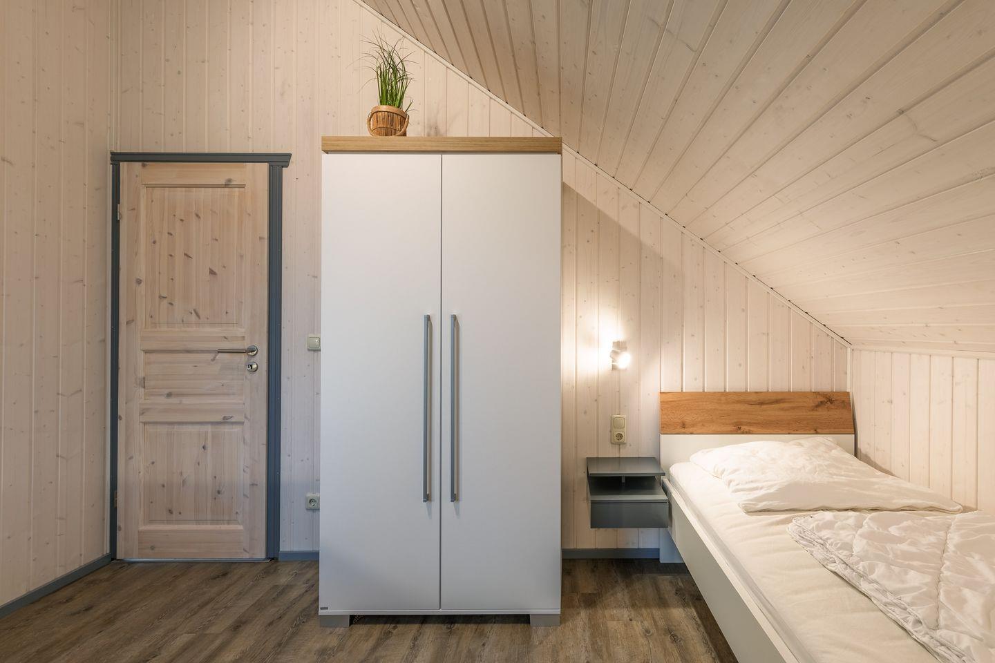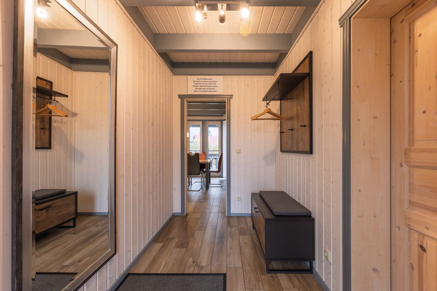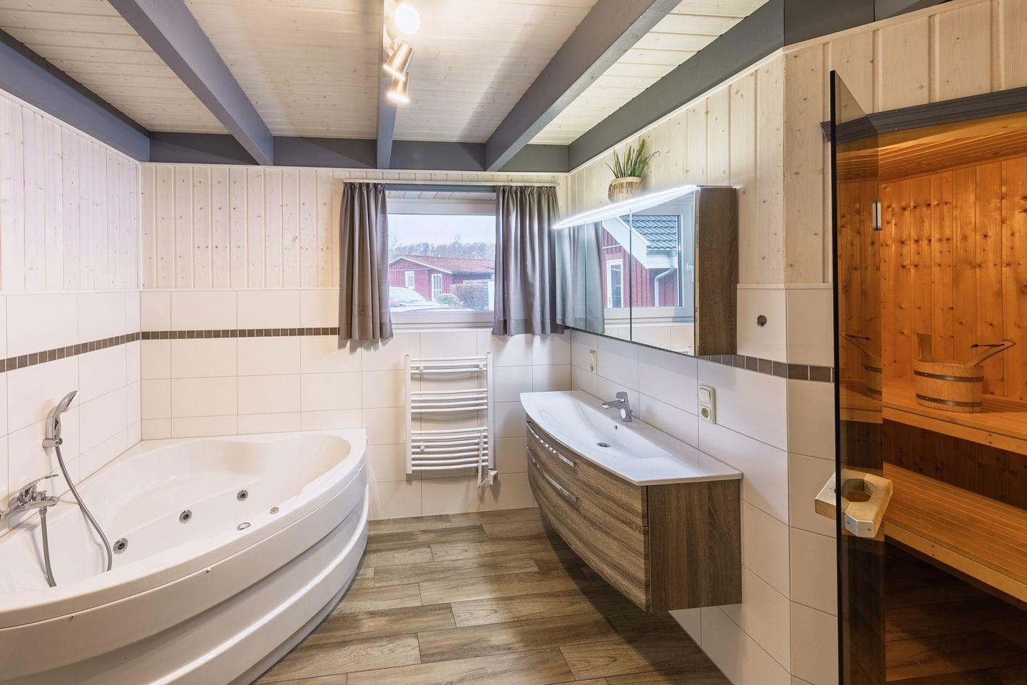 Das Ferienhaus im skandinavischen Stil bietet Platz für bis zu 8 Personen auf 2 Etagen mit 3 Schlafzimmern und offener Schlafgalerie, 2 Badezimmern, Wohn-/Essbereich, Einbauküche, Sauna und Whirlpool, Terrasse, Abstellraum, 2 Pkw-Stellplätze und Terrasse.