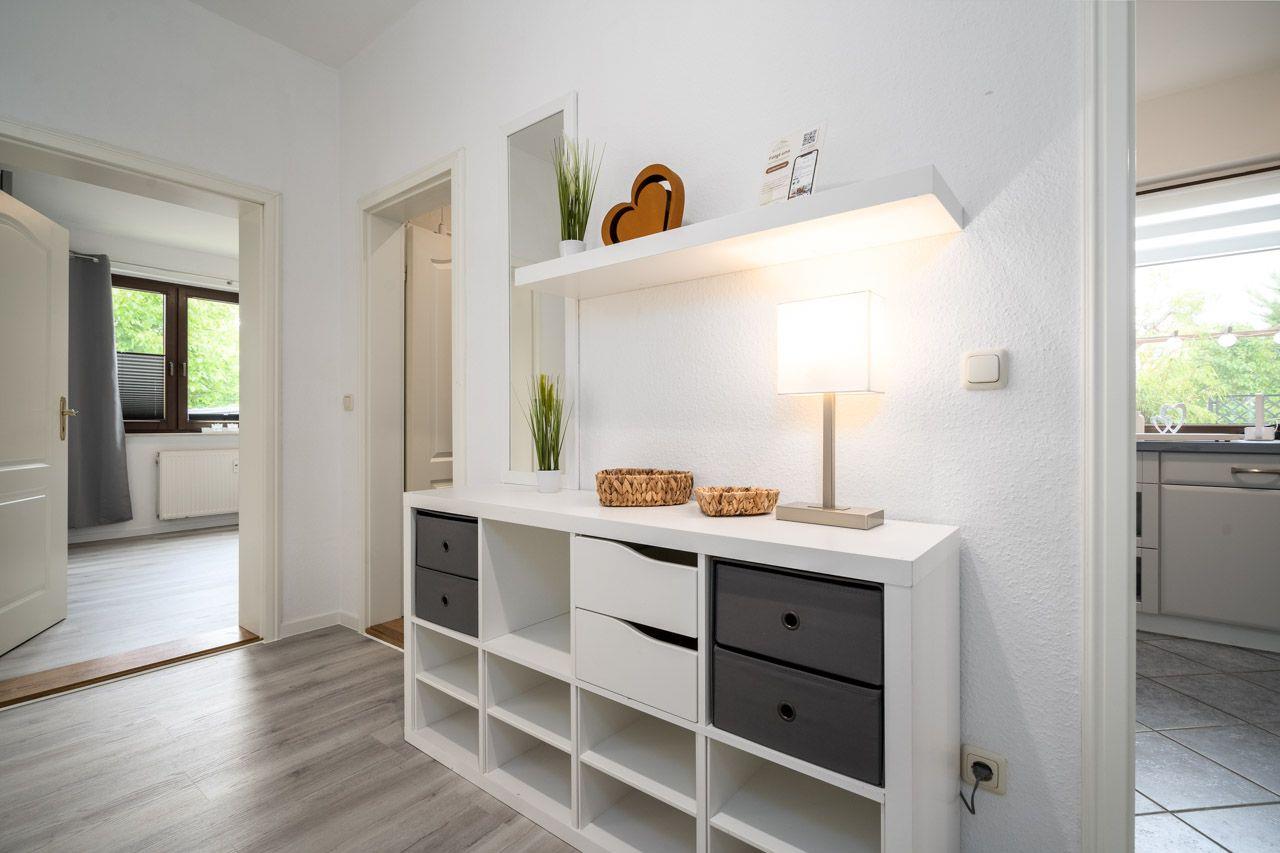 Dieses moderne 100 m² Appartement in einem 3 Parteien-Haus mit Küche, 2 Schlafzimmer und ein Wannenduschbad ist gut geeignet für max. 4 Erw. + 2 Ki. (Kinderreisebett und -stuhl stehen kostenfrei zur Verfügung). Die Küche ist komplett ausgestattet - Geschirrspüler, Kühlschrank, Gefrierschrank, Backofen, Kaffeemaschine und Toaster und Essbereich, u.v.m.. Das Wohnzimmer verfügt über ein gr. Schlafsofa, Insekten- und Sichtschutz, ein großer TV und elektrischer Kamin. WLAN, Waschmaschine, Trockner und eine möblierte Terrasse mit Grill und ein möblierter Balkon (See- oder Gartenblick) runden das ganze Angebot ab. Ihr eigener Parkplatz befindet sich auf dem Grundstück - die Fahrräder können im Keller oder in der Garage abgestellt werden. Zum Appartement gehören ebenfalls ein 2-er Kanu und 2 SUP´s ind Abstimmung mit anderen Gästen.